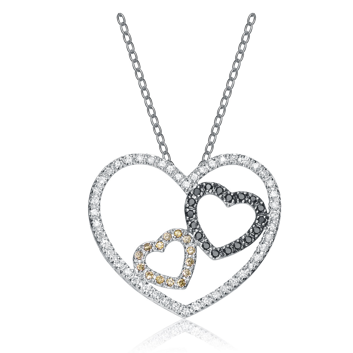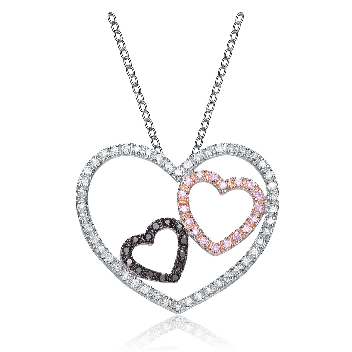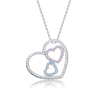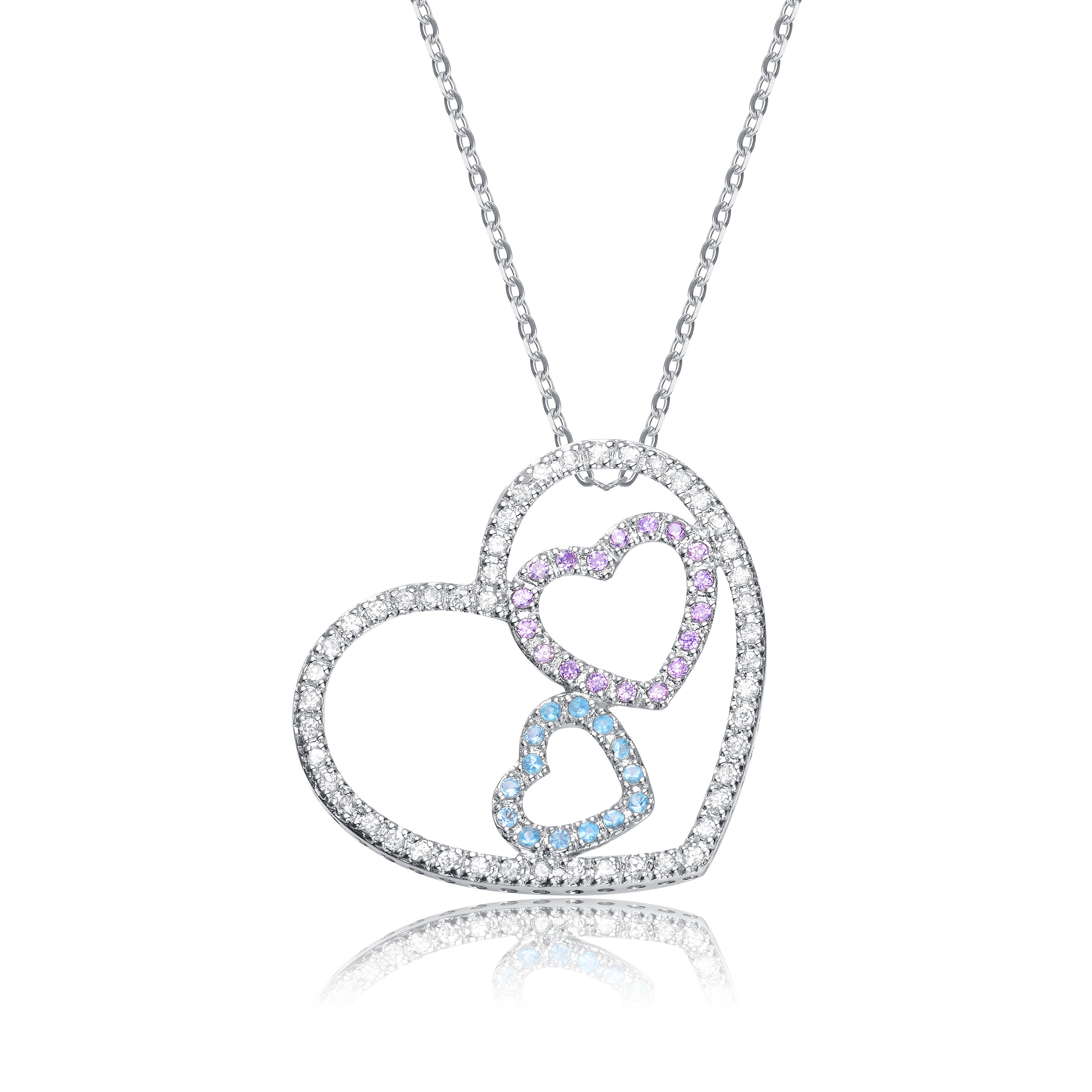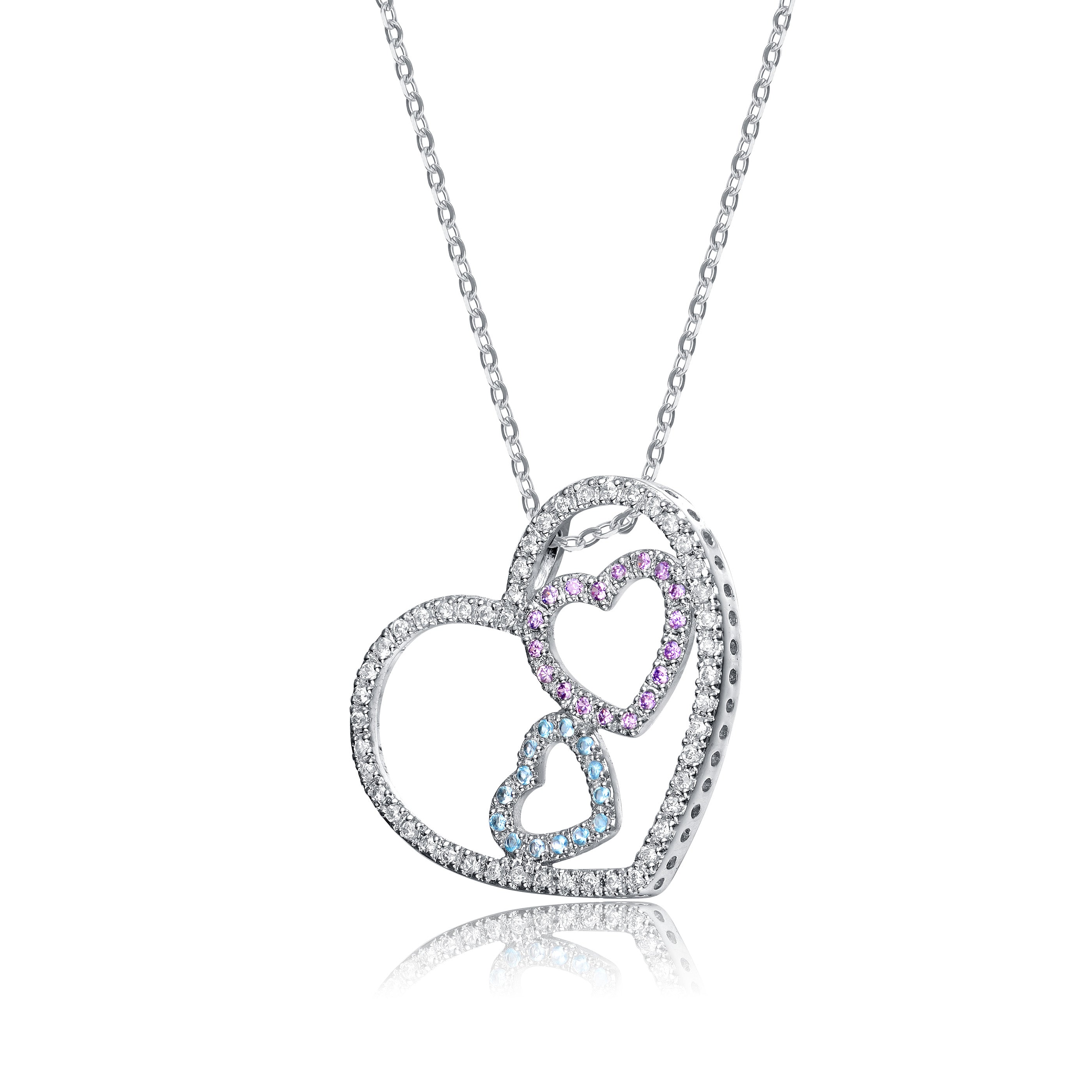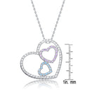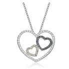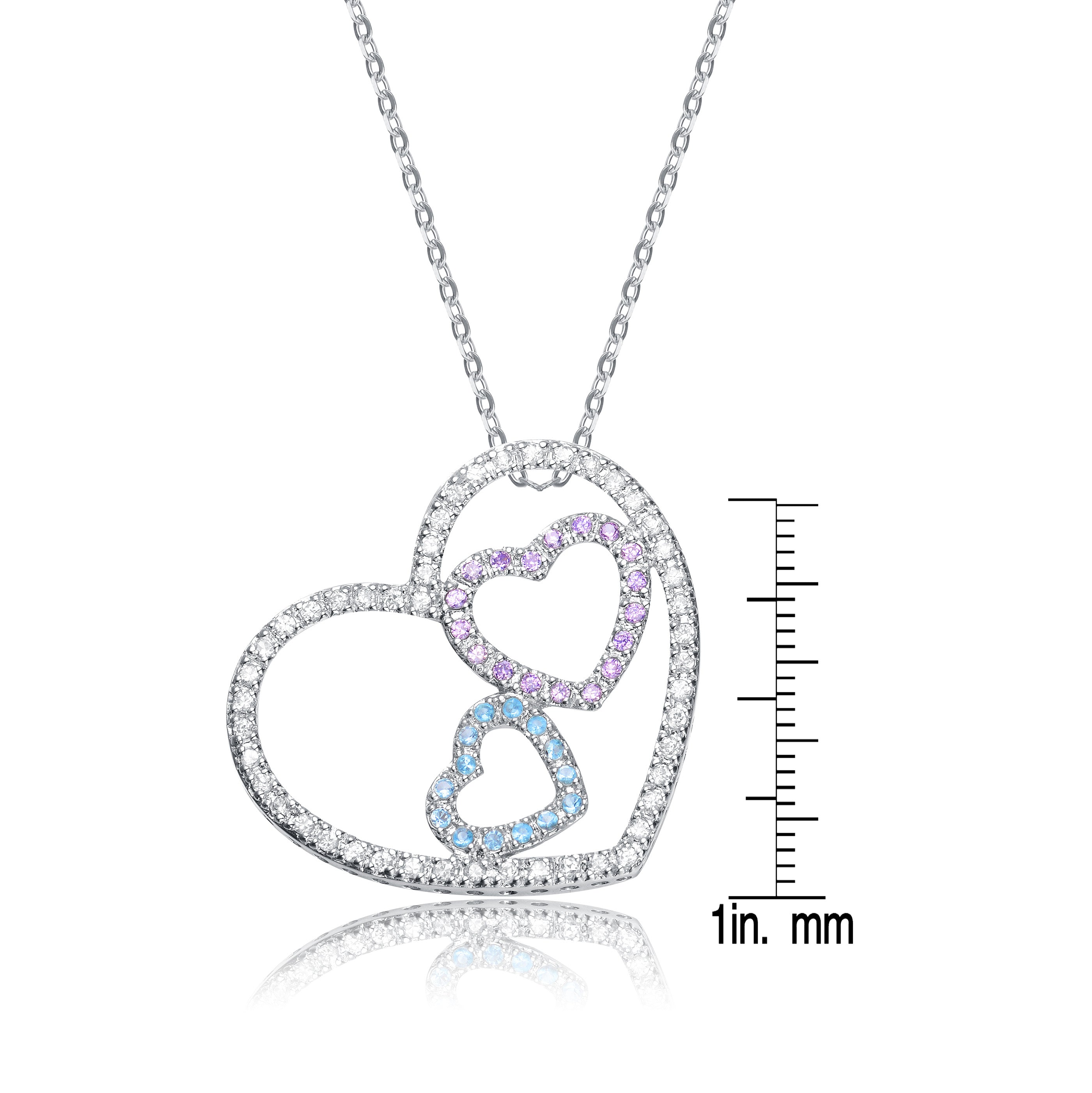Three different open heart shapes are encrusted with cubic zirconia stones for a fashion forward sterling silver necklace. This necklace is ideal for dressing up casual styles.