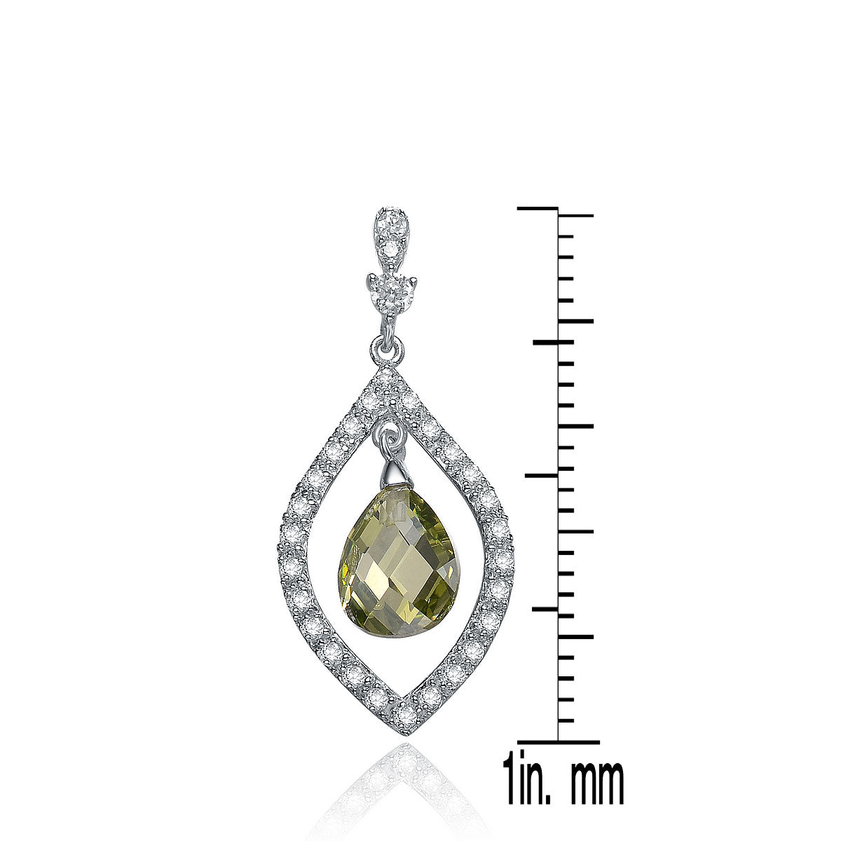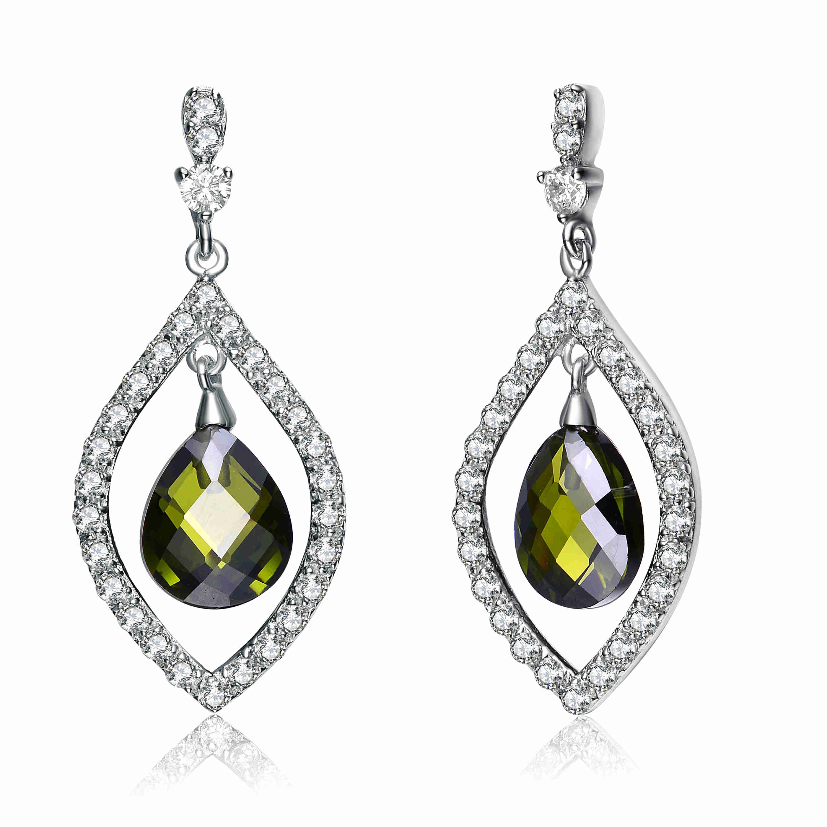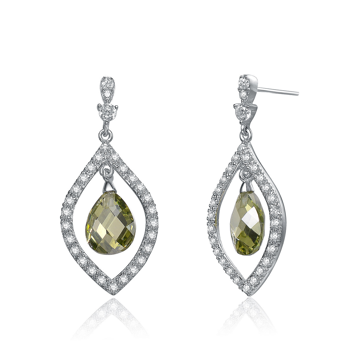 These pear shape dangle earrings are decoraed with green pear-cut cubic zirconia stones with white smaller round stones. Crafted of .925 sterling silver, the earrings secure with butterfly clasps.