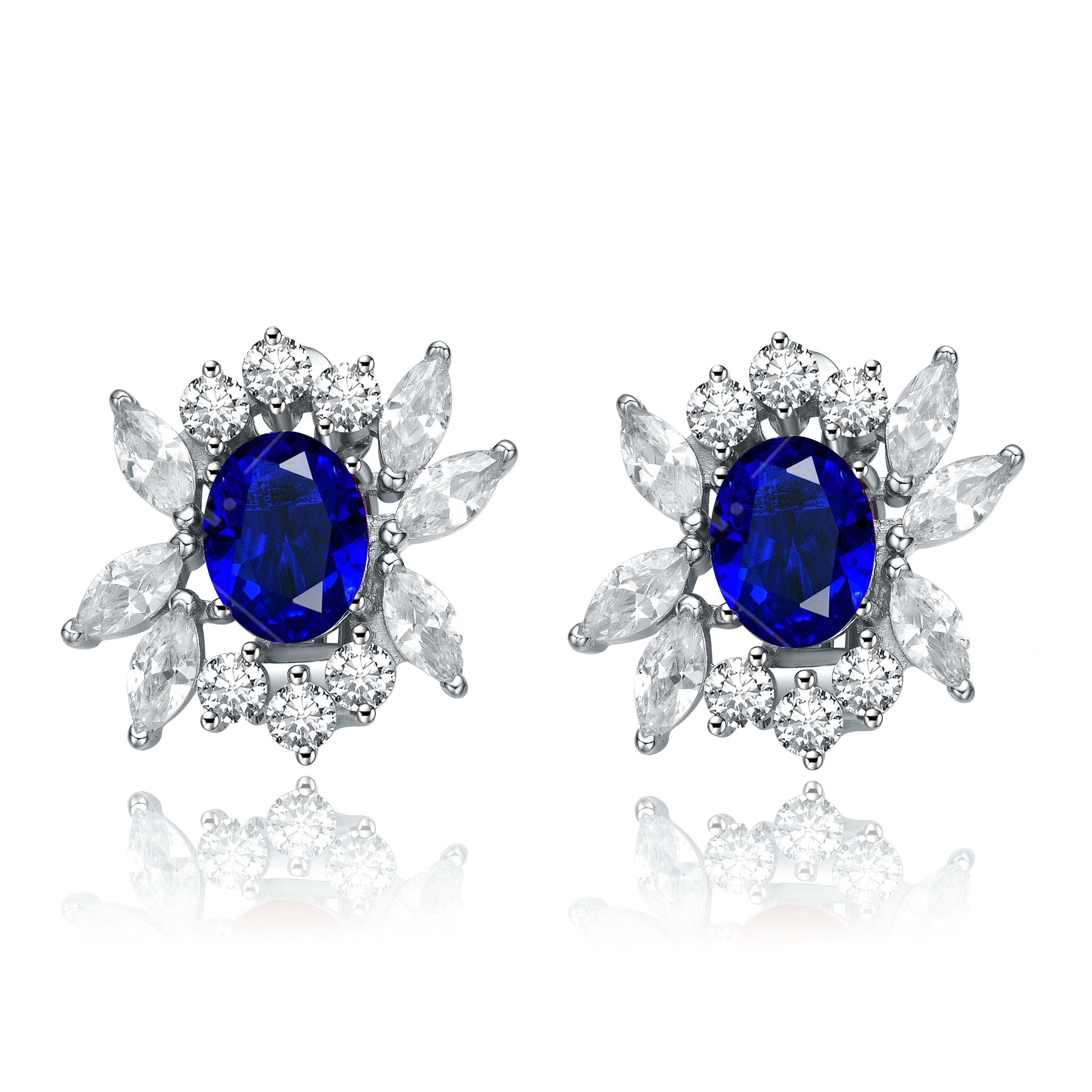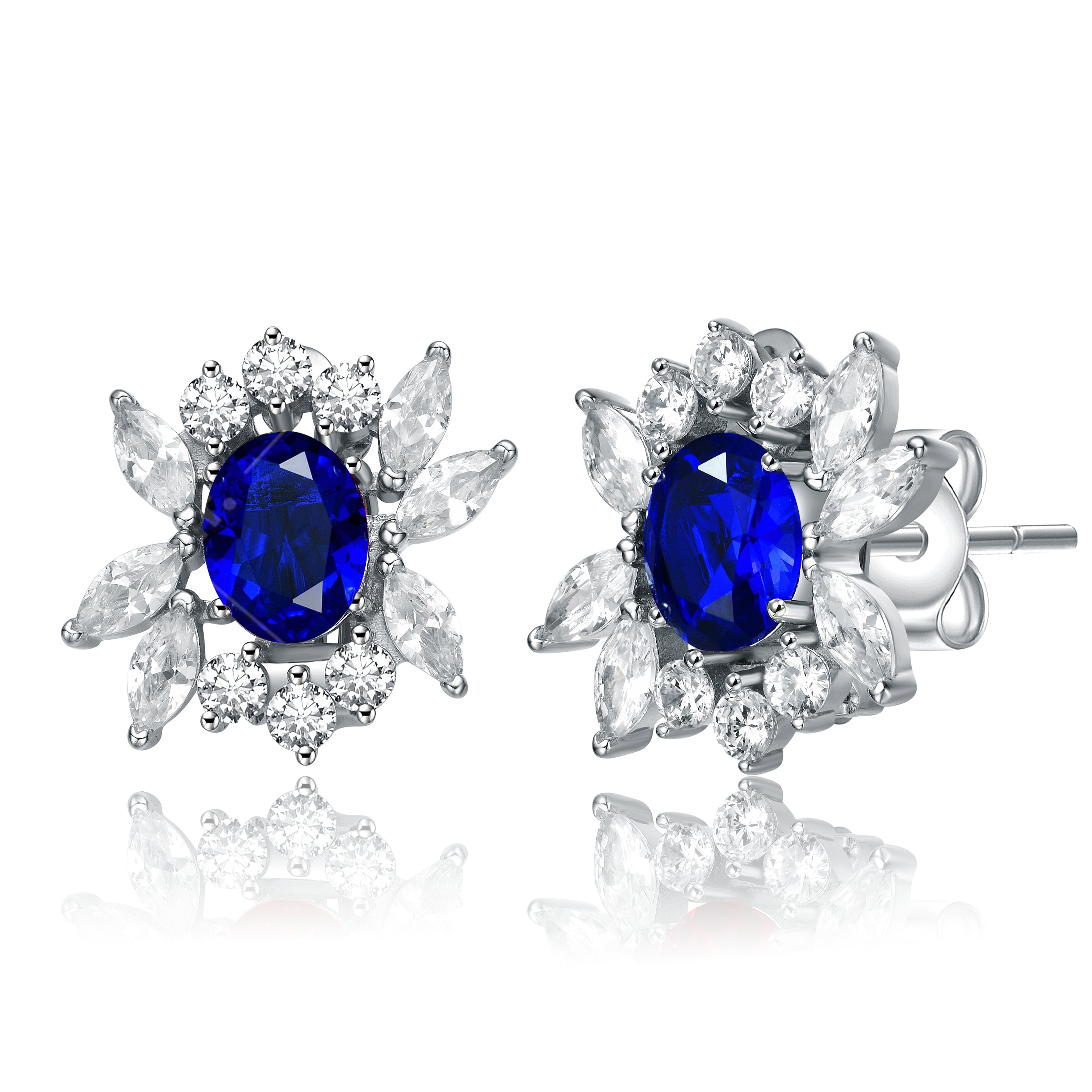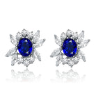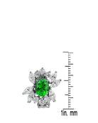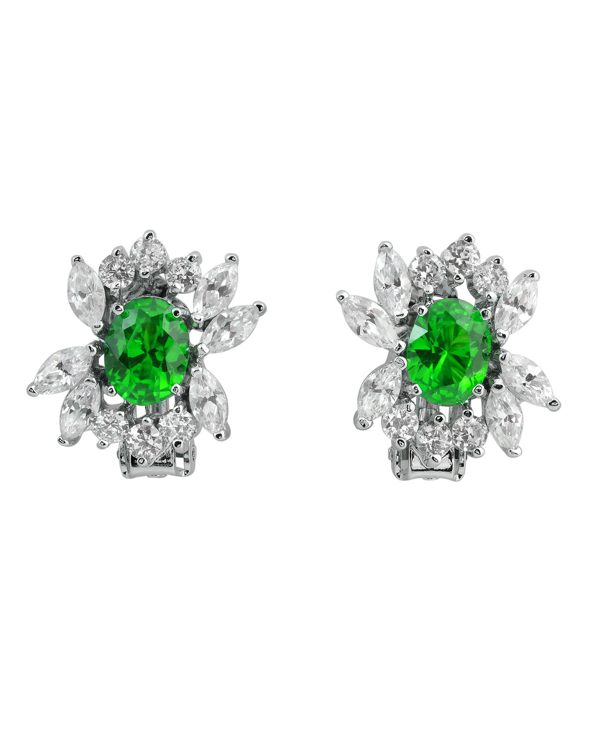 Sensational White Gold Plated Sterling Silver Earrings. Unique piece of jewelry with Clear Cubic Zirconia around and Emerald center stone set in a cluster you will absolutely adore. These gifting earrings are secured with butterfly clasps. Available in ruby and sapphire cubic zirconia.