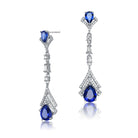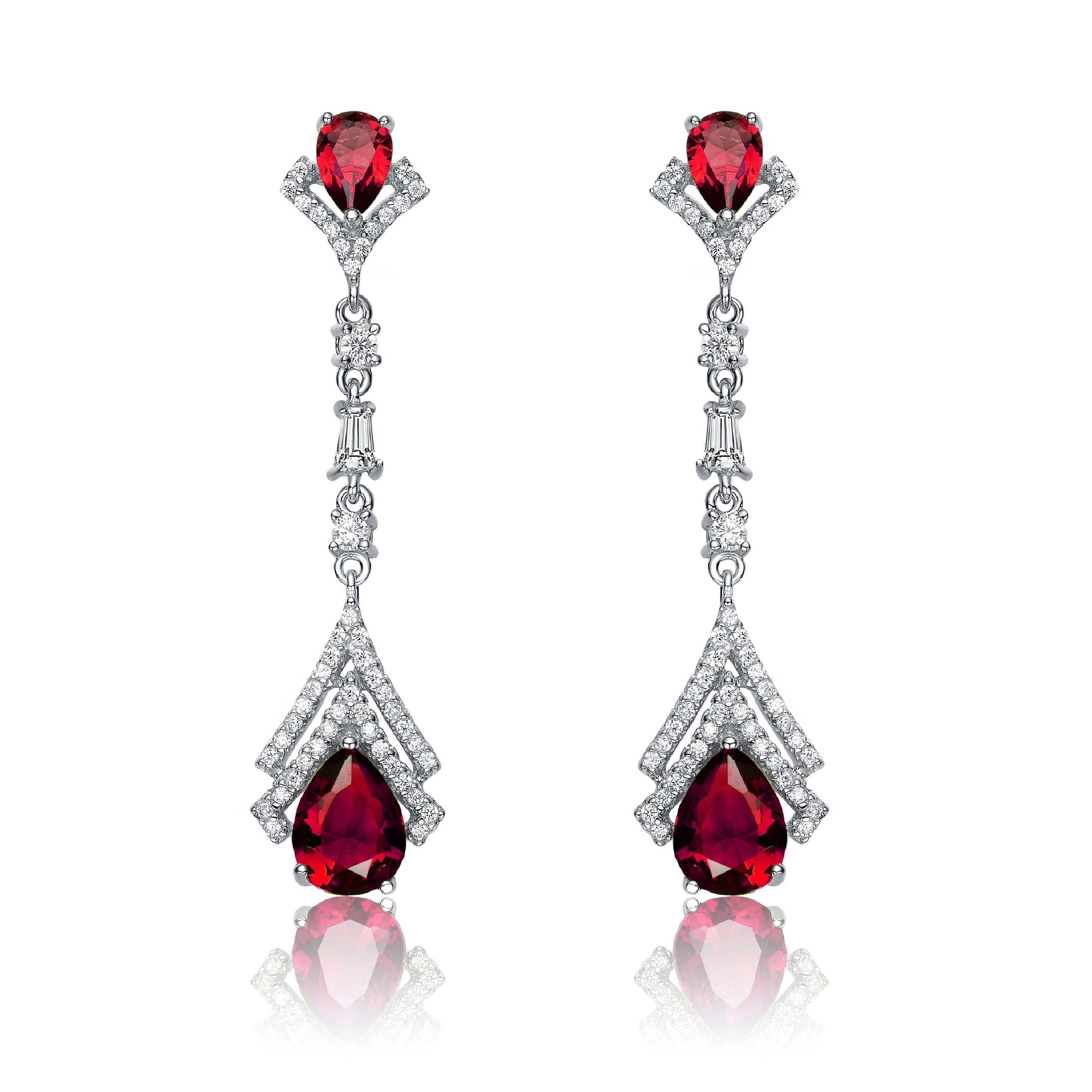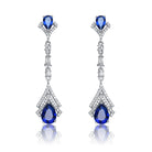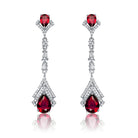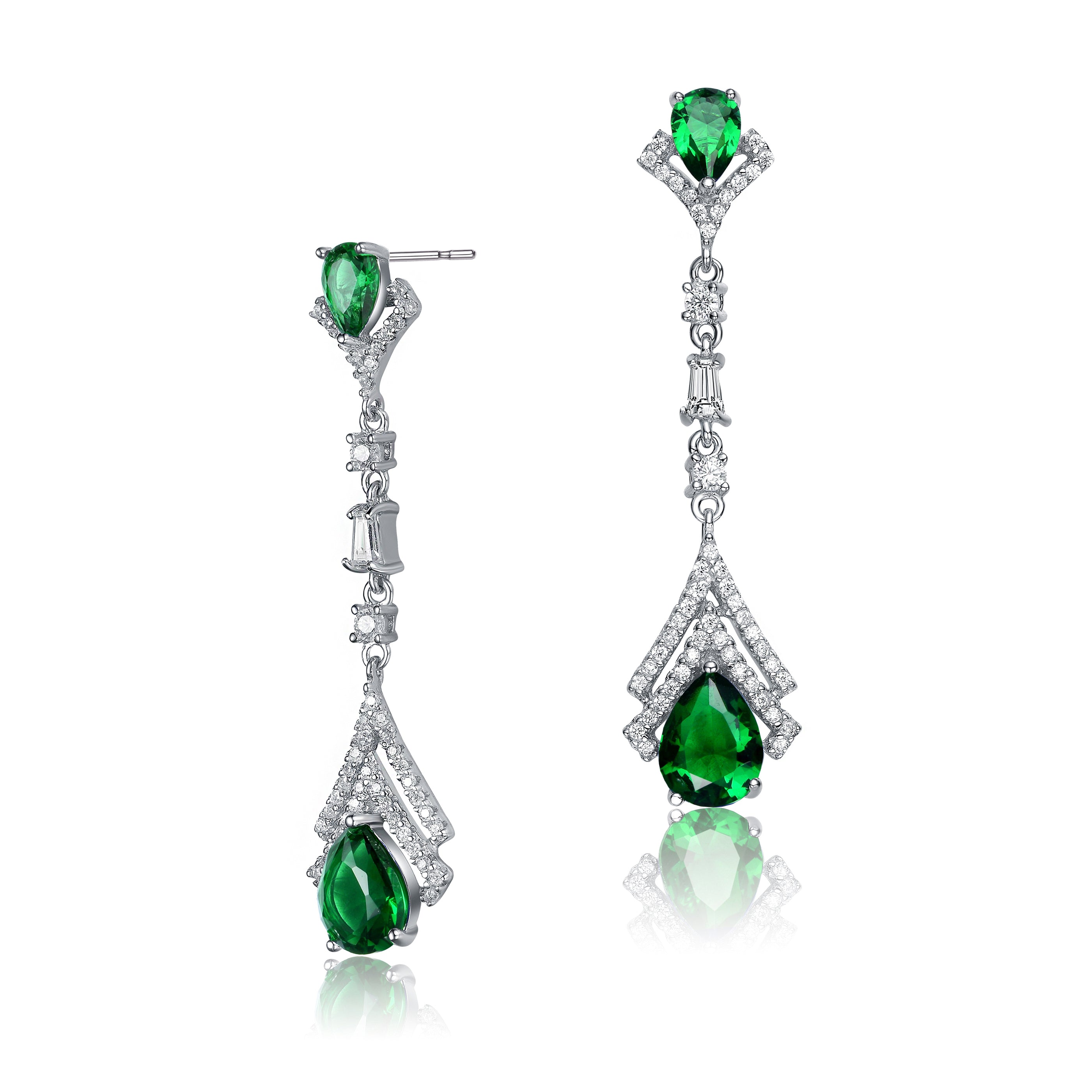 Elegant Sterling Silver with Rhodium Plated Drop Earrings. These earrings feature large pear Emrald green Cubic Zirconia on the bottom, accented by two clear round Cubic Zirconia stones set above and upper part made out of medium pear shaped Emerald green Cubic Zirconia stone also accented by small clear round Cubic Zirconia stones. Crafted in Sterling silver with Rhodium plated and secure with butterfly clasp. Add an additional style to your look everytime you wear these earrings. Available in multiple stone colors