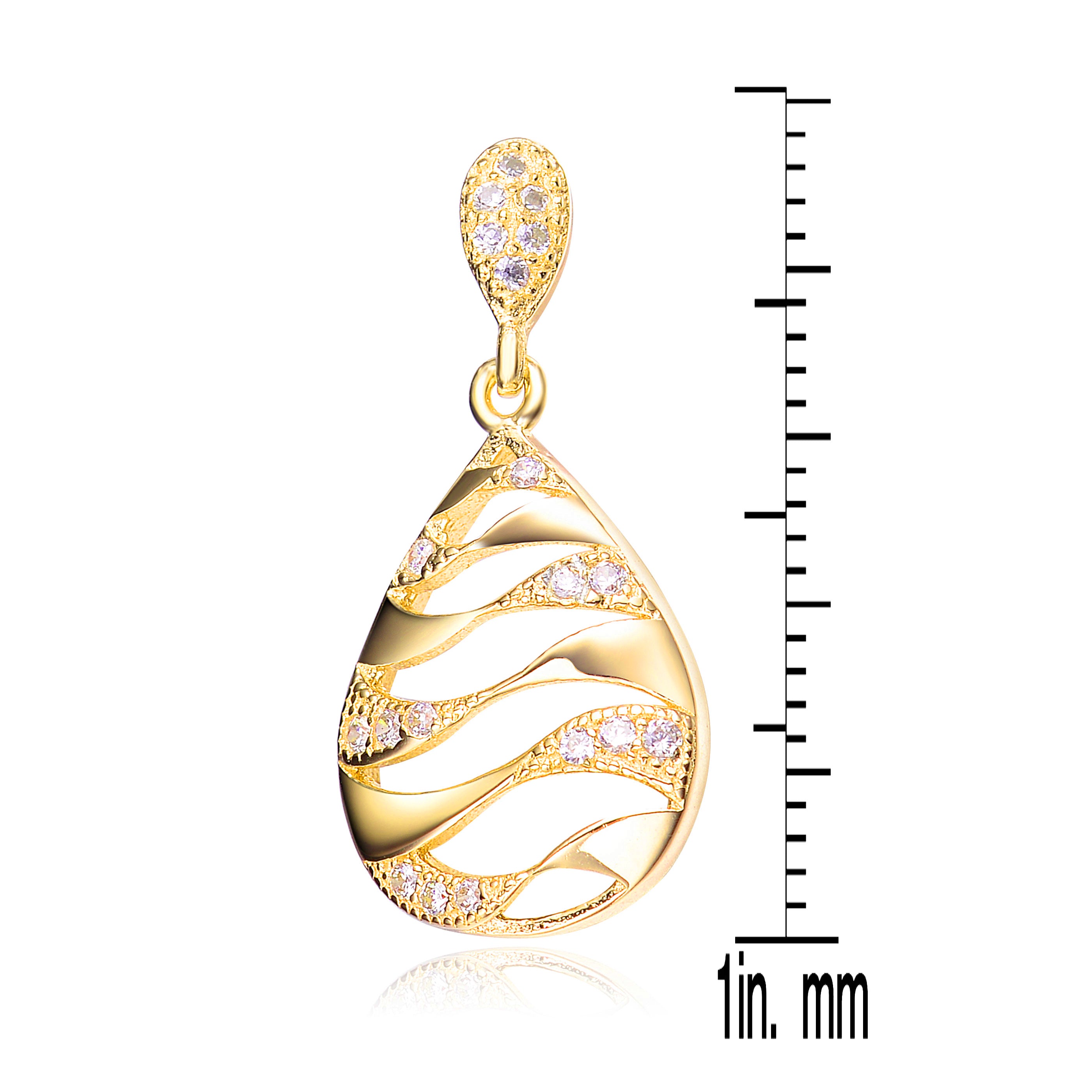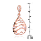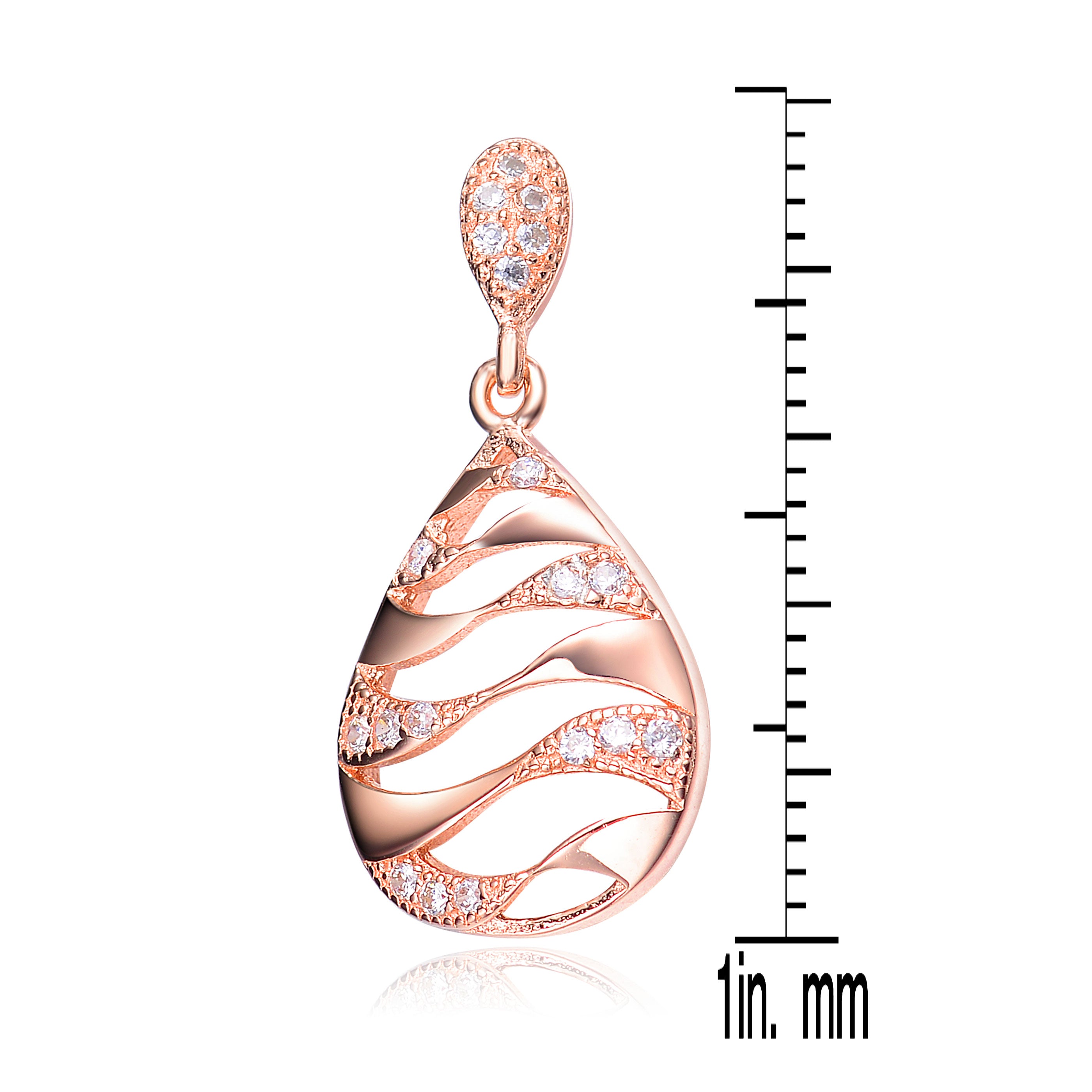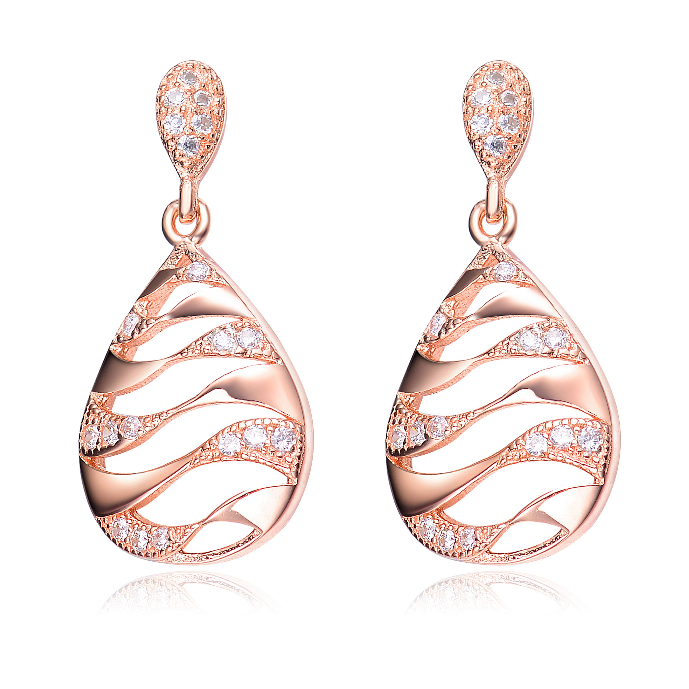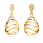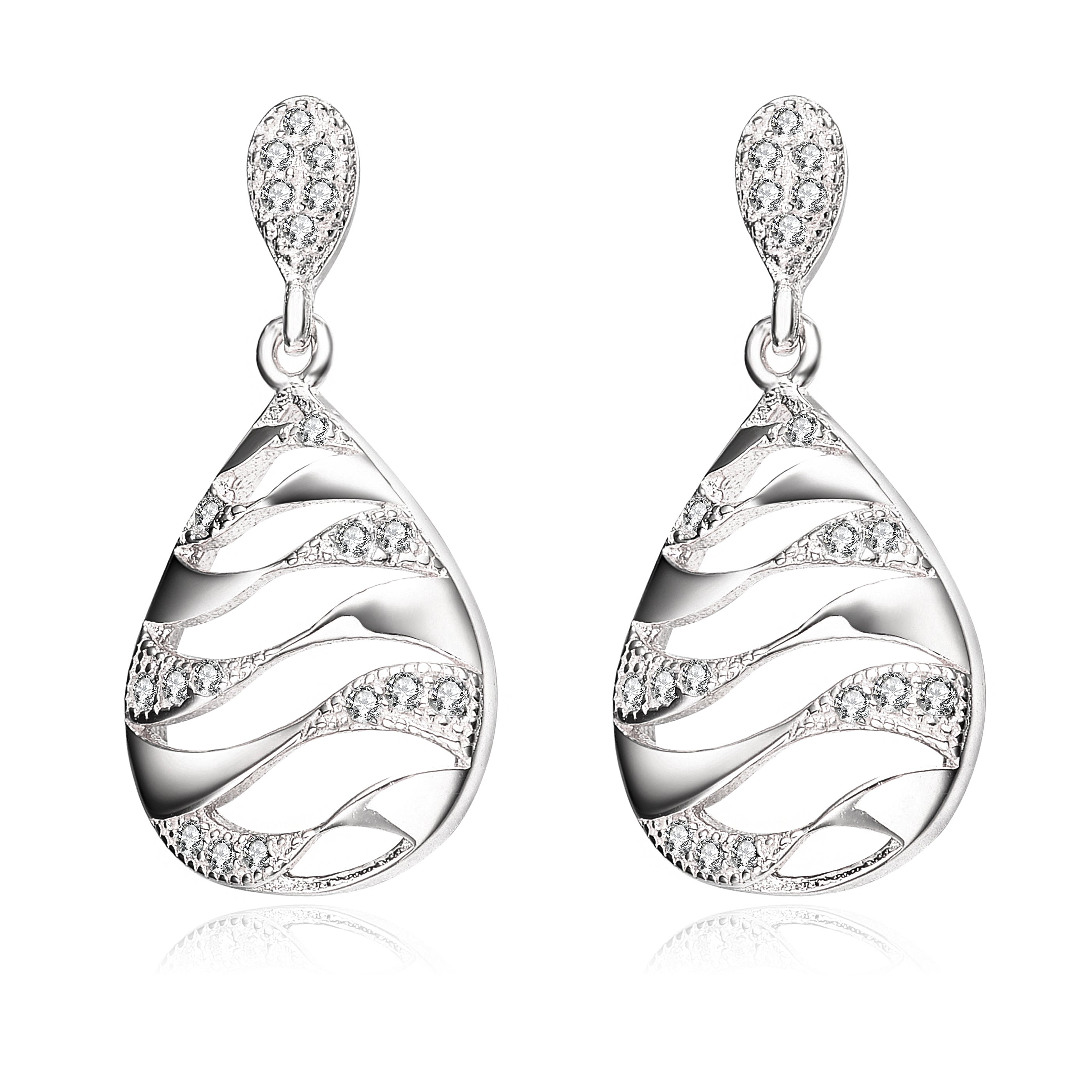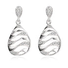 Elegant and timeless, these sterling silver drop earrings feature a captivating teardrop design adorned with dazzling clear cubic zirconia. The wave-like patterns enhance their brilliance, offering a refined yet versatile appeal. The top oval section is also encrusted with sparkling stones, creating a seamless blend of sophistication and charm. Available in three stunning variants—18k rose gold plating for a warm, romantic glow, white gold plating for a sleek, modern touch, and 14k gold plating for a rich, classic elegance—these earrings elevate any look with effortless luxury.