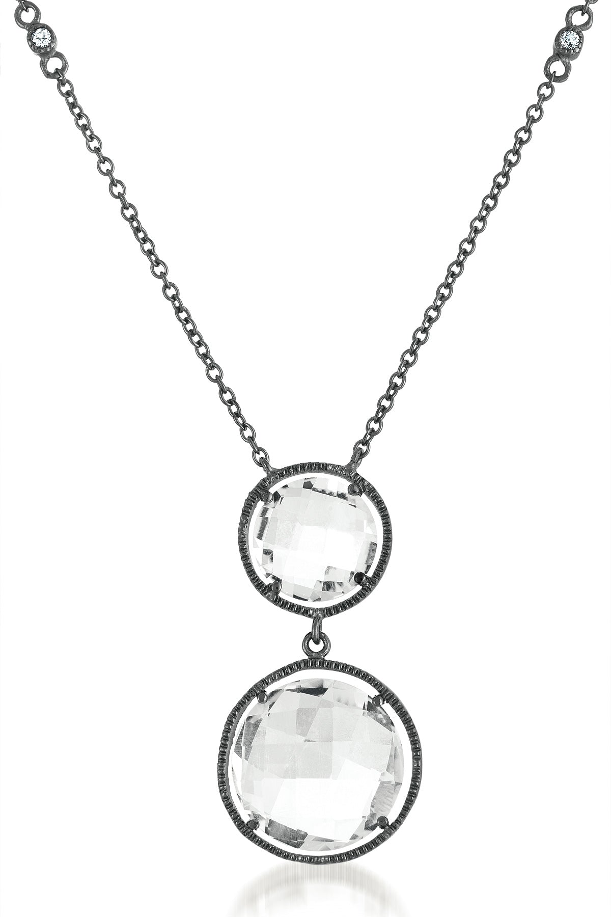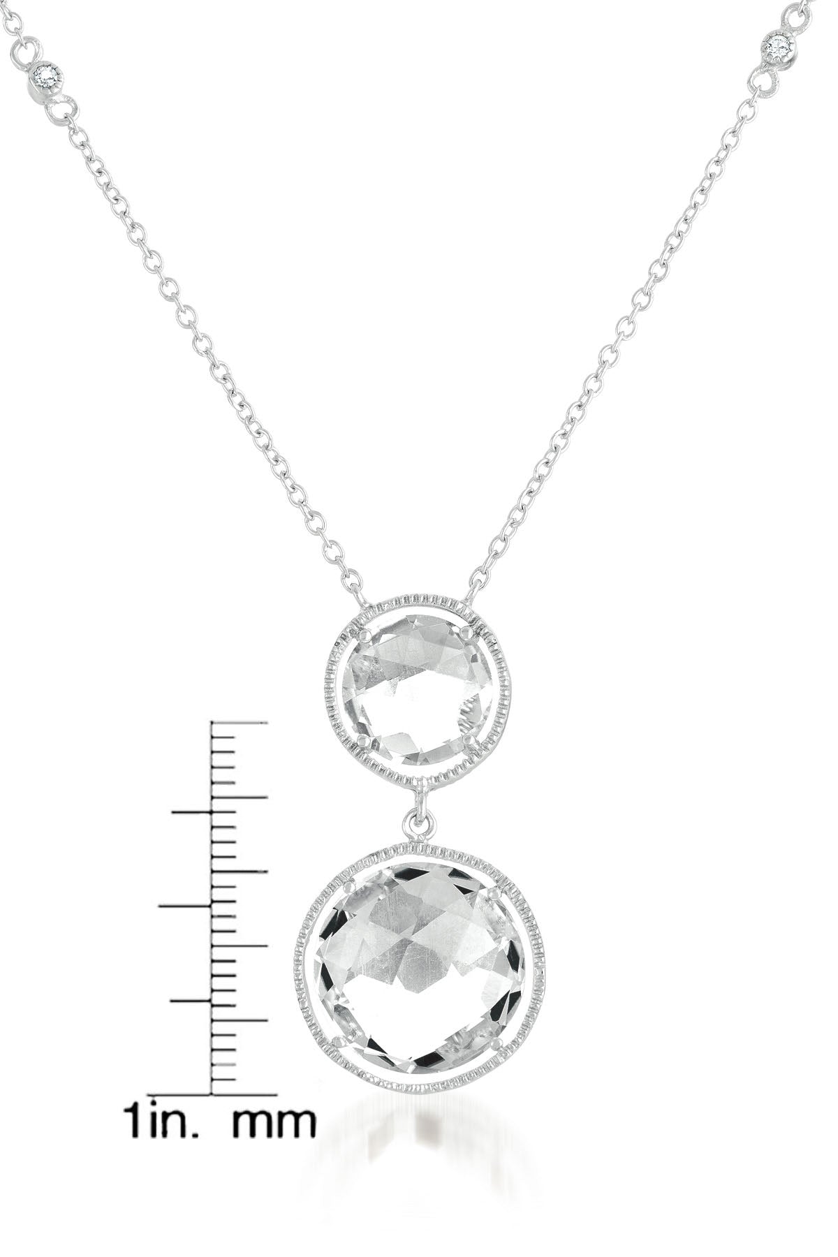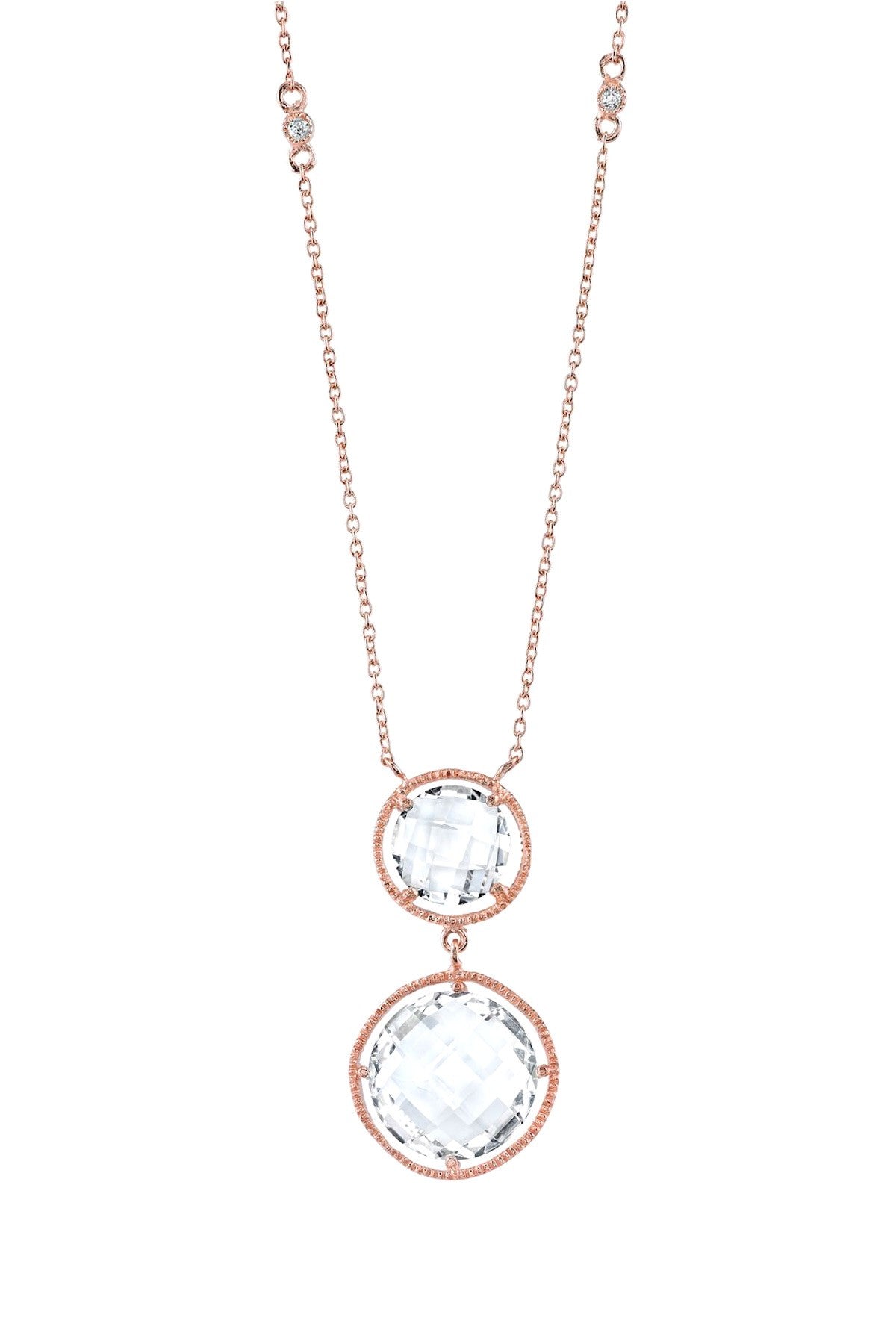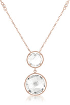 This necklace features two round white quartz gemstones in graduating form, with each circle surrounded by a rim of rose goldplated .925 sterling silver. The necklace secures with a spring ring clasp