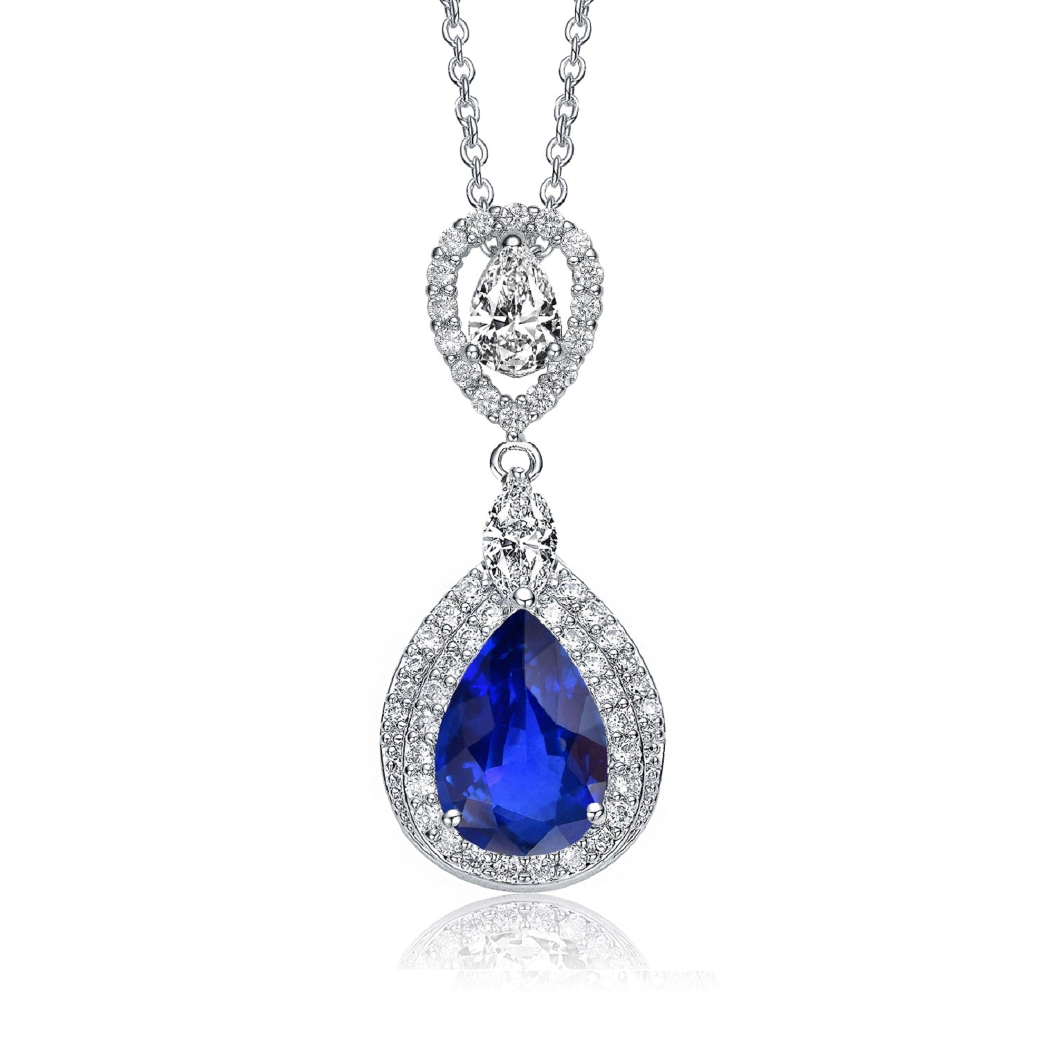 The necklace features a sterling silver rhodium-plated pendant adorned with a captivating teardrop-shaped sapphire. The sapphire, in a deep blue hue, is framed by a halo of clear cubic zirconia stones that extend to the bail, adding a dazzling sparkle. The pendant hangs gracefully from a delicate silver chain, making it an embodiment of sophistication. Whether worn for formal occasions or everyday elegance, this necklace combines classic style with modern allure.