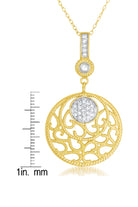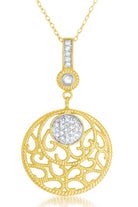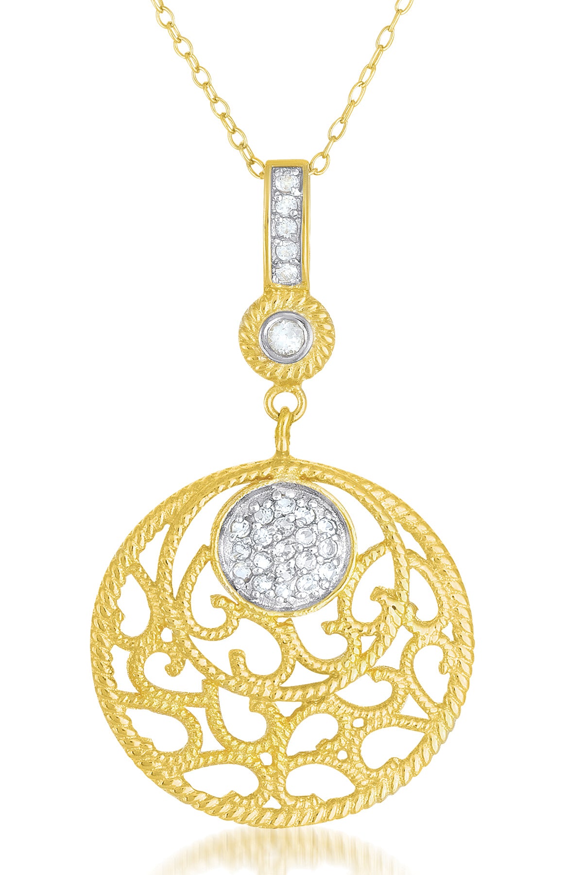 This pendant features a unique openwork swirl laced design on a circle of .925 gold plated sterling silver. Adorned with round-cut clear cubic zirconia stones, the necklace includes an 18-inch chain.
