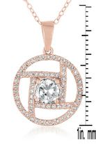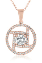 This is a sterling silver pendant that looks like a perfectly balanced traditional ornament. In the middle rests a large white cubic zirconia stone surrounded by small white cubic zirconias in pink bands and round edge; the clasp is also a bedazzled pink piece that holds this pendant in a pink chain.