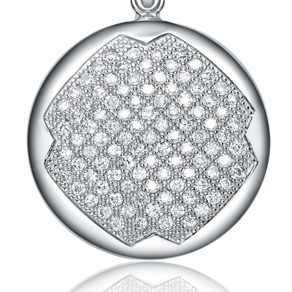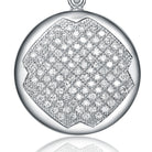 This is a classic round shaped sterling silver pendant which a design consisting of a large round piece with small white cubic zirconia stones. The edge of this flat round piece is a clean and seamless area clean with stones; the entire piece has a large clasp that holds it onto a delicate silver chain.