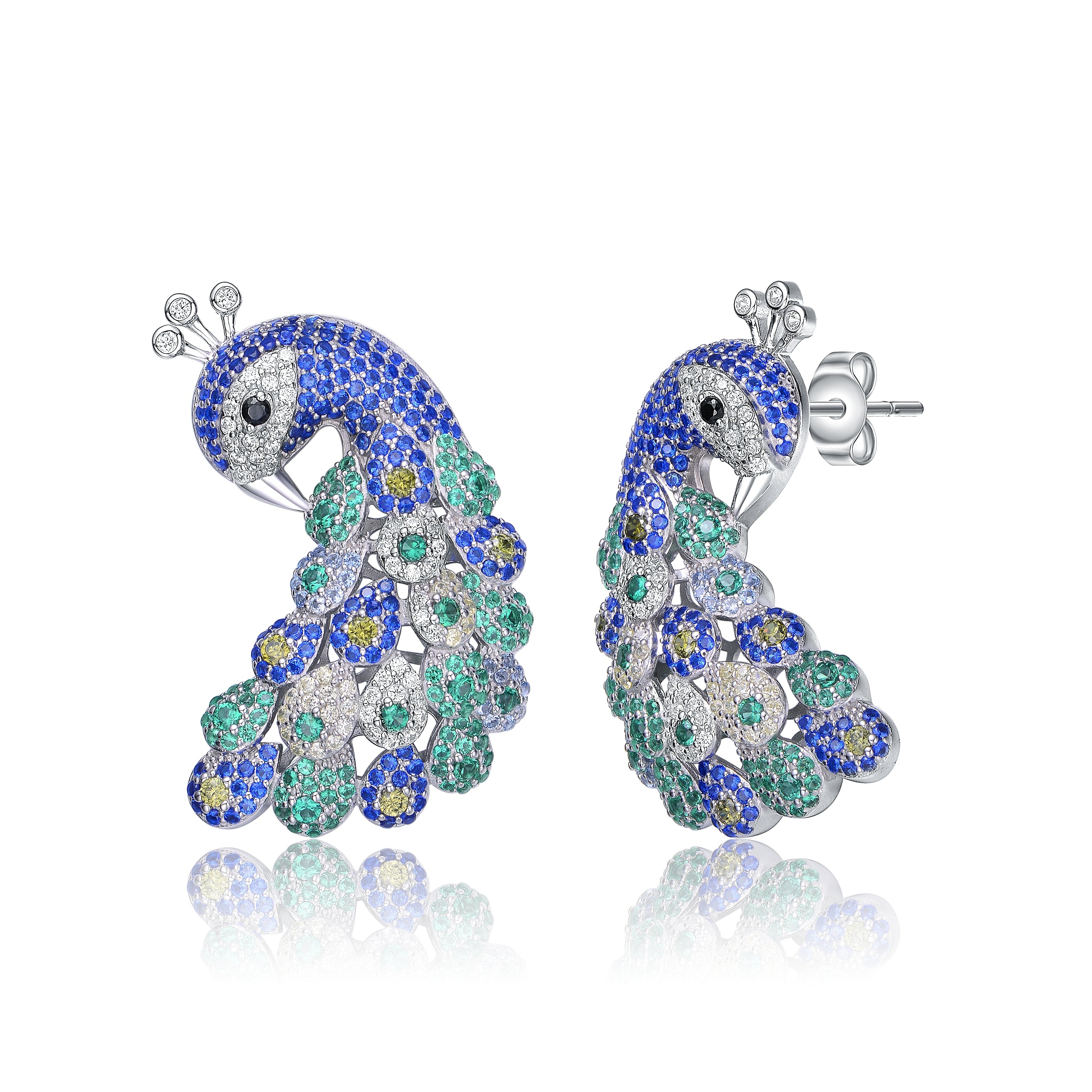 Stylish Sterling Silver White Gold Plating Sapphire and Emerald Cubic Zirconia "Peacock" Earrings . This stylish item features interesting design made out of "peacock" shaped frame accented with blue, yellow, green, black and clear round cubic zirconia stones paved on the frame. Crafted of Sterling Silver with White Gold Plating and it is secured with butterfly closure. Perfect piece of jewelry for stylish combinations. This item also makes a great gift as well.