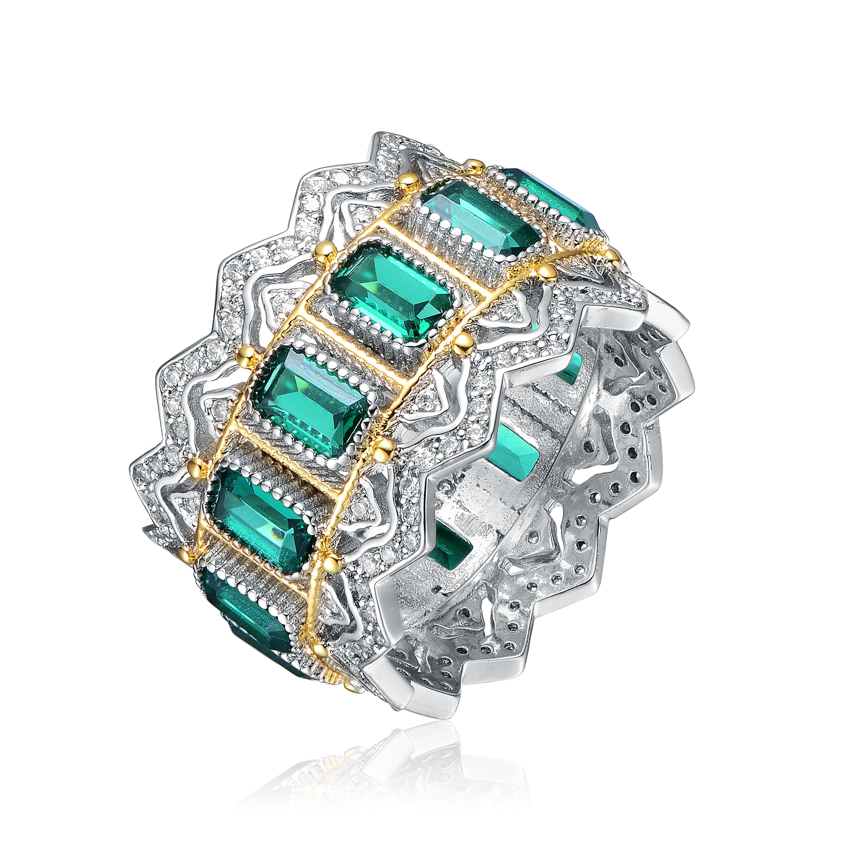 Elegant Rhodium and 14K Gold Plated Emerald Cubic Zirconia Band Ring. This stylish item features interesting one of a kind design. It features large emerald cut emerald cubic zirconia stones in the center, set in decorative prong setting, accented with small clear round cubic zirconia stones between each emerald stones on both sides, as well as on the frame of the band. Crafted with Rhodium and 14K Gold and it is available in sizes 5,6, 7, 8,9 or 10. Perfect piece of jewelry for all combinations. These also make a sensational gift for a special birthday or occasion.
