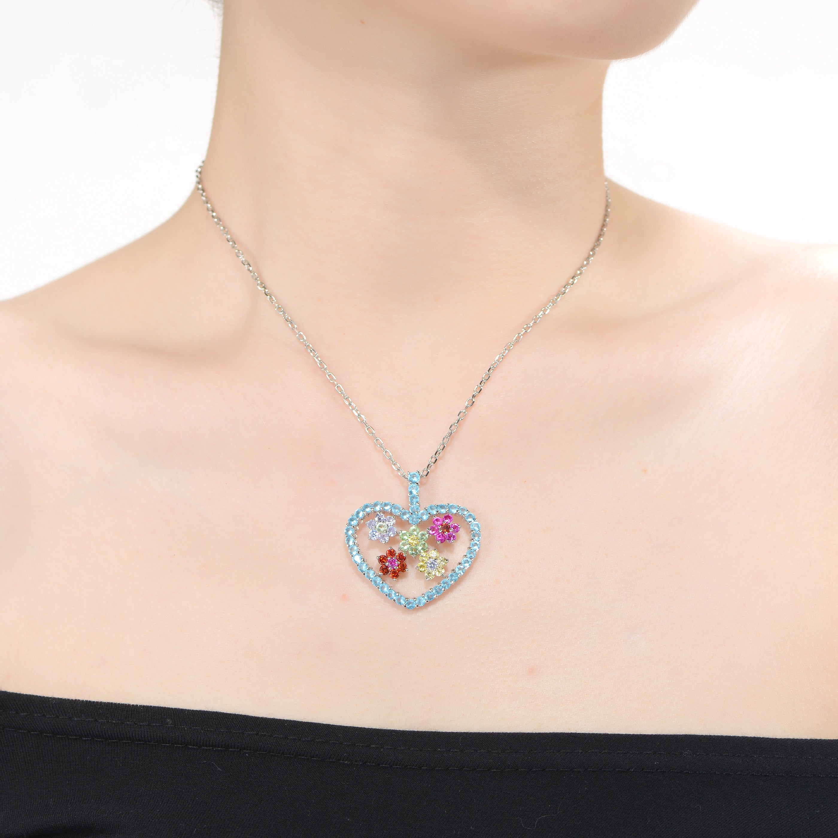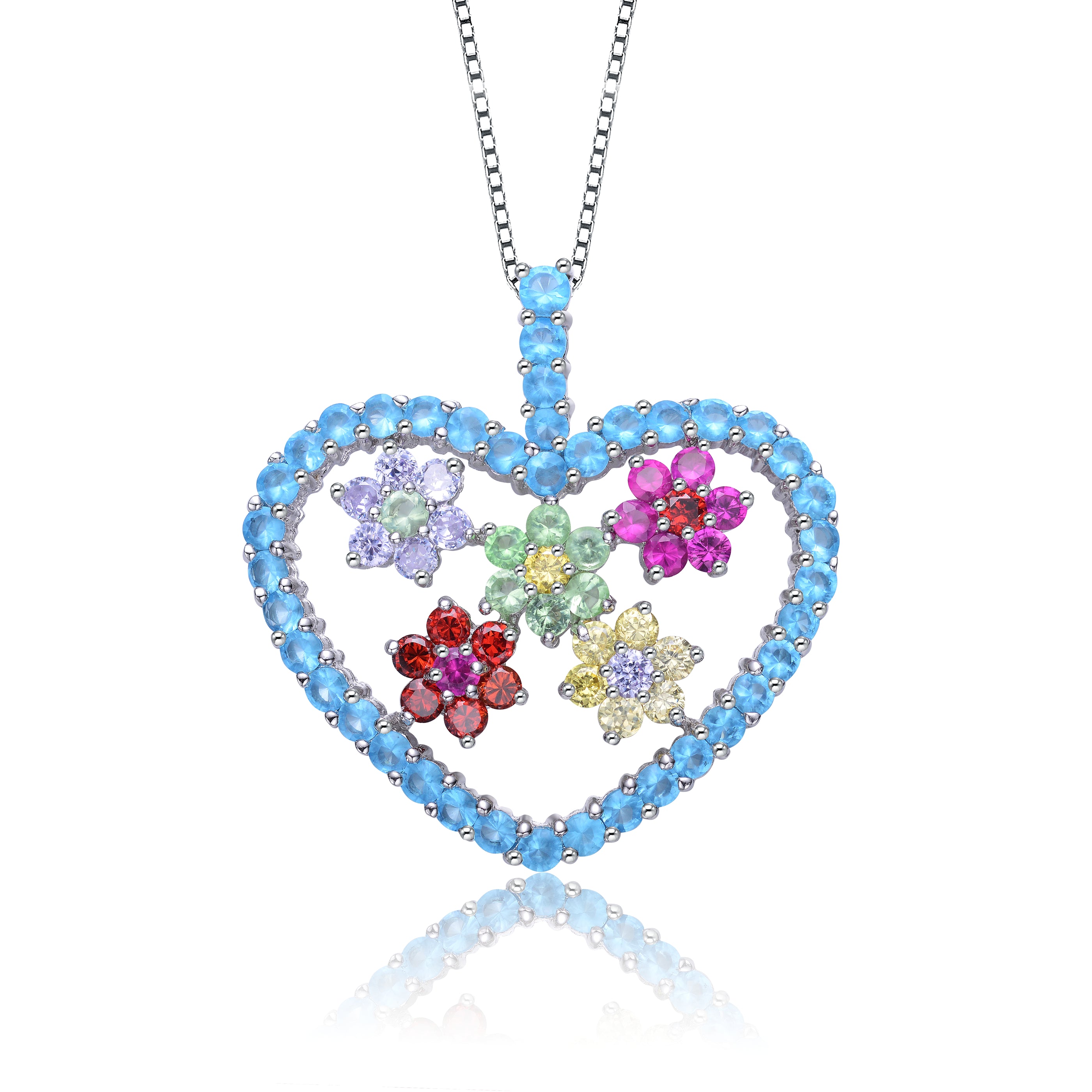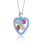 Elegant and enchanting, our Sterling Silver White Gold Plated Heart Pendant Necklace dazzles with its intricate design. A heart-shaped pendant adorned with a delicate border of brilliant blue(March Birthstone) cubic zirconia, framing a kaleidoscope of multi-colored flower-shaped cubic zirconia at its core. This necklace embodies timeless beauty and vibrant allure.