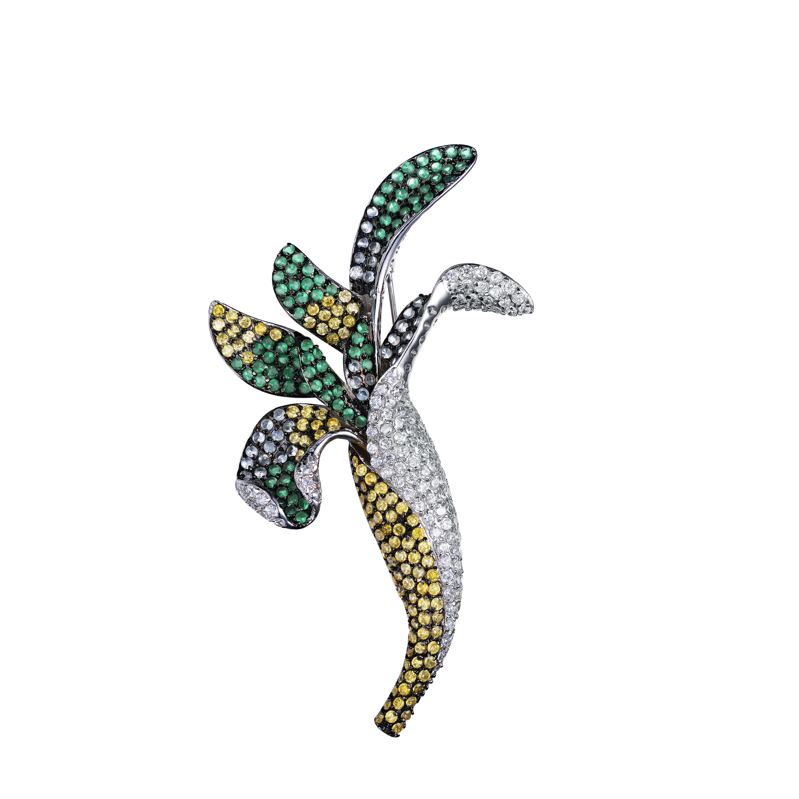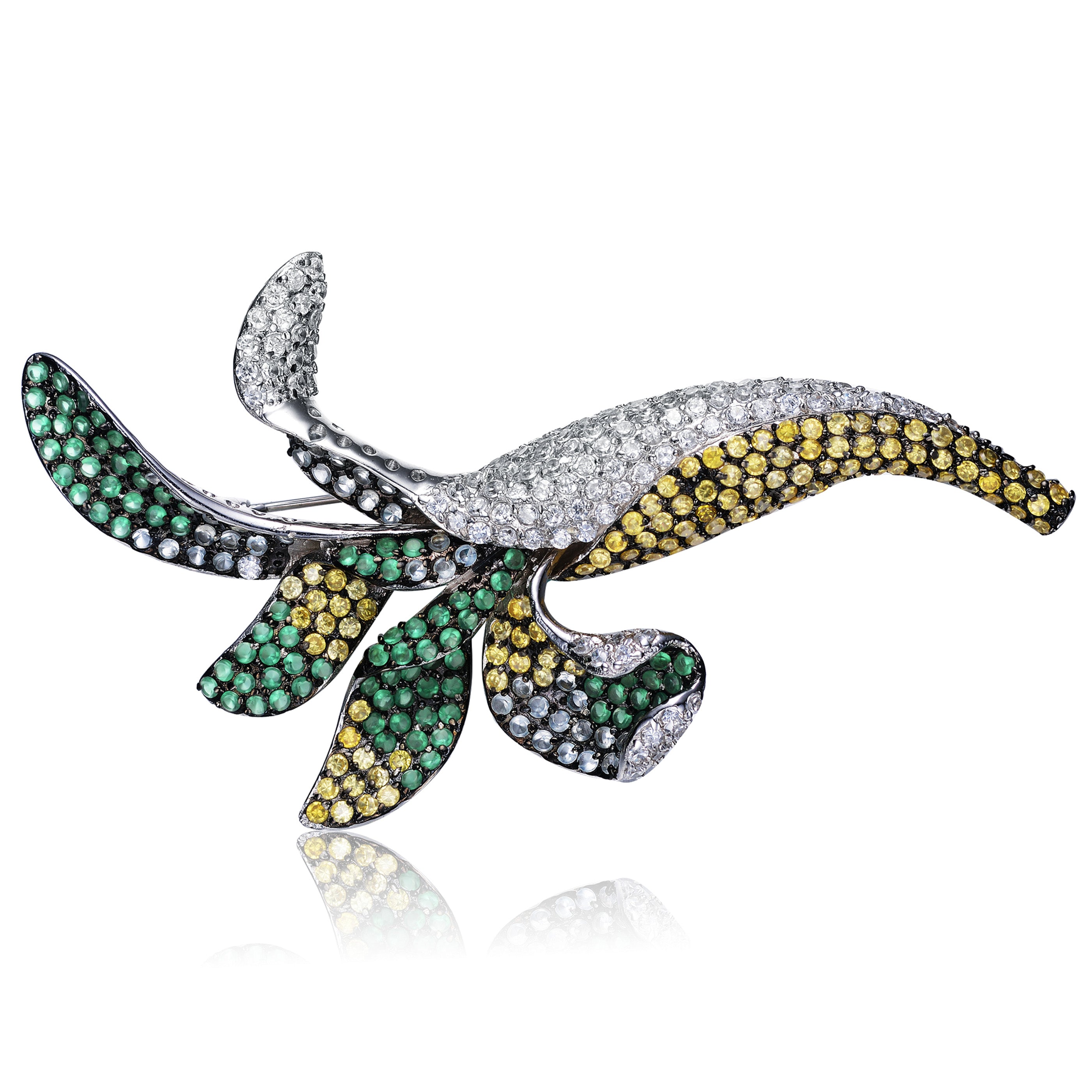 This uniquely designed brooch will be the perfect accessory for your outfit. Looking resplendent with brilliant white, yellow and green cubic zirconia set in black rhodium plated sterling silver, this design is a great buy.