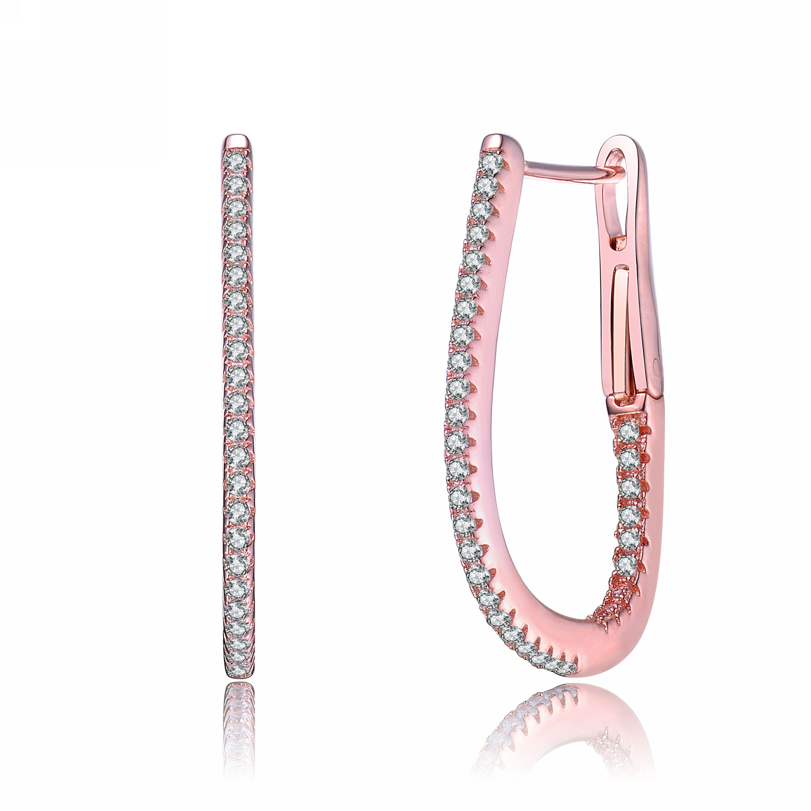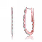 Elegant Sterling Silver 18K Rose Gold Plated Hoop Earrings. These earrings's design feature clear round Cubic Zirconia stones paved on the rounded metal frame. Crafted in Sterling silver with 18K Rose Gold Plated Plating and secure with saddleback closure. This item makes a great gift as well.
