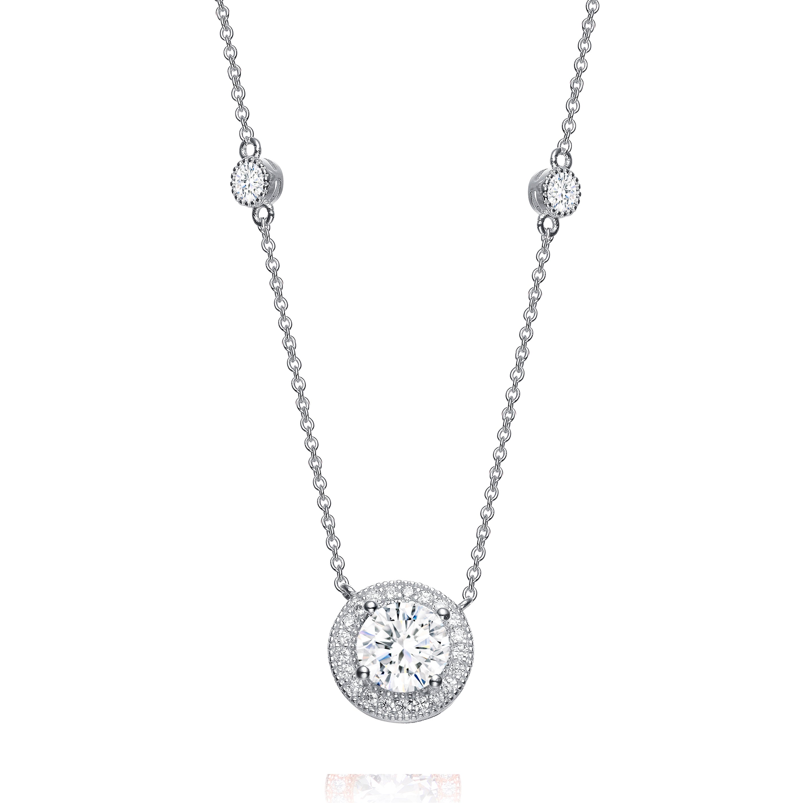 This lovely Sterling silver with Rhodium plated necklace has a very opulent pendant that shines like the stars. The pendant is a large round clear Cubic Zirconia solitaire with a halo of small clear Cubic Zirconias enhancing the shine of the huge center stone. Two small clear round Cubic Zirconias in a hammered bezel set are found in the delicate necklace chain. This necklace is secured with a spring ring clasp.
