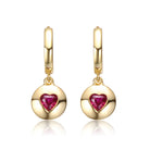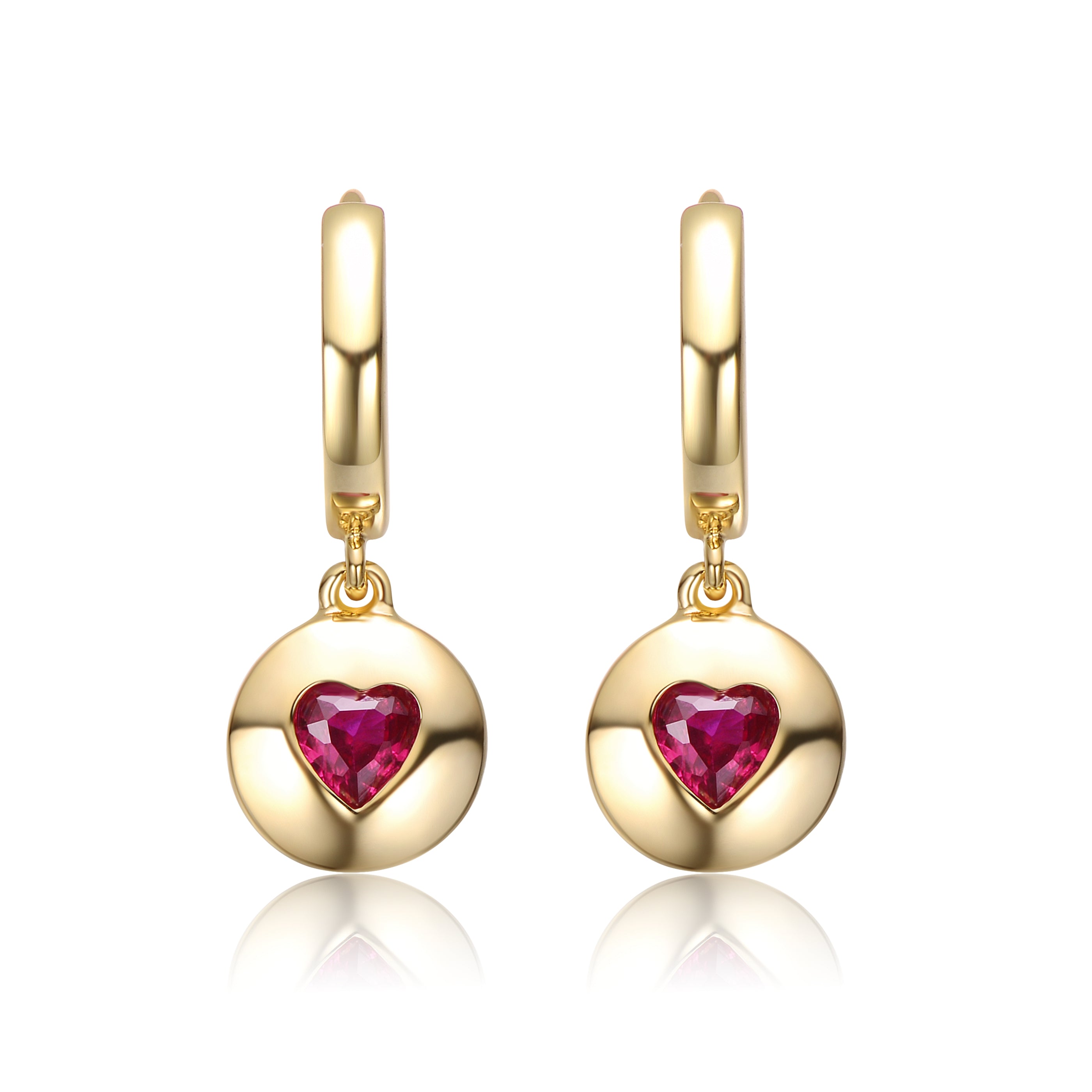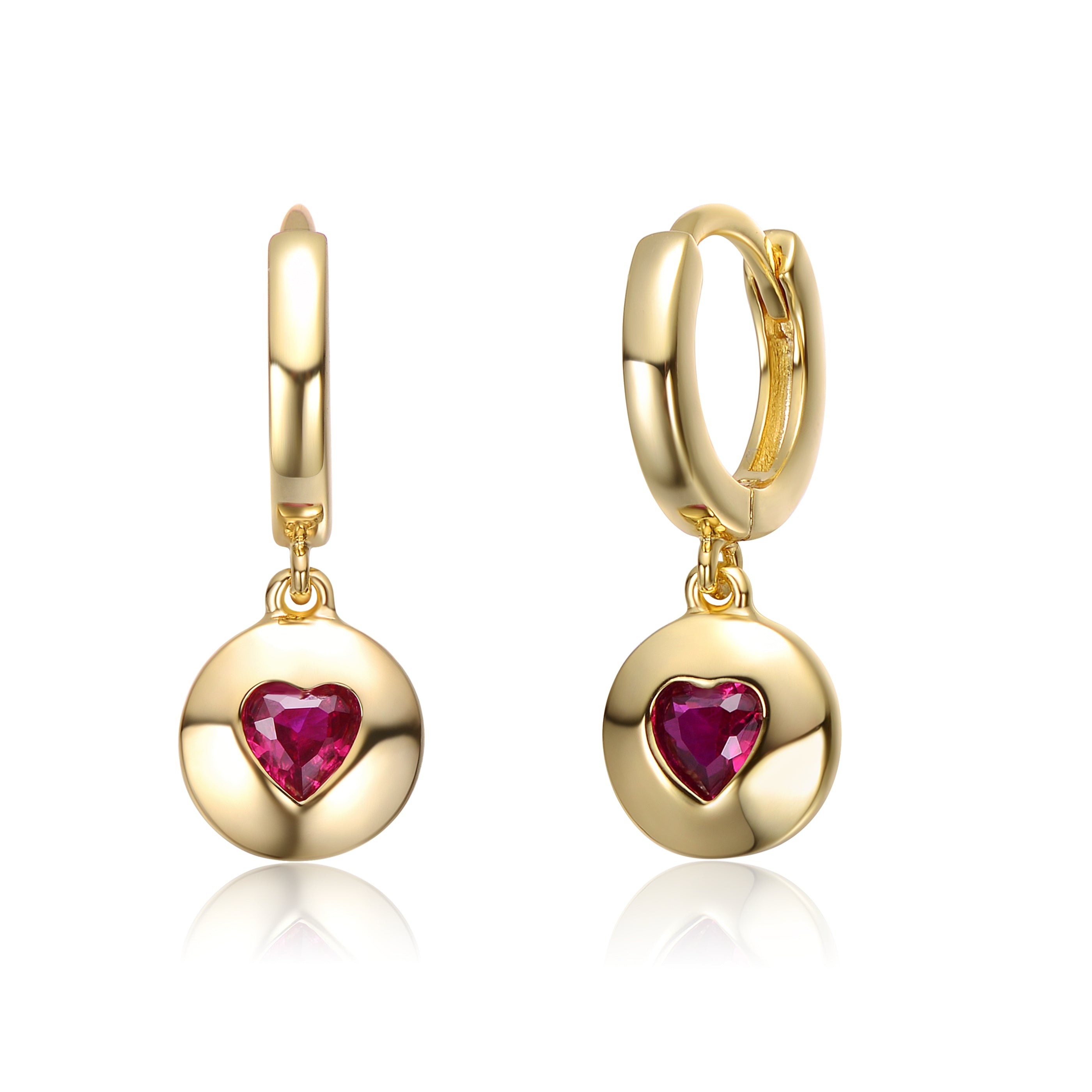 Teens Sterling Silver 14k Gold Plated Ruby Red Cubic Zirconia Dangle Earrings. These brightly polished sterling silver 14k gold plated dangle drop earrings make a fantastic gift for any loved one or a chic little treat for yourself, perfect for wearing frequently. Heart-shaped red cubic zirconia nestle in round disc drops, giving these pretty earrings vibrancy with their enchanting style. The small huggie hoops hold these earrings comfortably on the ears.