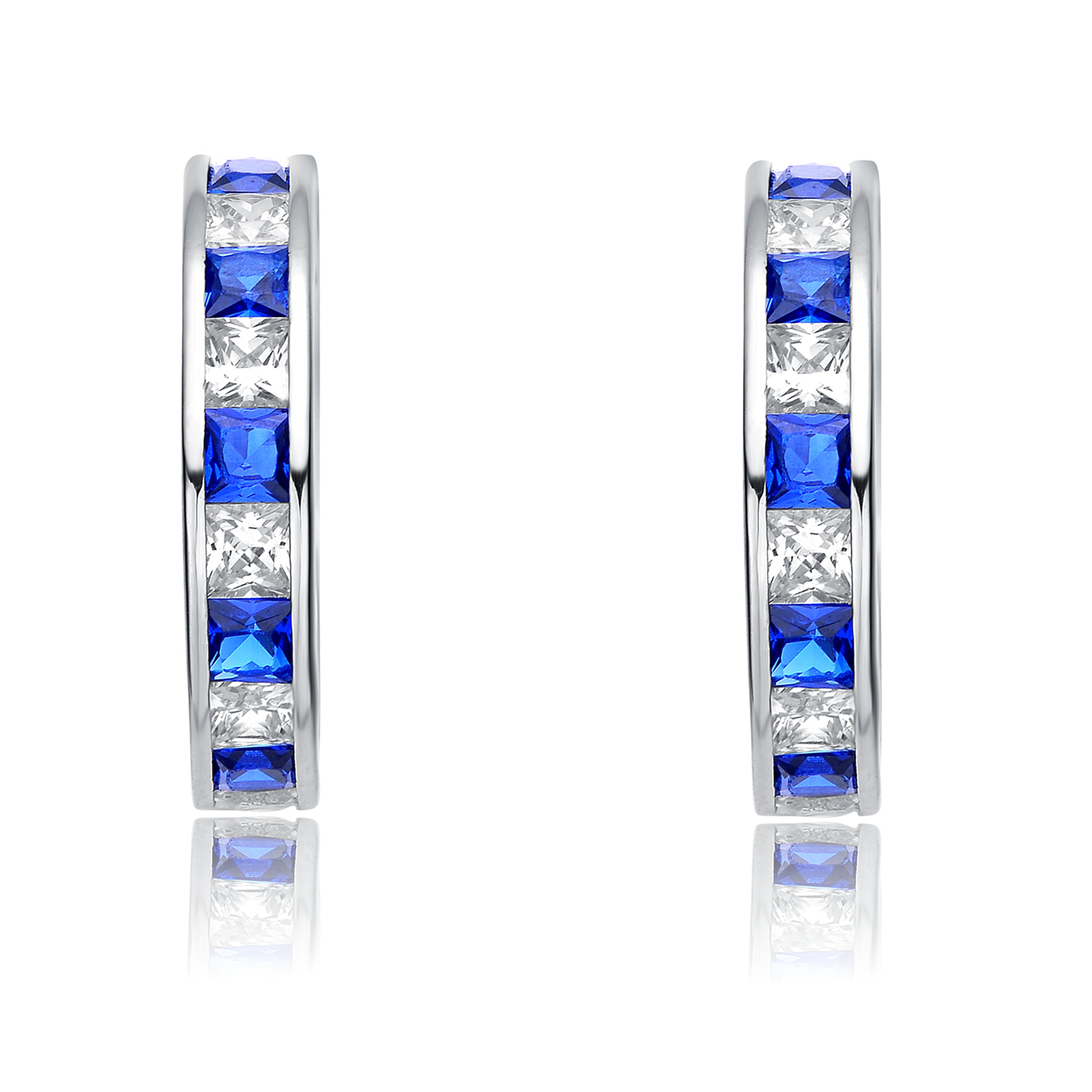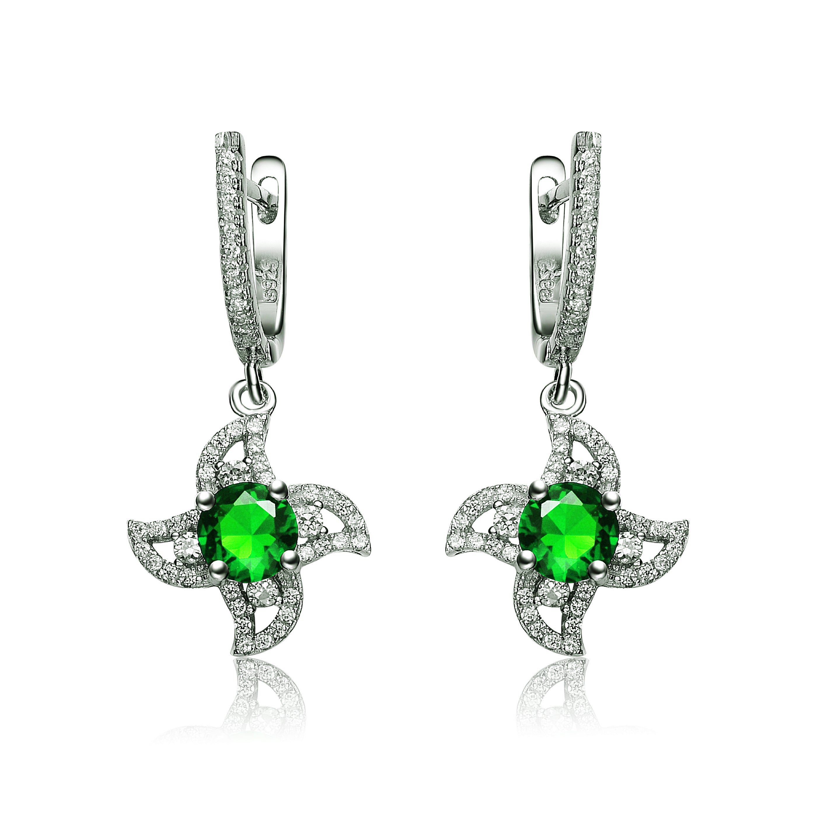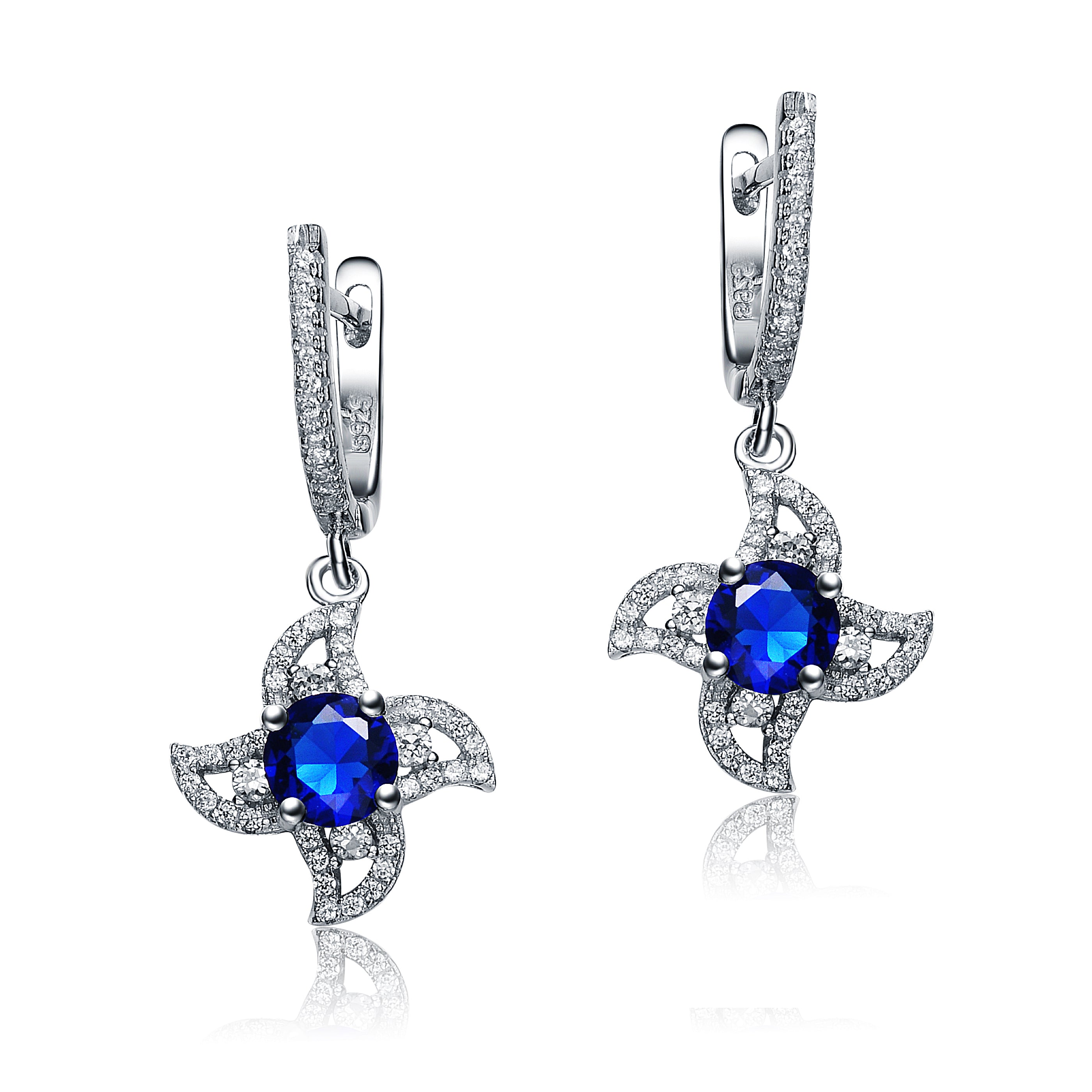 CZ Sterling Silver Rhodium Plated Sapphire Flower Dangling Earrings