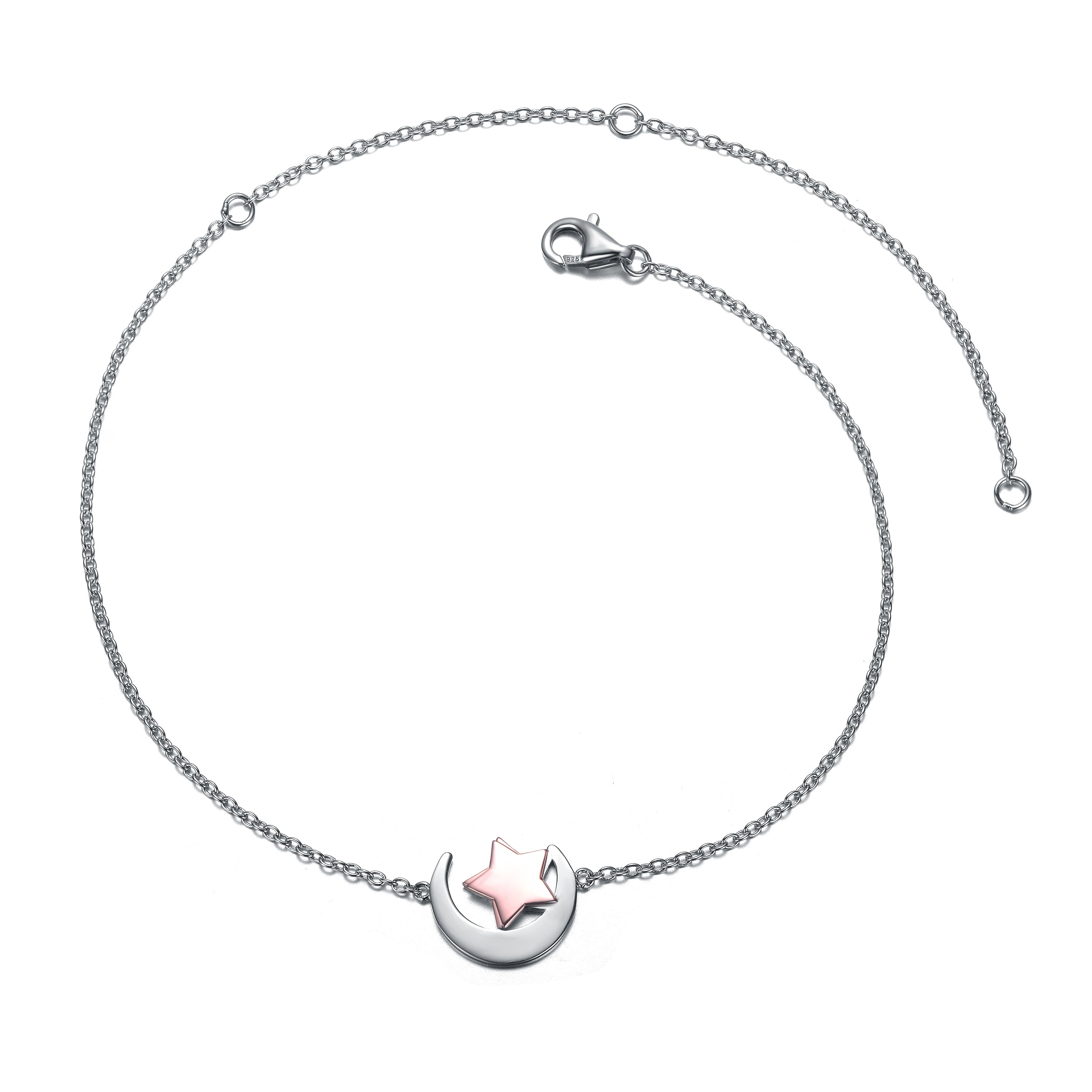 Sterling Silver 18k Rose Gold Plated Lucky Star & Crescent Moon Charm Anklet, Adjustable Length