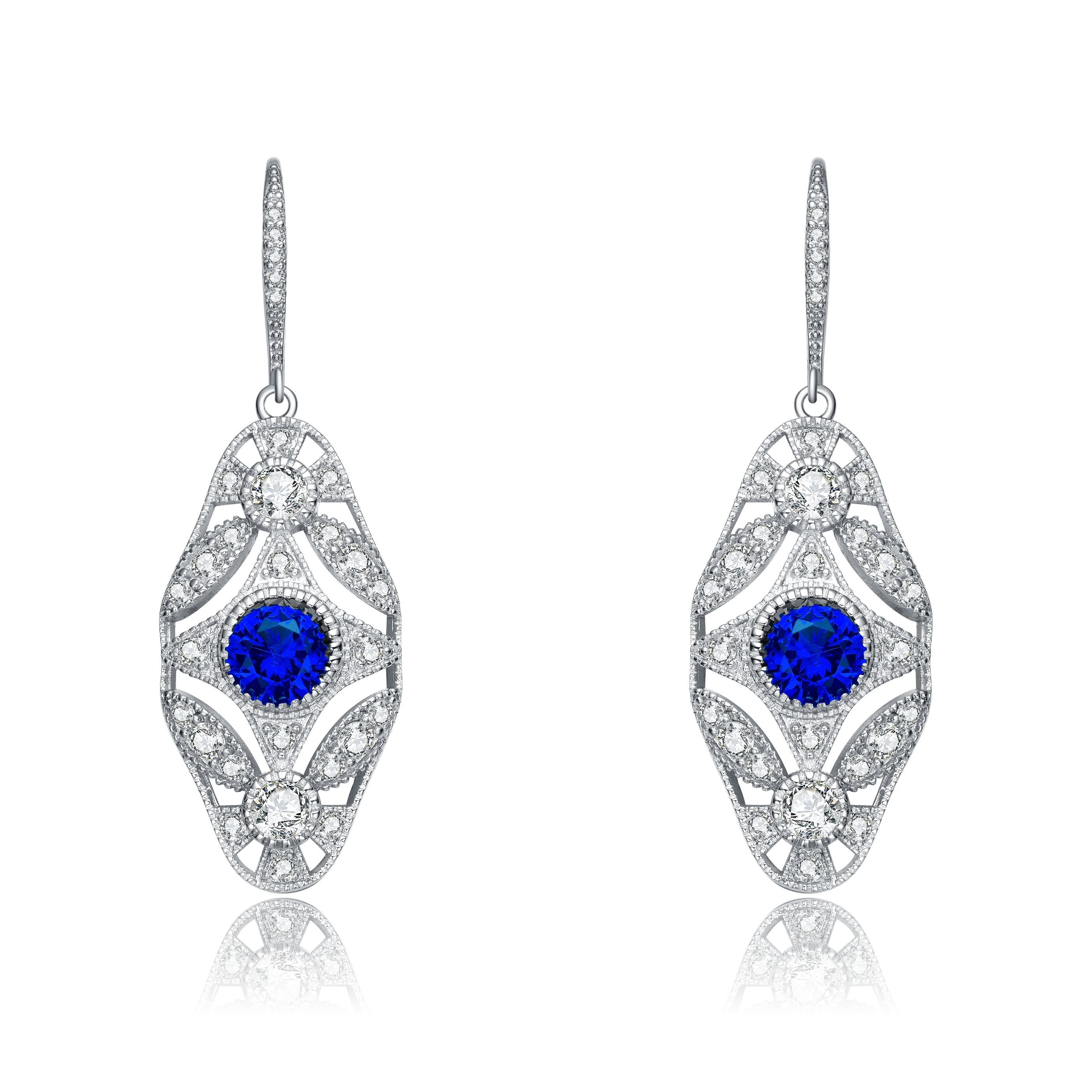 Sterling Silver White Gold Plated Blue Sapphire & Diamond Cubic Zirconia Double Fluttering Butterfly Pendant Necklace