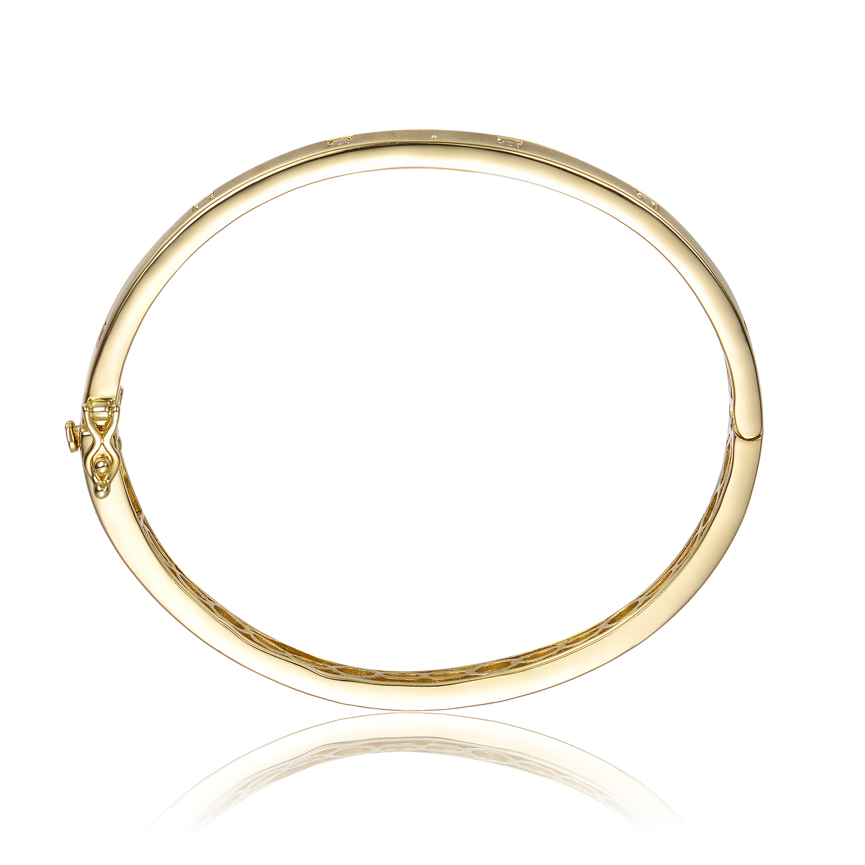 This refined bangle bracelet showcases sleek baguette accents set into a polished gold-plated silhouette. Designed for elevated occasions, it delivers timeless elegance with clean architectural appeal.