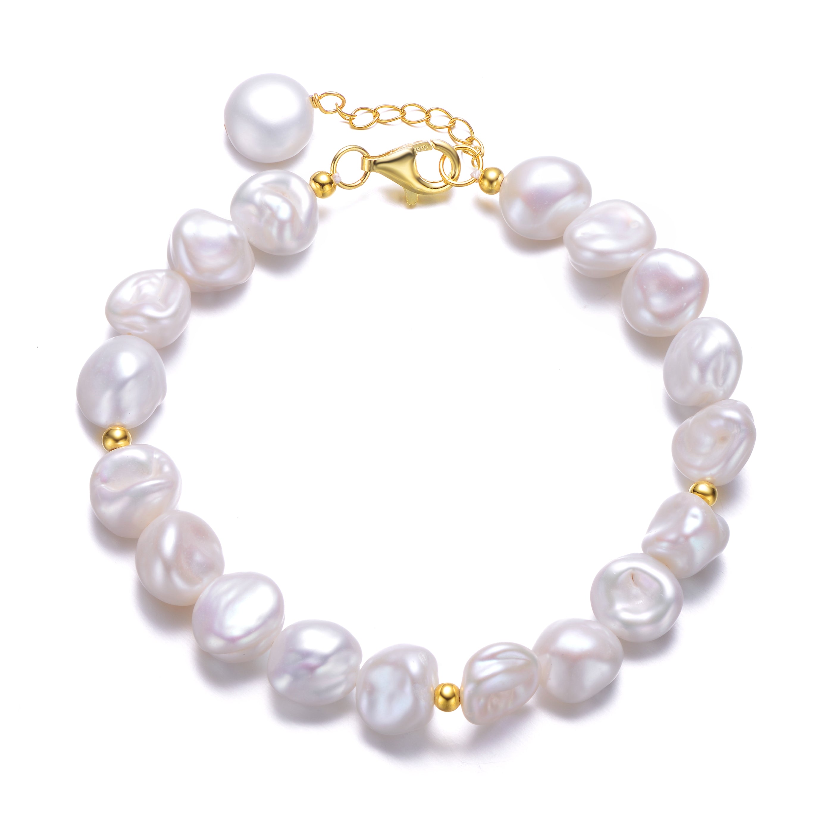 Elegant Sterling Silver Freshwater Pearl Bracelet. This chain bracelet are decorated with white Freshwater pearls. Crafted of .925 sterling silver with gold plating, this bracelet secures with lobster claw closure.