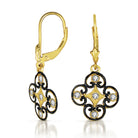 Elegant .925 Sterling silver black and gold plated cubic zirconia drop earrings. These pretty drop earrings feature swirl designs creating art deco flower shapes with clear cubic zirconia accents. Crafted of .925 Sterling silver with black and gold plating and secure with butterfly closure.
