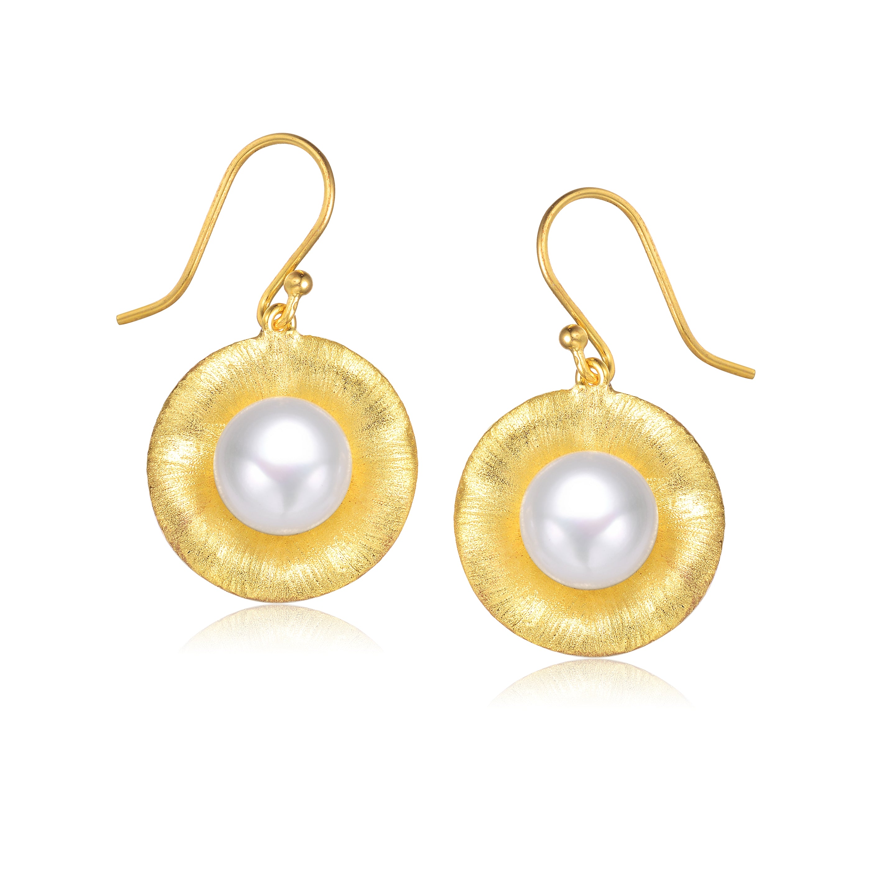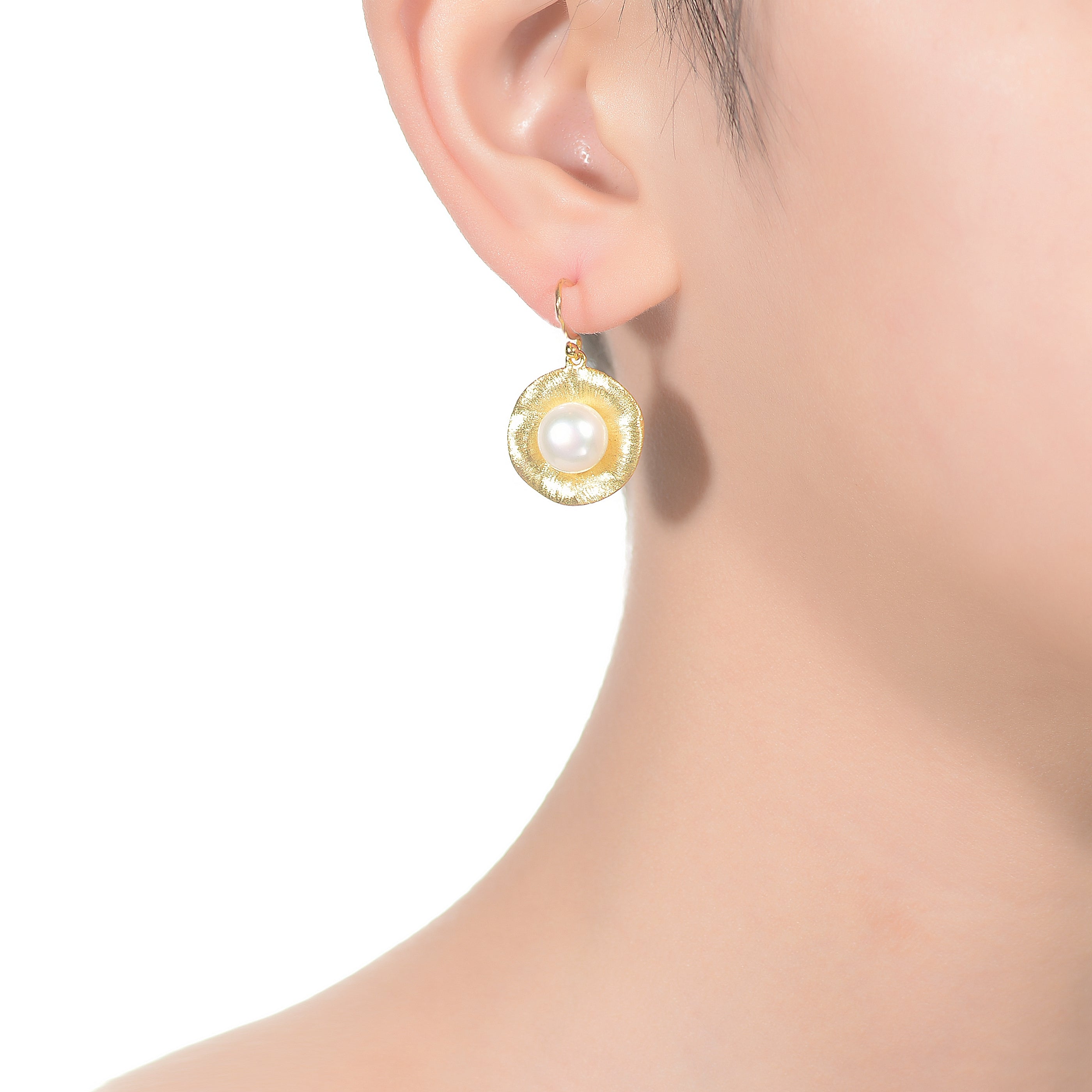Very elegant .925 Sterling silver gold plated with freshwater pearl curvy earrings. These earrings feature design made out of round freshwater pearl set in the center of the curvy gold metal frame. Crafted in .925 Sterling silver with gold plating and it is secured with a hook. This item is great addition to any outfit. Makes a great gift as well.