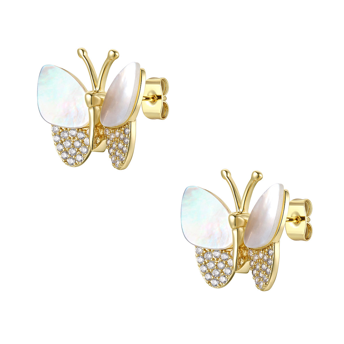Allow the joy of large fluttering butterflies to inspire you, making them the perfect complement to your day. Shimmering mother of pearl cabochons sits on the tops of each butterfly wing. Pave set round brilliant cut cubic zirconias on the bottom wings add glitter, all finely crafted in Sterling Silver with 14k yellow gold plated. Butterfly post backs keep them in place.