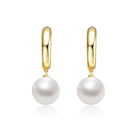 Sterling Silver 14k Yellow Gold Plated White Pearl Drop Huggie Hoop Earrings. These beautiful sterlings silver 14k yellow plated huggie hoop earrings feature a tubular shape, making them easy to mix and match. Shimmering white pearl solitaires nestle on the bottom of each hoop, exuding timeless elegance. Curved posts provide an infinity fit sitting close to the earlobes. Add the perfect finishing touch to your wardrobe with these pearl hoop earrings.