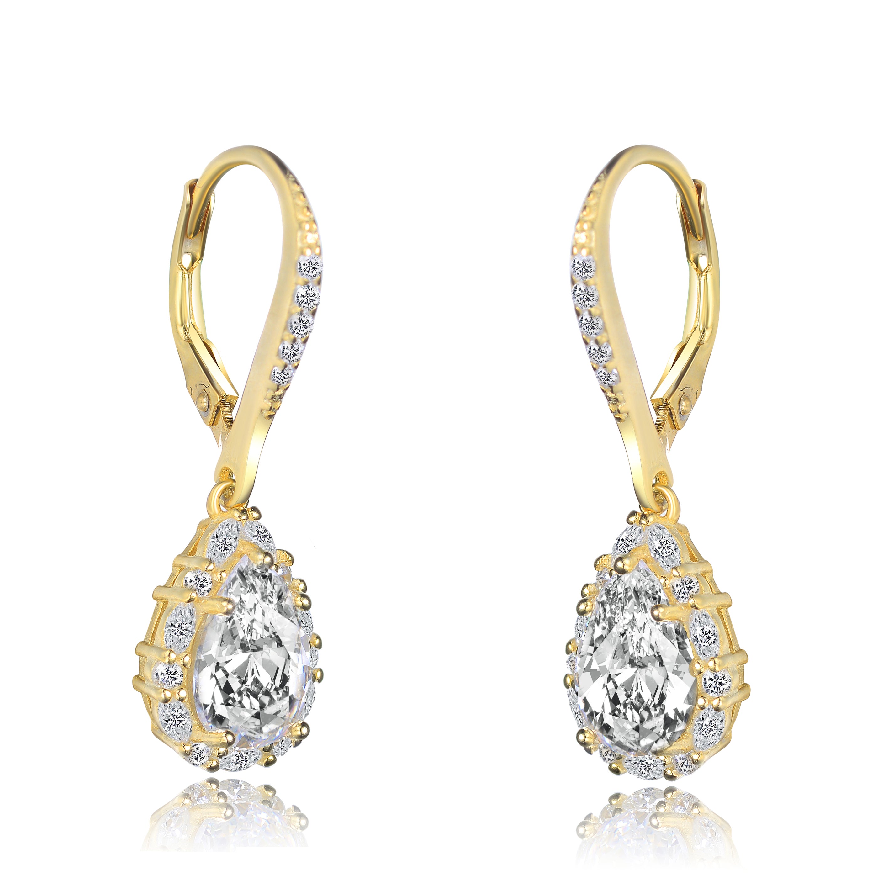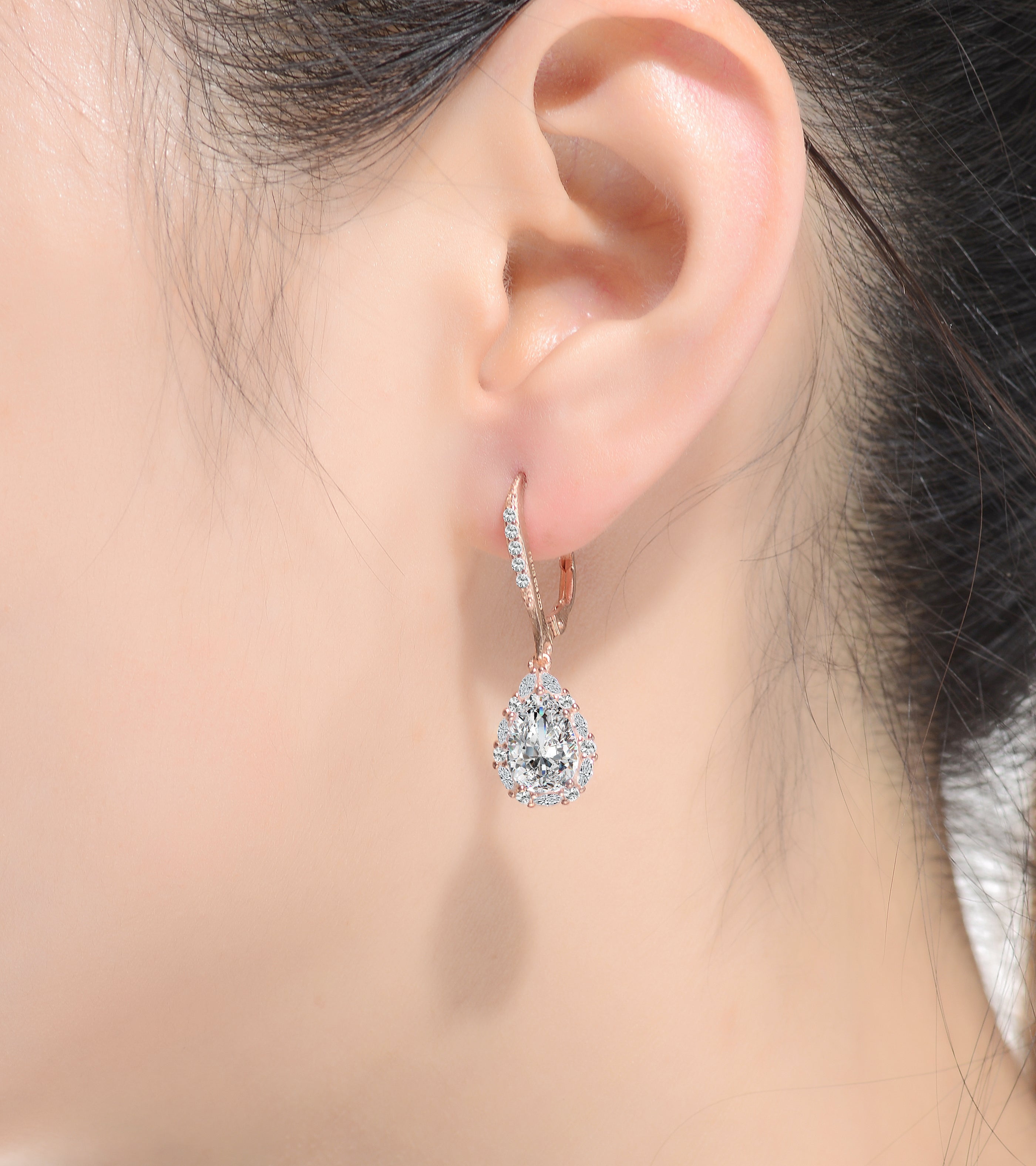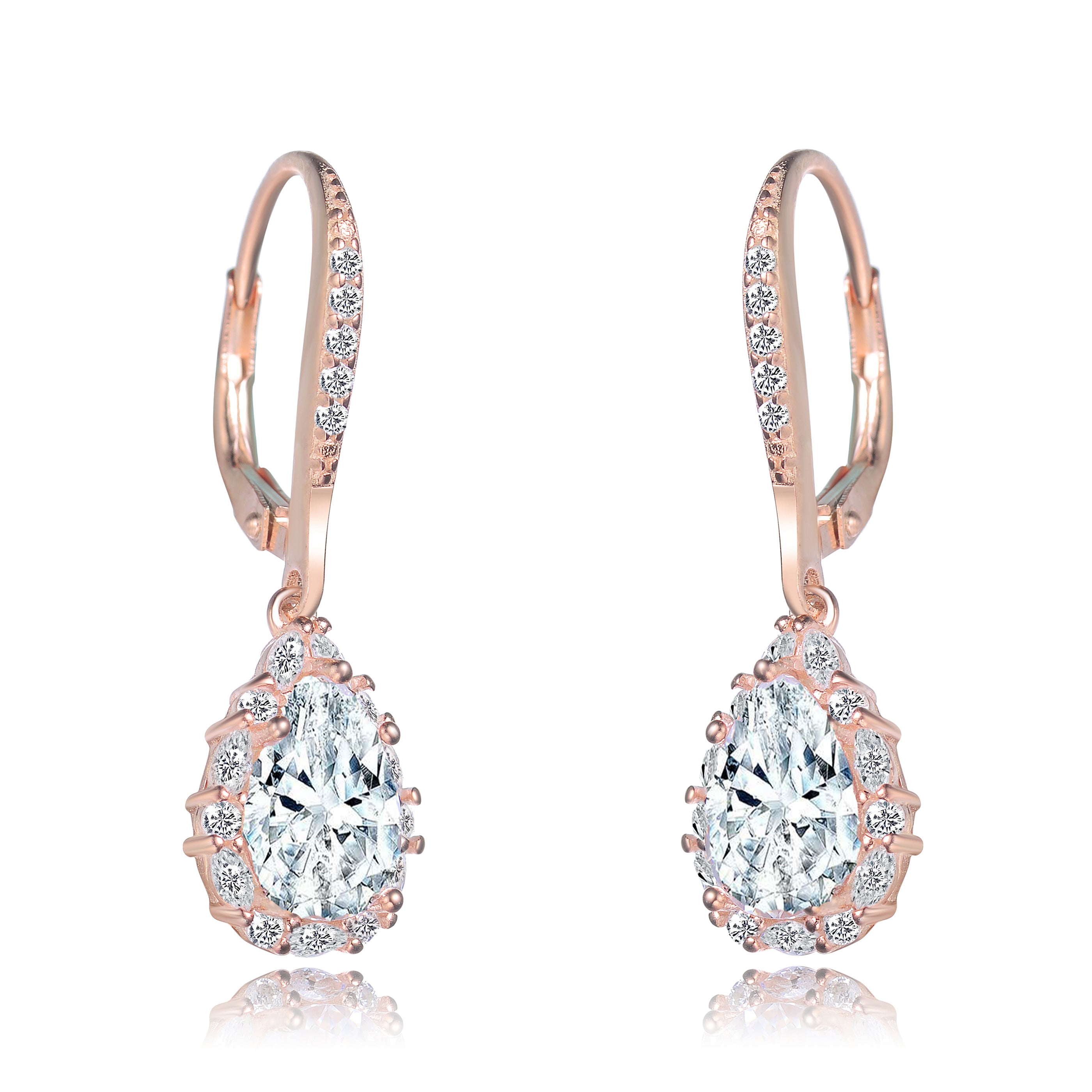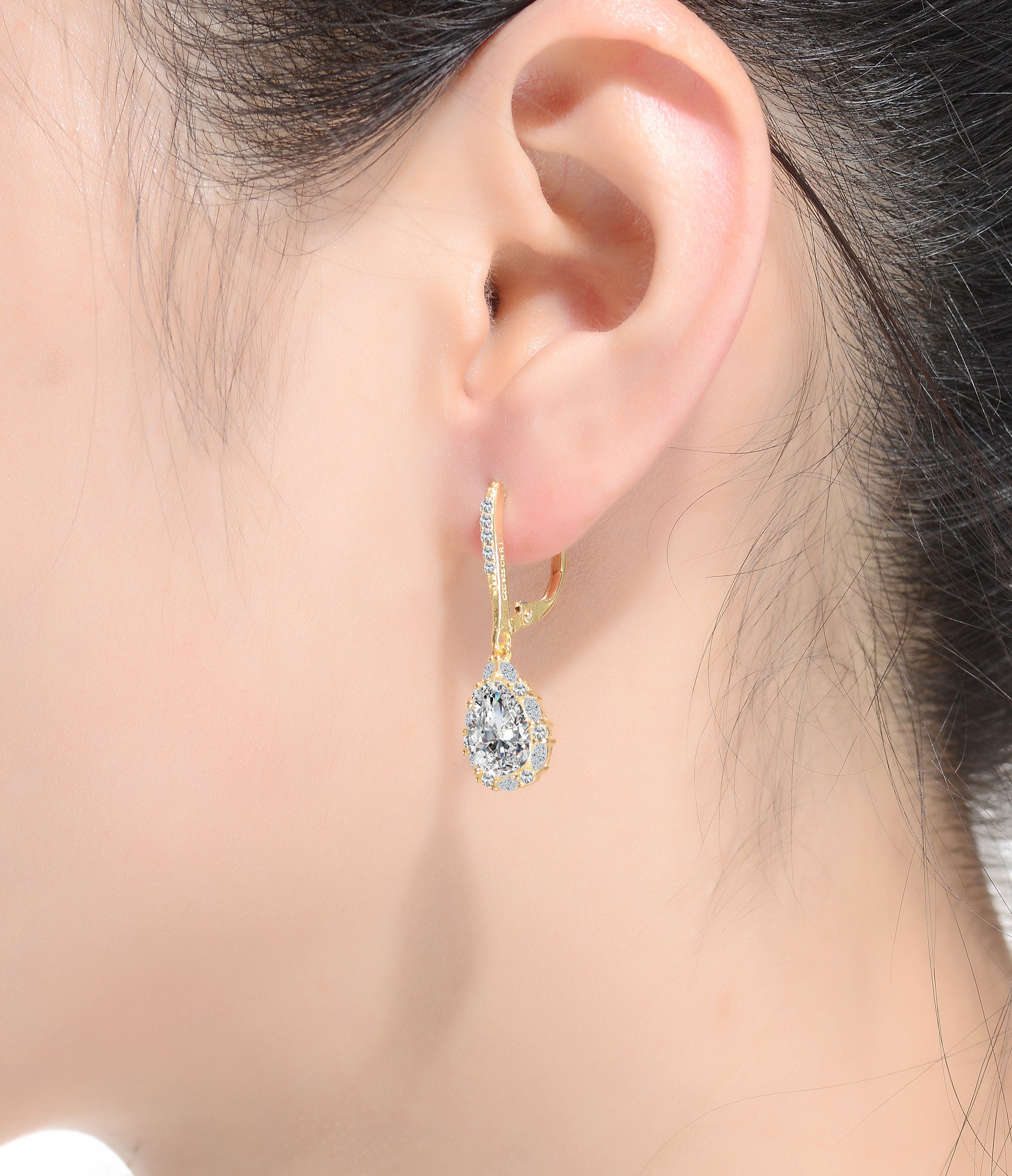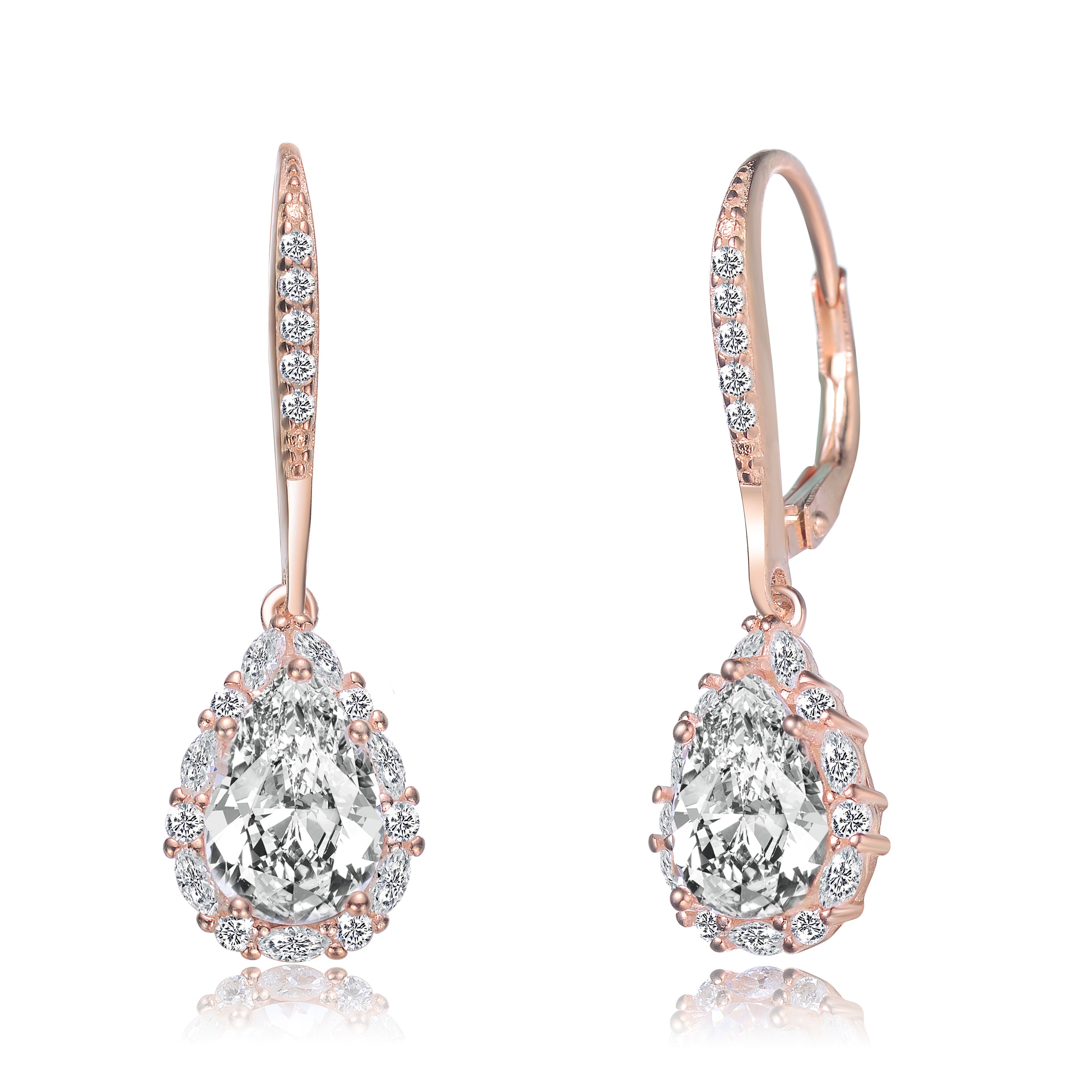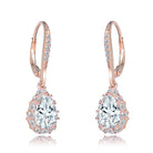 These elegant pear shaped drop earrings are decorated with clear large oval and round-cut cubic zirconia stones in prong setting. Crafted of .925 sterling silver, and are available with 14K Gold or 18K Rose gold plating. These Elegant earrings secure with leverback clasps, for the extra security.