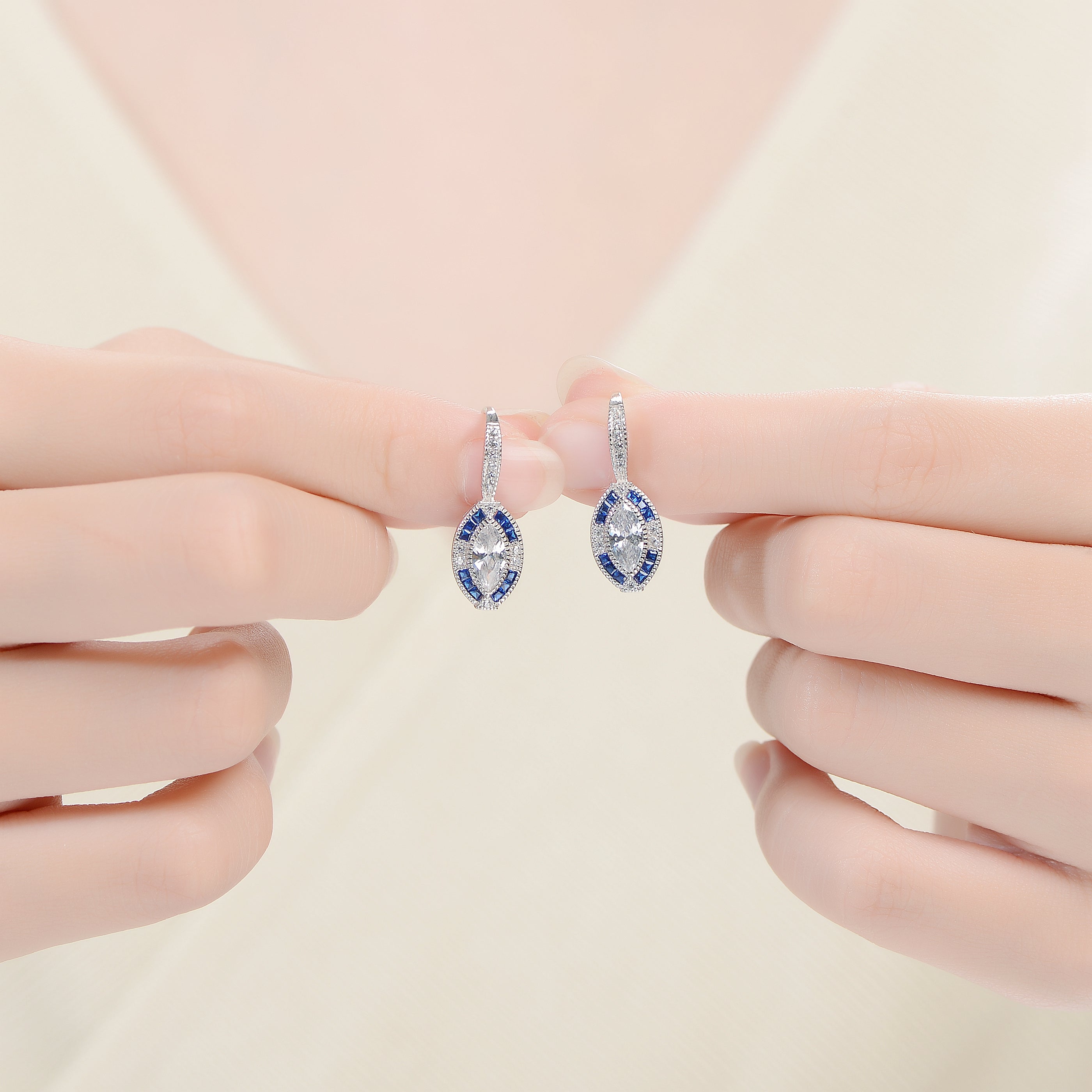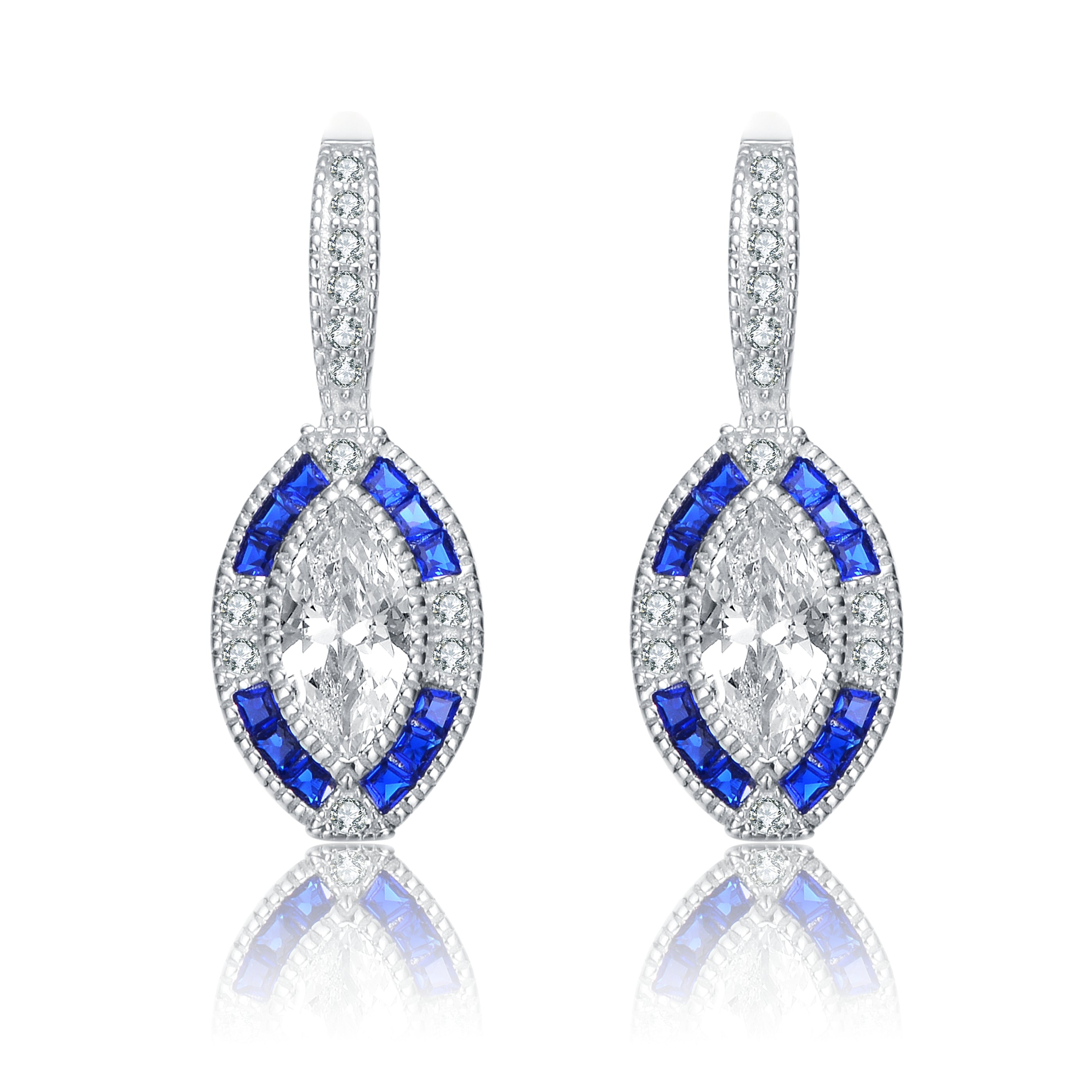 Stylish .925 Sterling silver oval lever back earrings. These earrings feature oval shape made out of clear oval cubic zirconia stone surrounded by blue baguette cubic zirconia stones and clear round cubic zirconia stones set on the metal frame. The front part of the leaver back is also decorated with small clear round cubic zirconia stones. Crafted in .925 Sterling silver with rhodium plating and it is secured with leaver back. This item makes a great gift as well.