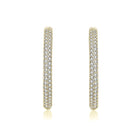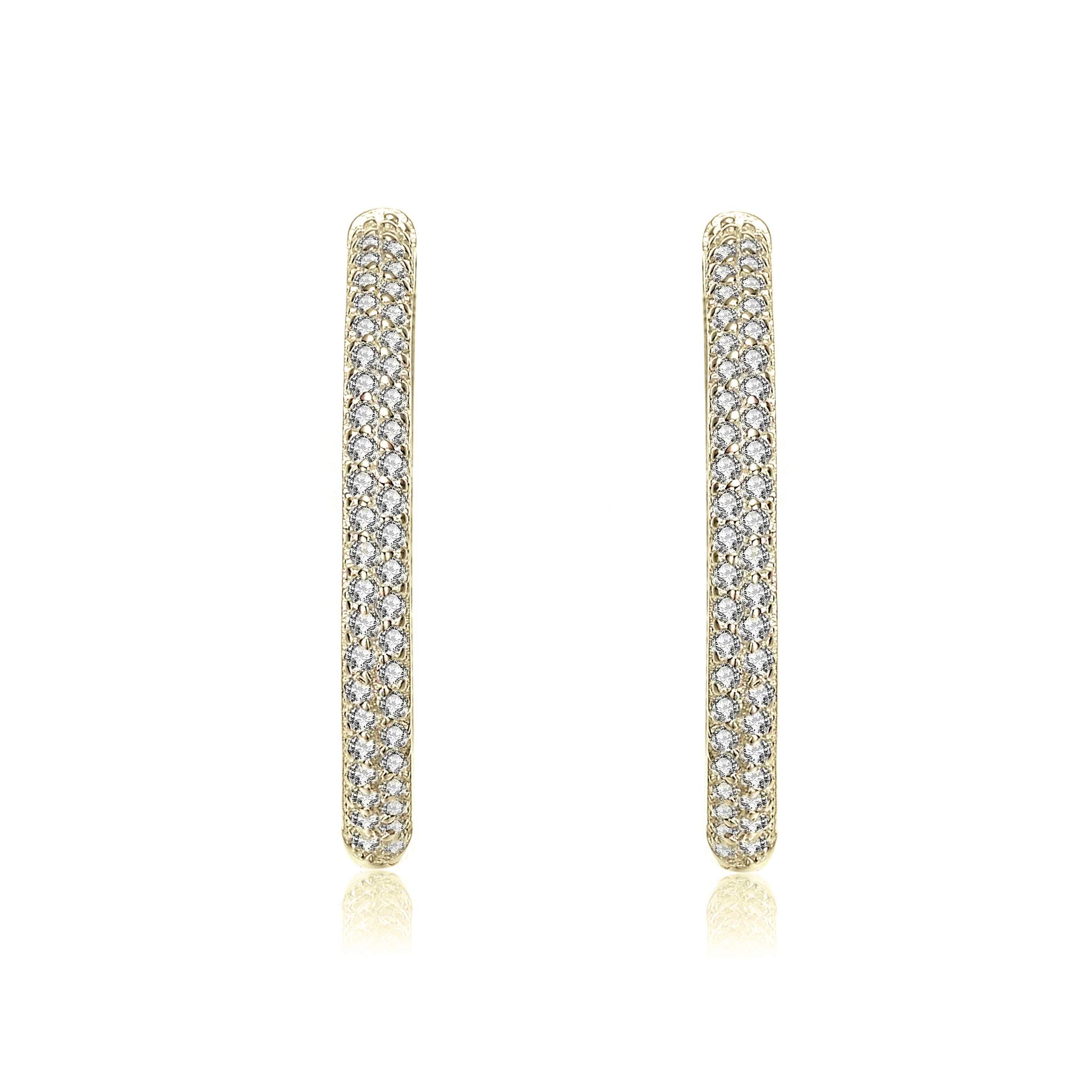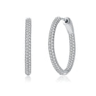 Stylish .925 Sterling silver cubic zirconia hoop earrings. These earrings feature interesting hoop design made out of two rows of clear round cubic zirconia stones paved on the round frame. Crafted in .925 Sterling silver with rhodium plating and secure with saddleback. Available in Gold plating as well.