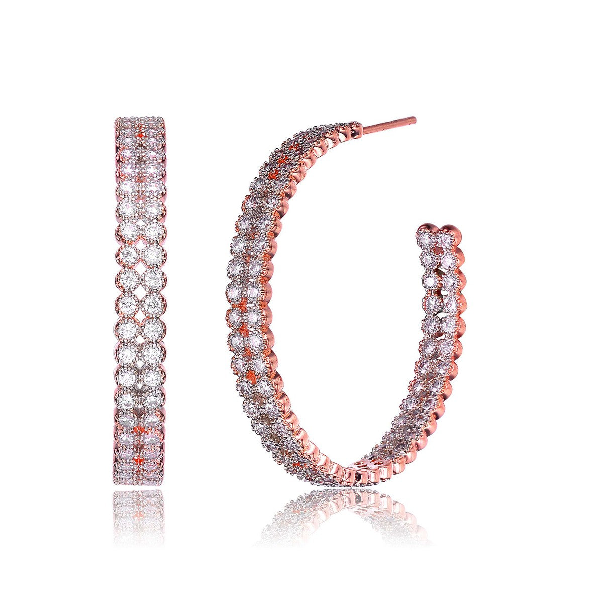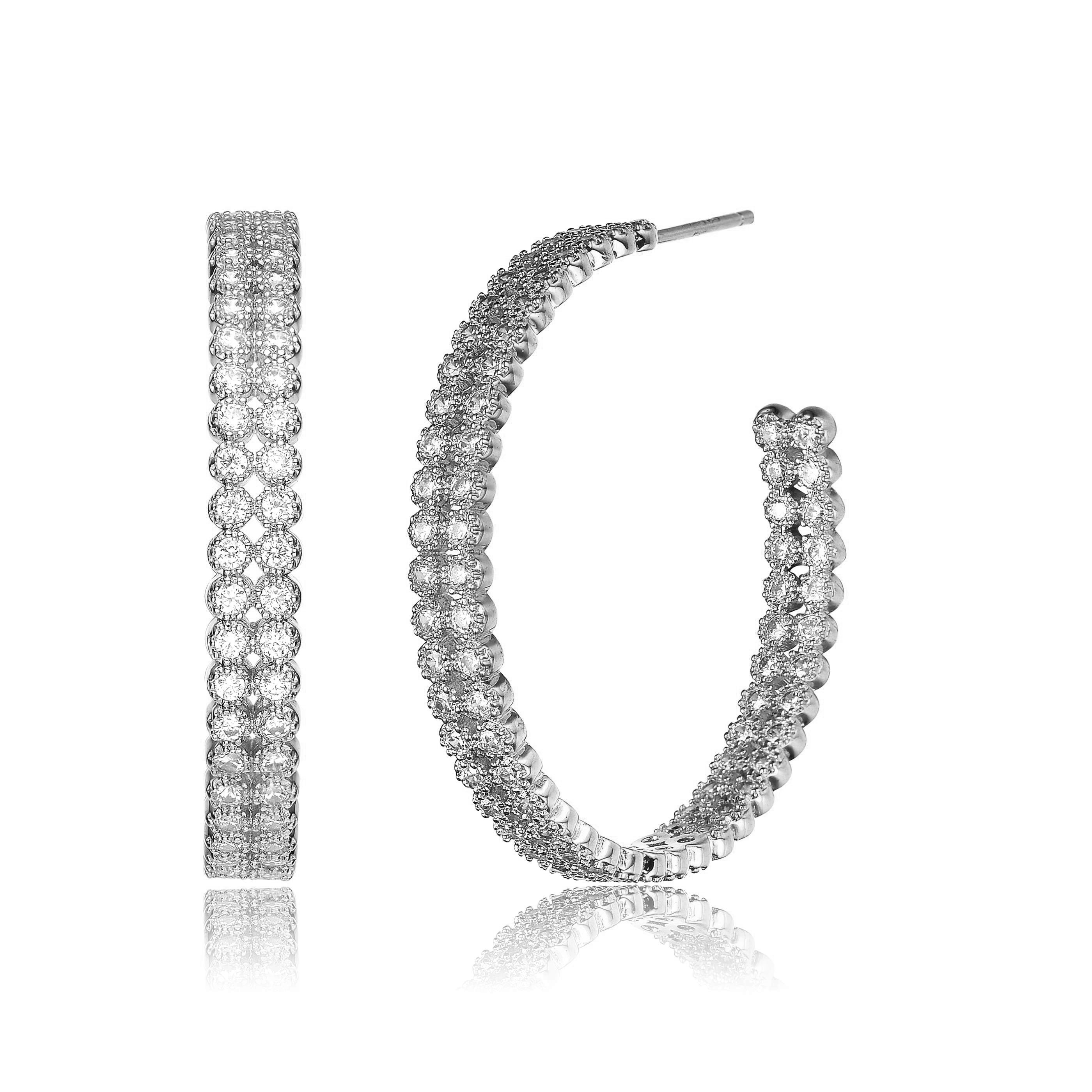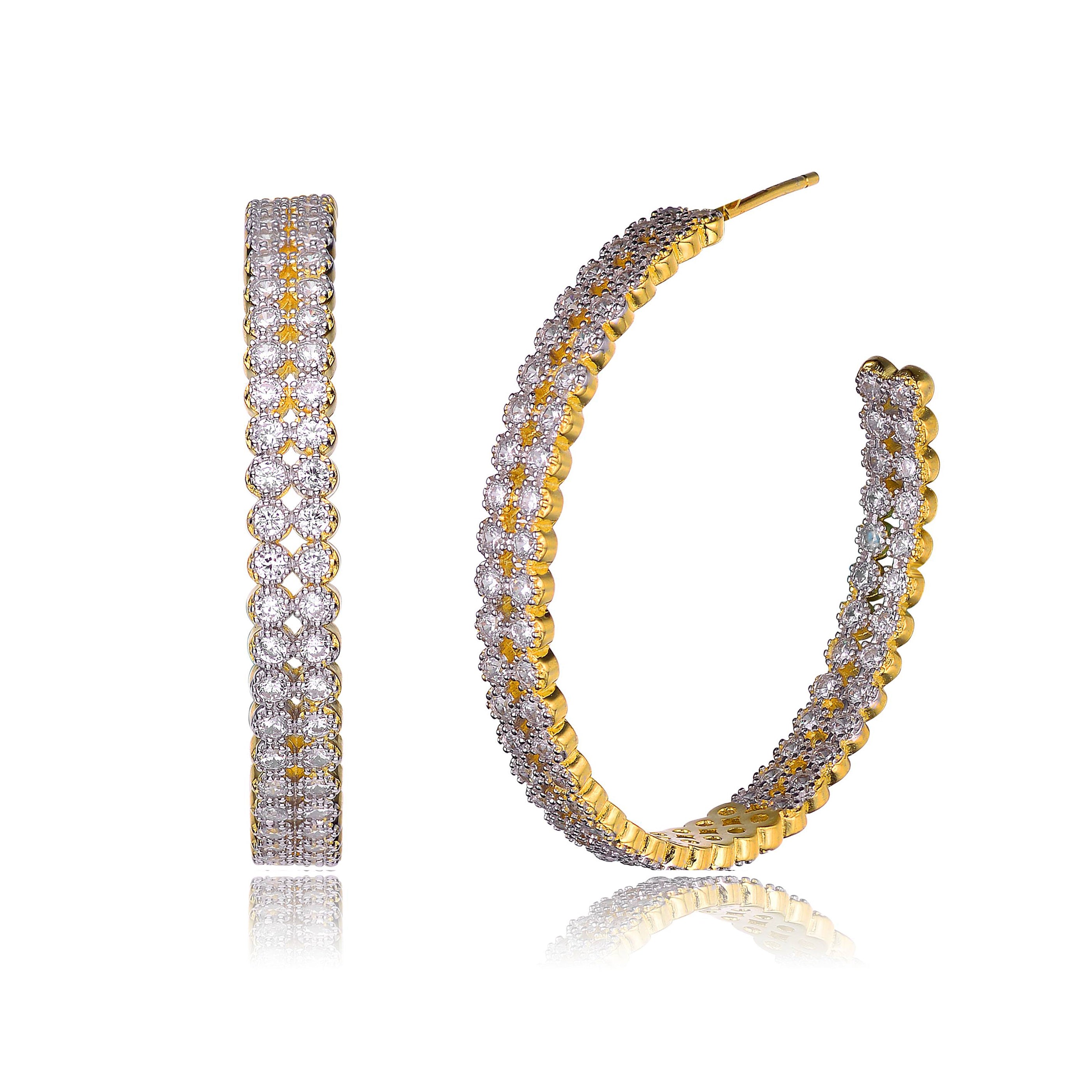 Stylish cubic open hoop earrings. These earrings feature interesting open hoop design made out of two row clear round cubic stones set in bezel. Crafted in Brass Core with rhodium plating and secure with butterfly closure. Also Avialable in 14K Gold plattting and 18K Rose Gold plattng.