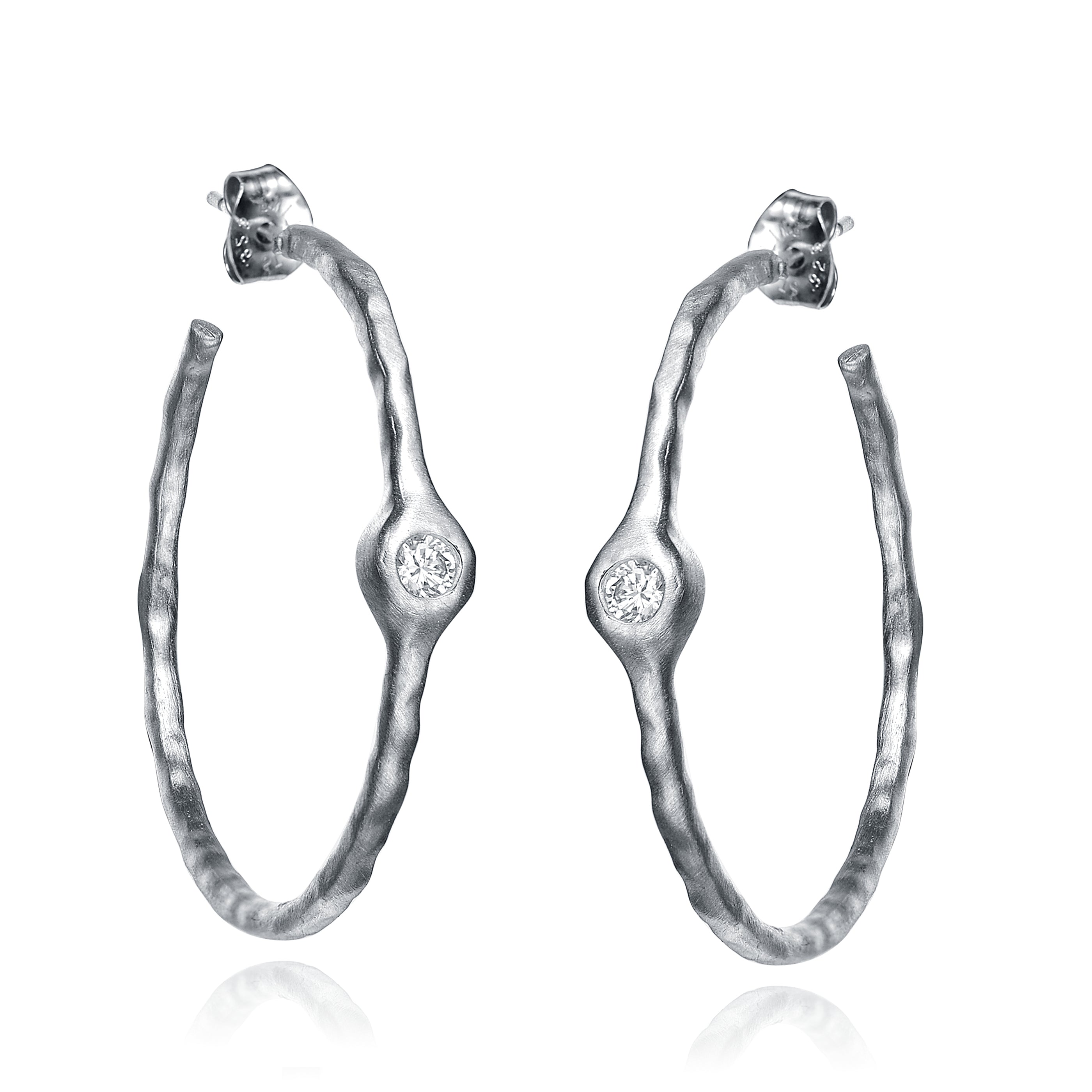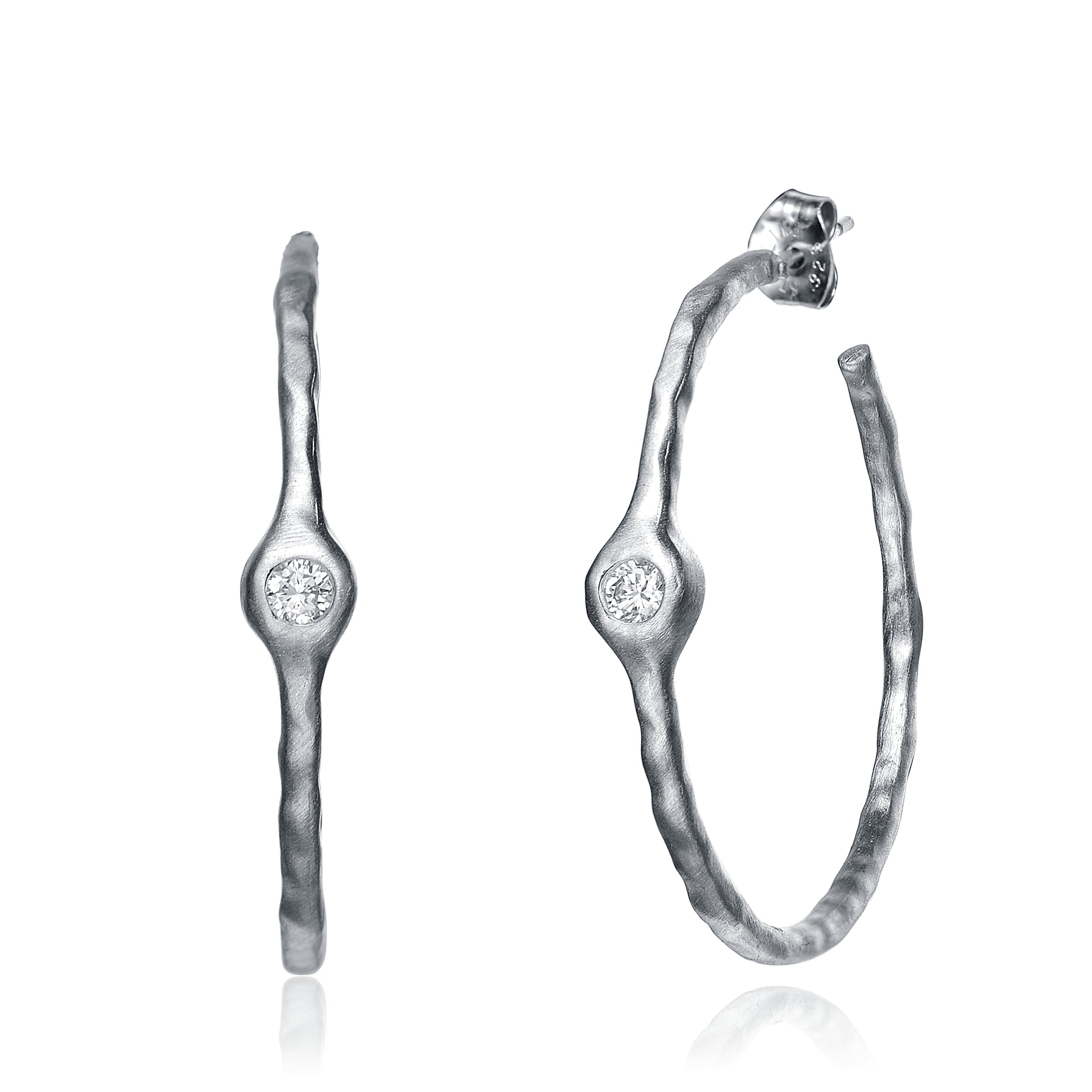 These hoop earrings are decorated with dazzling round-cut cubic zirconia stones in bezel settings. Crafted of .925 sterling silver, the earrings secure with butterfly clasps.