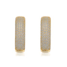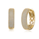Sterling Silver 14k Gold Plated Cubic Zirconia Pave Hoop Earrings. These brightly polished 14k gold plated sterling silver hoops feature round brilliant cut cubic zirconia pave set on the front, highlighting the beautiful silhouette of these earrings, adding a touch of glamor to your wardrobe with fire and glamor. A fully caged interior with openwork denote attention to detail. A hinge back makes these shiny hoops easy to place on and remove from the ears.