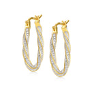 An entwined design gives these brightly polished oblong hoop earrings incredible dimension and fire. Sparkling round brilliant cut -like cubic zirconias are pave set in between each twisted rope. Click-top posts keep these 14k gold plated sterling silver hoops secure.