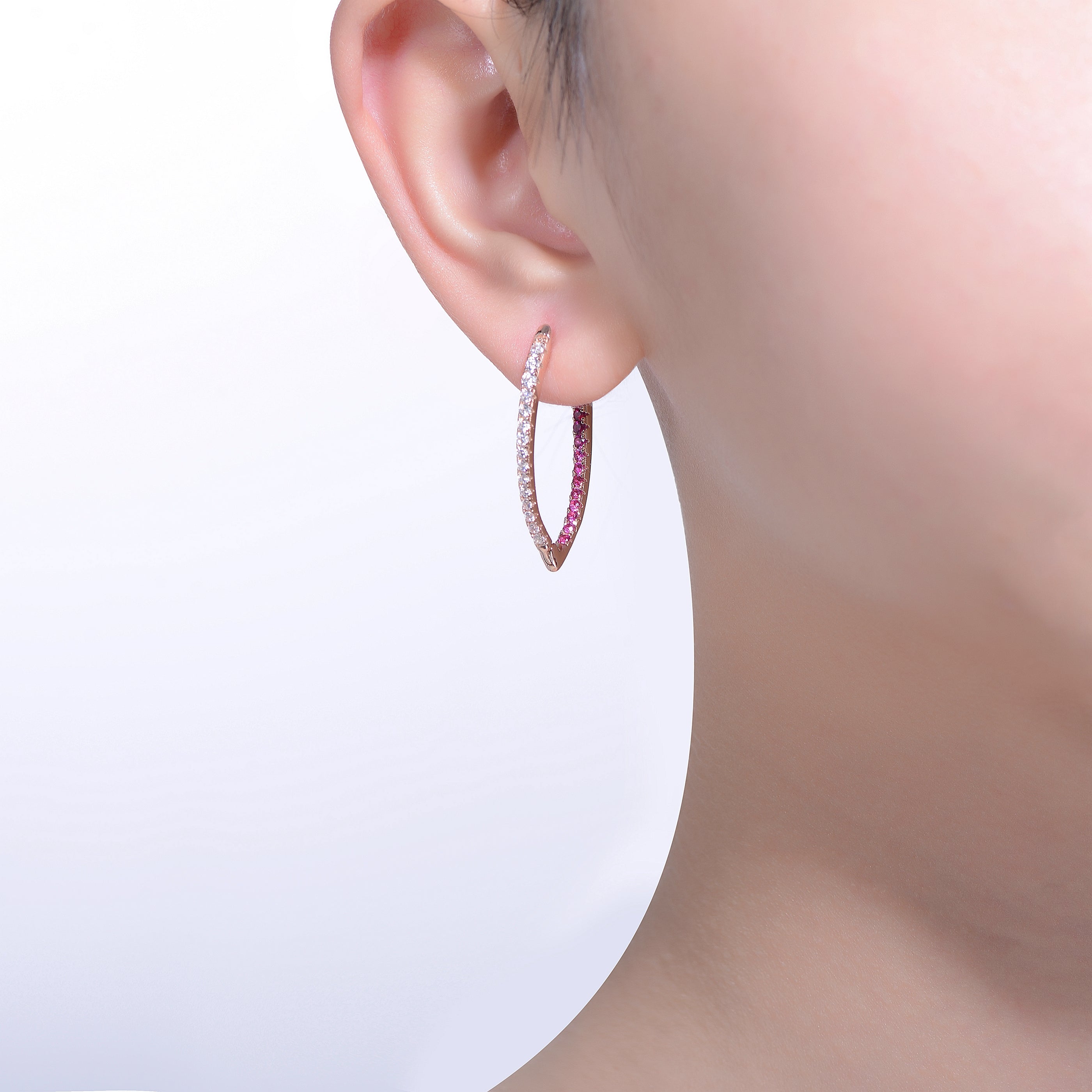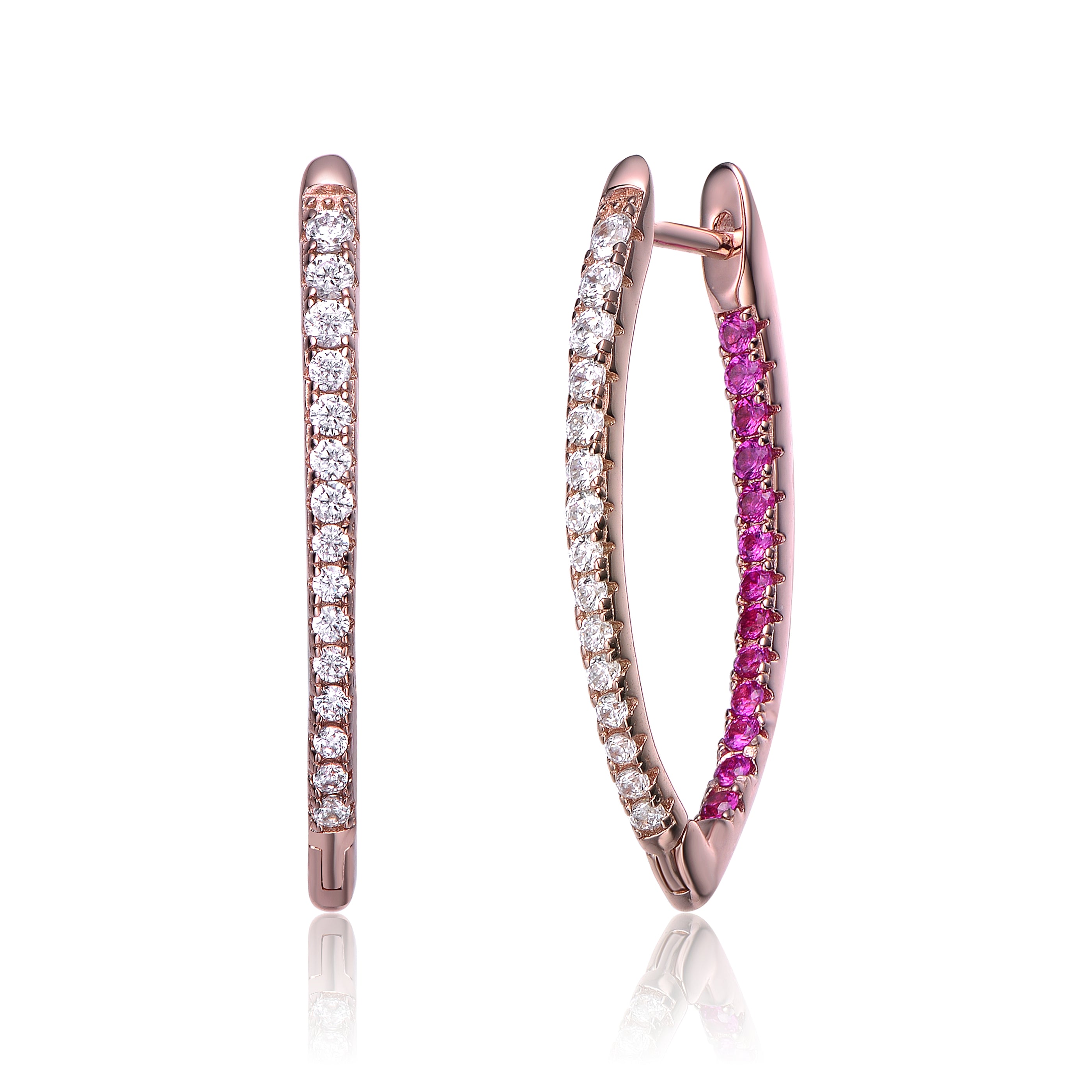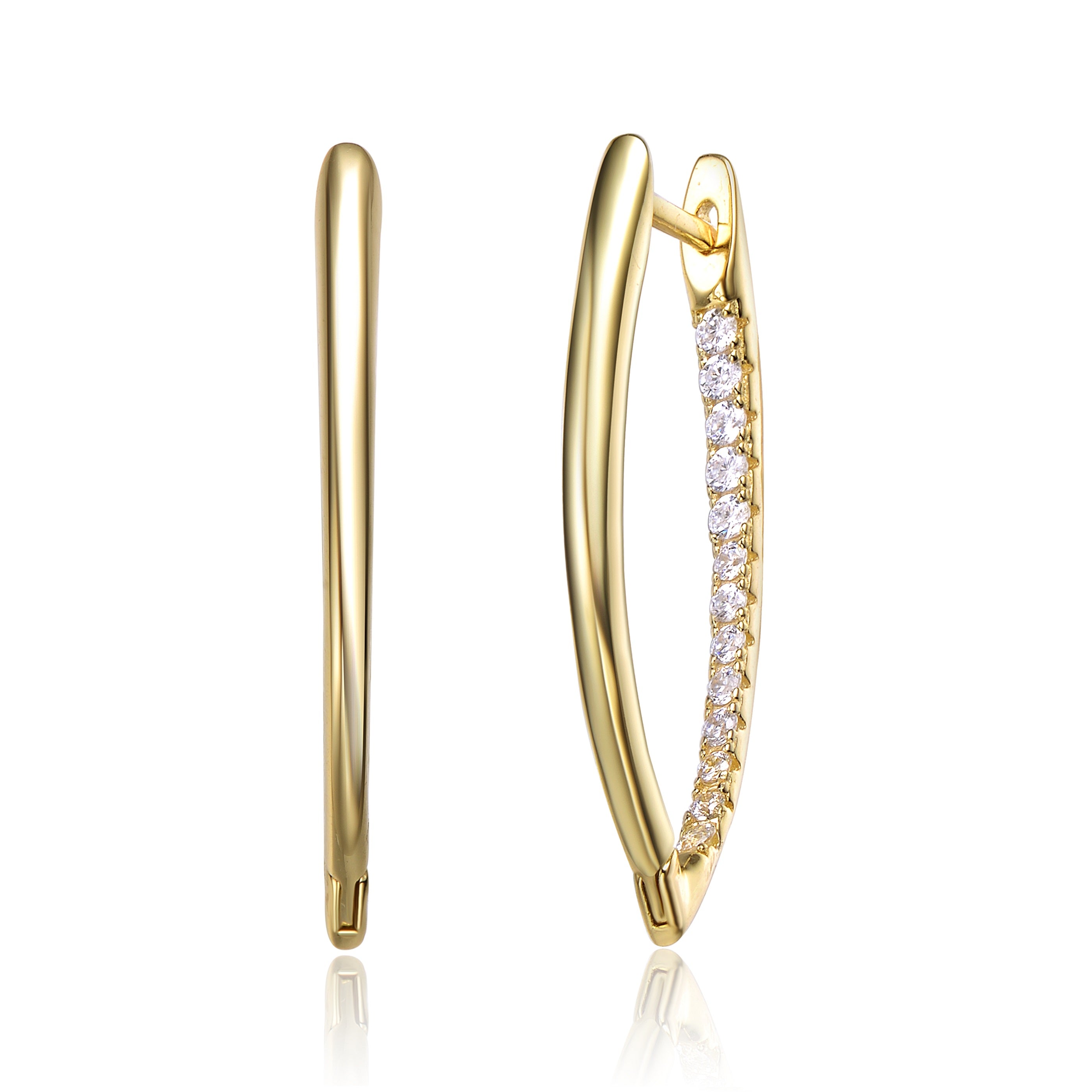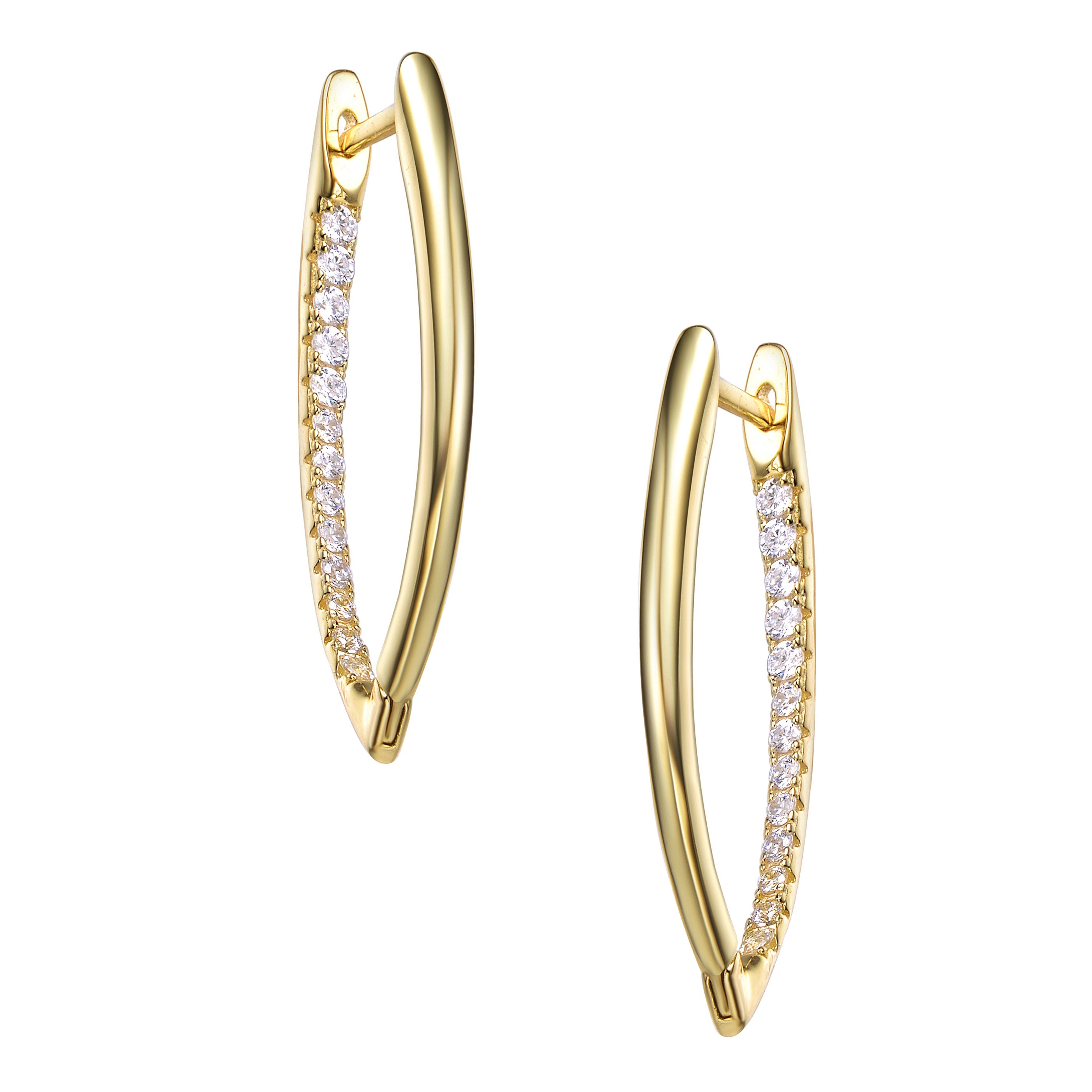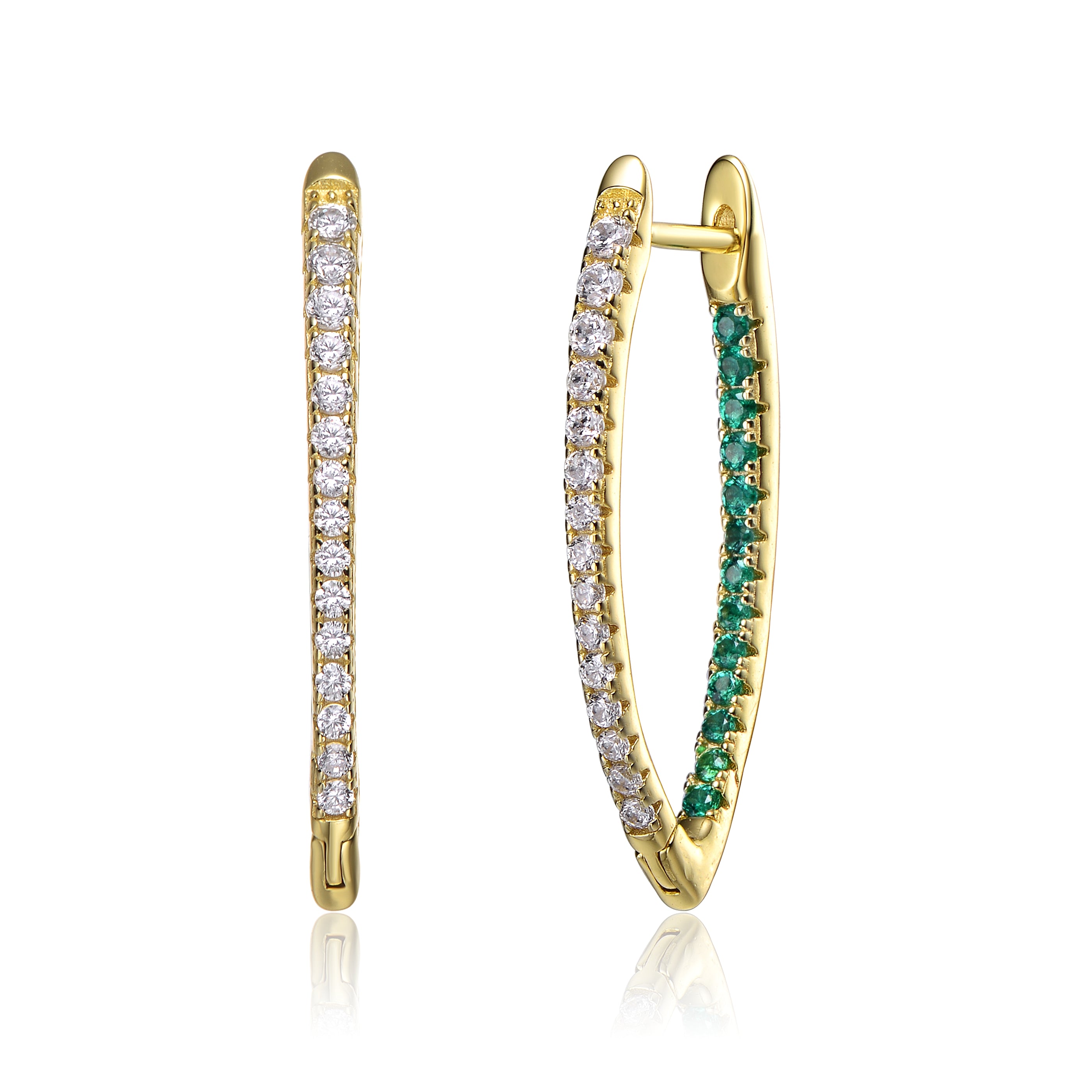 Sparkling round brilliant cut -like cubic zirconias and emerald-like cubic zirconias fill the inside and outside of each marquise-shaped hoop, giving them a luxurious vibrancy. Hinged posts secure these elegant earrings finely crafted in brightly polished 14k yellow gold plating over sterling silver. Available in different stone color options.