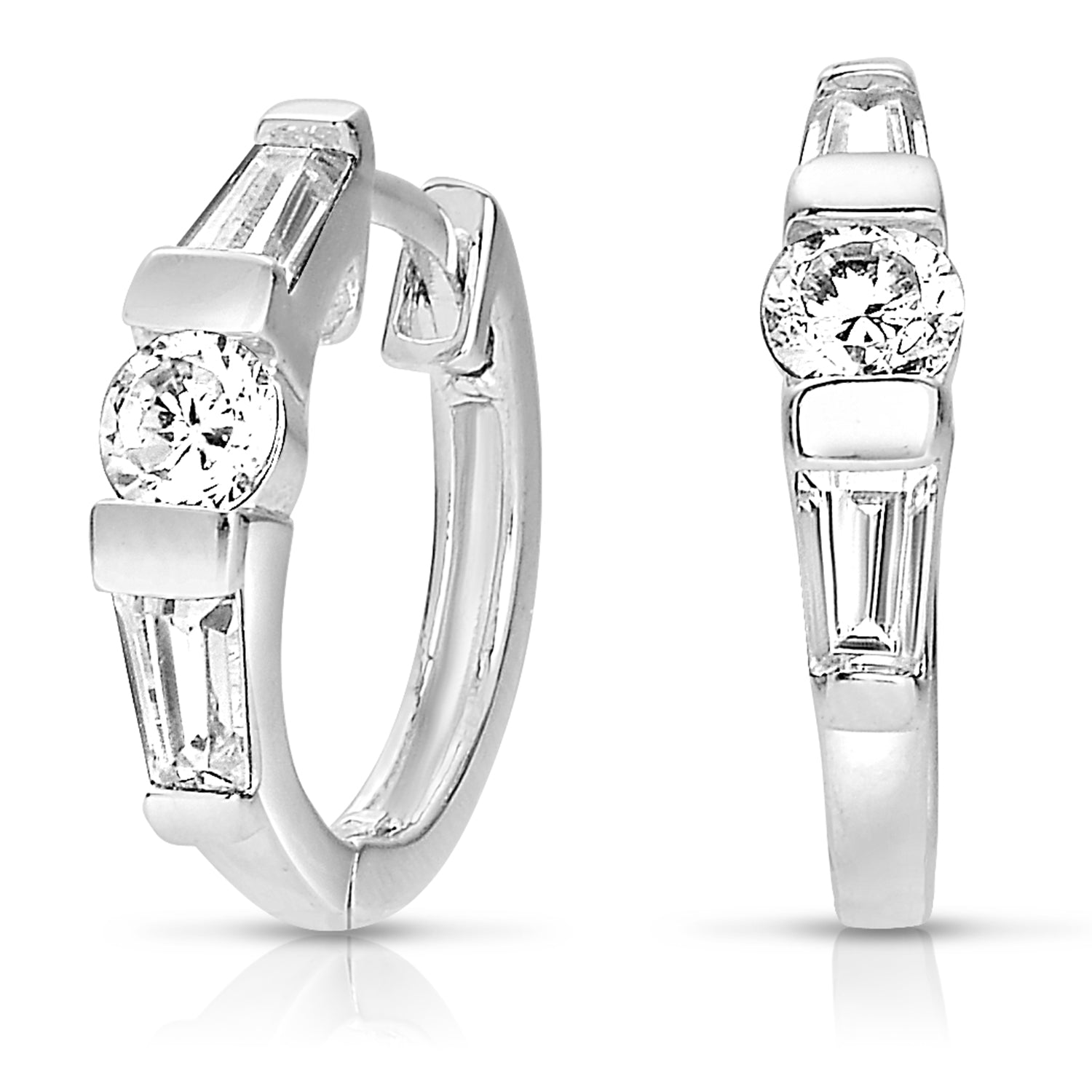 At the center of these traditional sterling silver hoops are dazzling cubic zirconia solitaires, accented by two rectangular shaped cubic zirconia stones. These hoops offer a versatile look that can accommodate both night and day occasions.