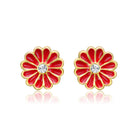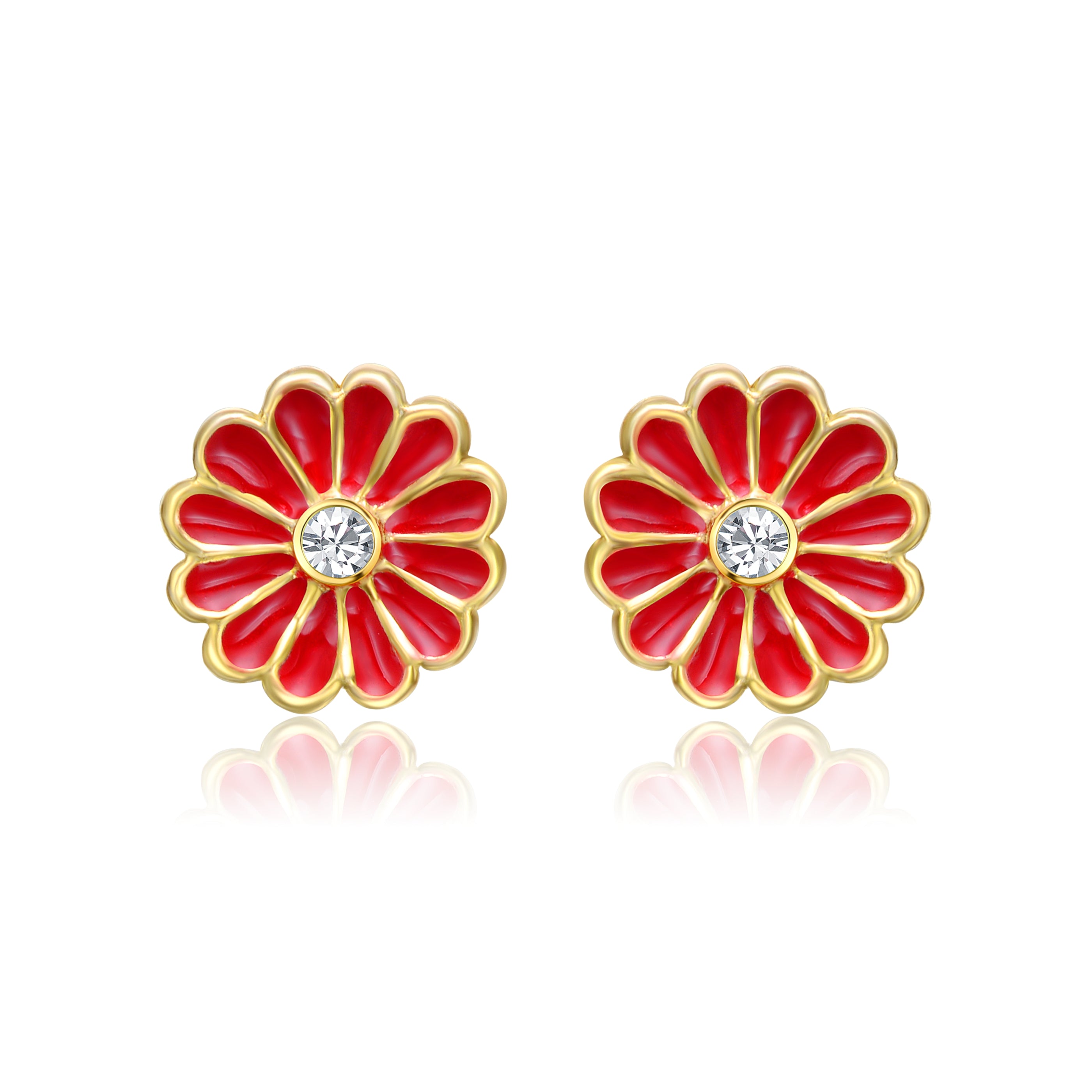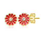 14k Gold Plated Clear Cubic Zirconia & Red Enamel Flower Stud Earrings