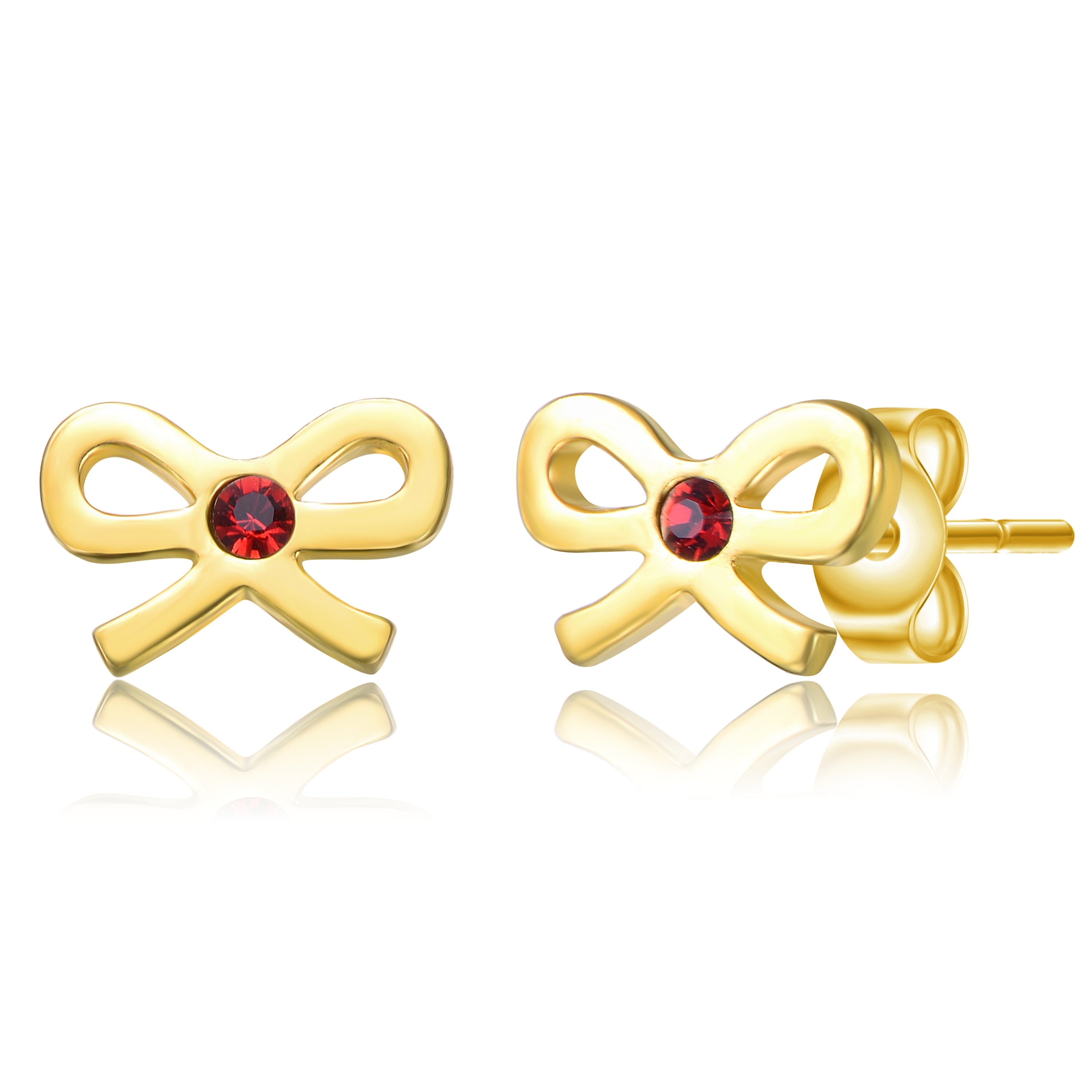 14k Gold Plated Red Velvet cubic zirconia Ribbon Bow Tie Stud Earrings. All wrapped up and ready for gifting! These 14k gold plated stud earrings feature round-cut red velvety cubic zirconia solitaire stones in the middle of ultra-shiny ribbon bow ties, adding vibrancy and unique style to these classically elegant little studs. Perfect for giving on a holiday, birthday, or any other time, these pretty stud earrings are held on by butterfly backs and make a great complement to any wardrobe.