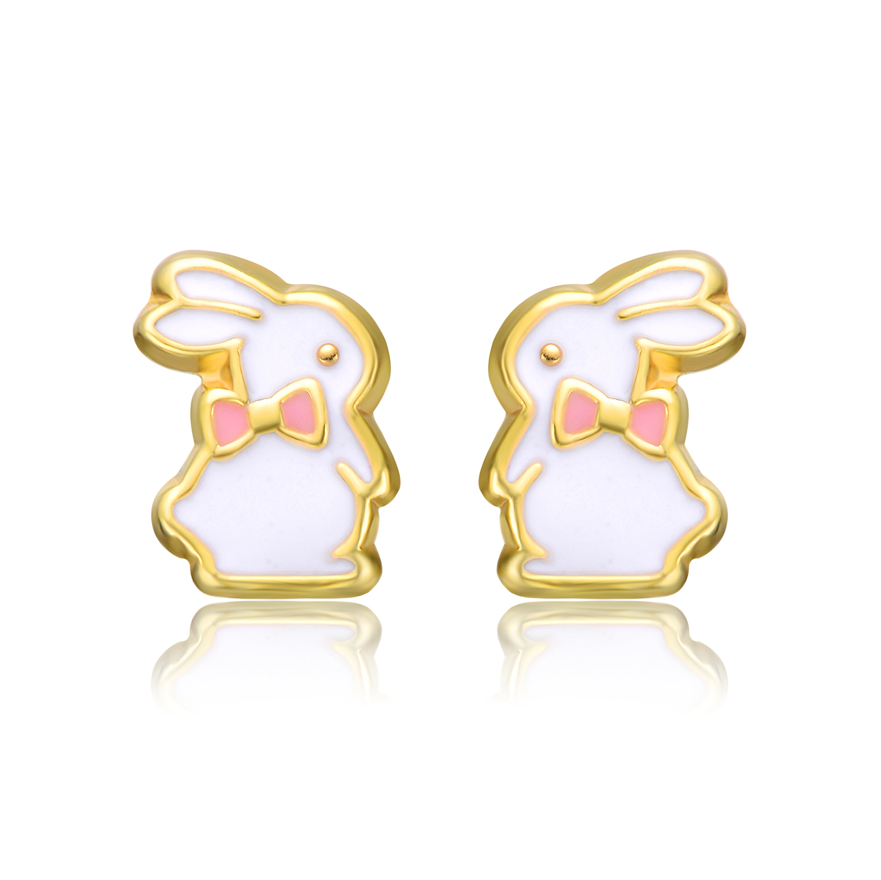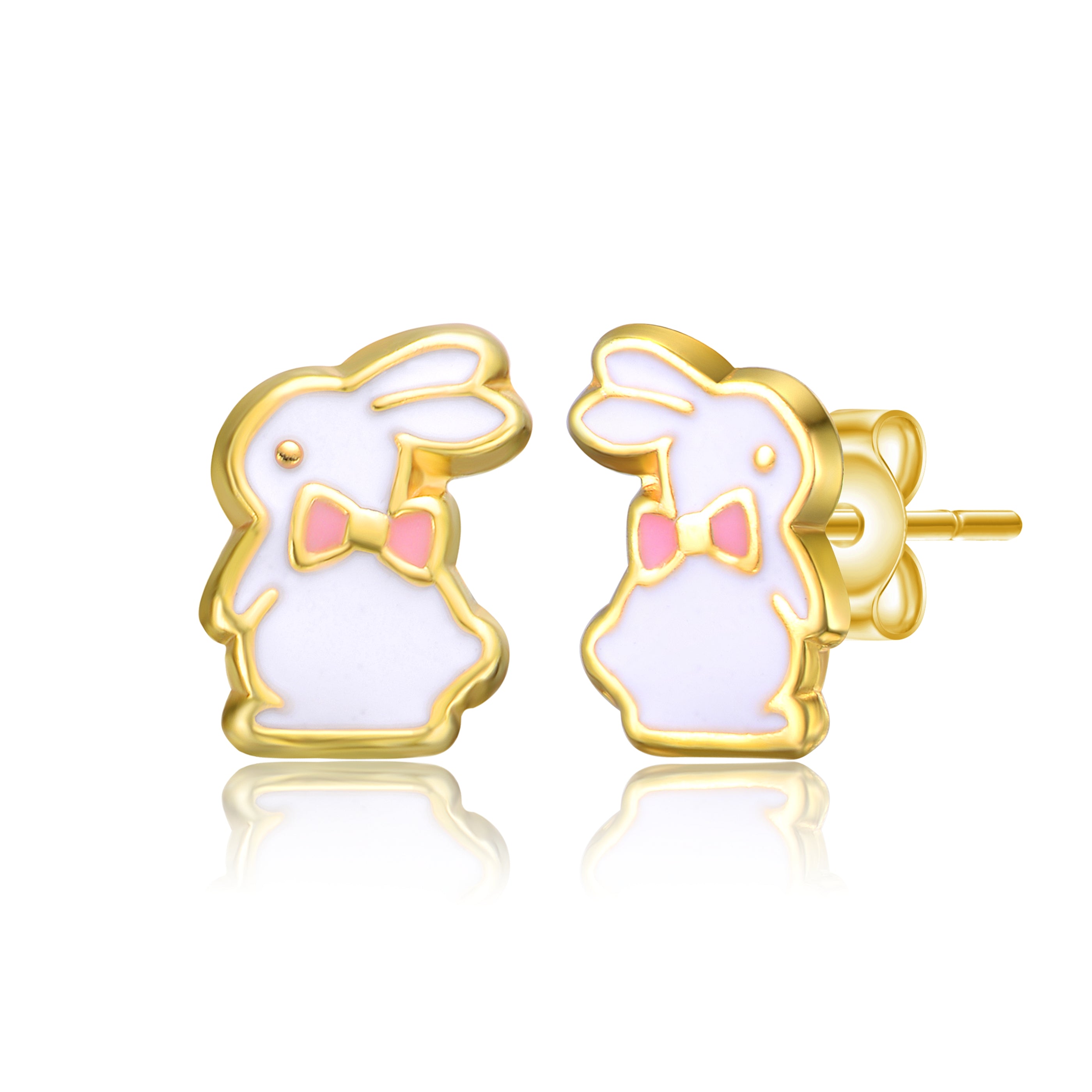 14k Gold Plated White Enamel & Pink Bow Tie Bunny Rabbit Stud Earrings. Bunny rabbits are so cute and cuddly, these 14k gold plated stud earrings are the ultimate reminder of these adorable creatures loved by all! Bright white enamel brings out the attentive detail of these bunny studs. A ribbon bow tie in soft pink gives these rabbits another level of eye-catching style, making them a treat to give on any holiday, birthday, or special occasion. Butterfly backs keep them in place, designed for pierced ears.