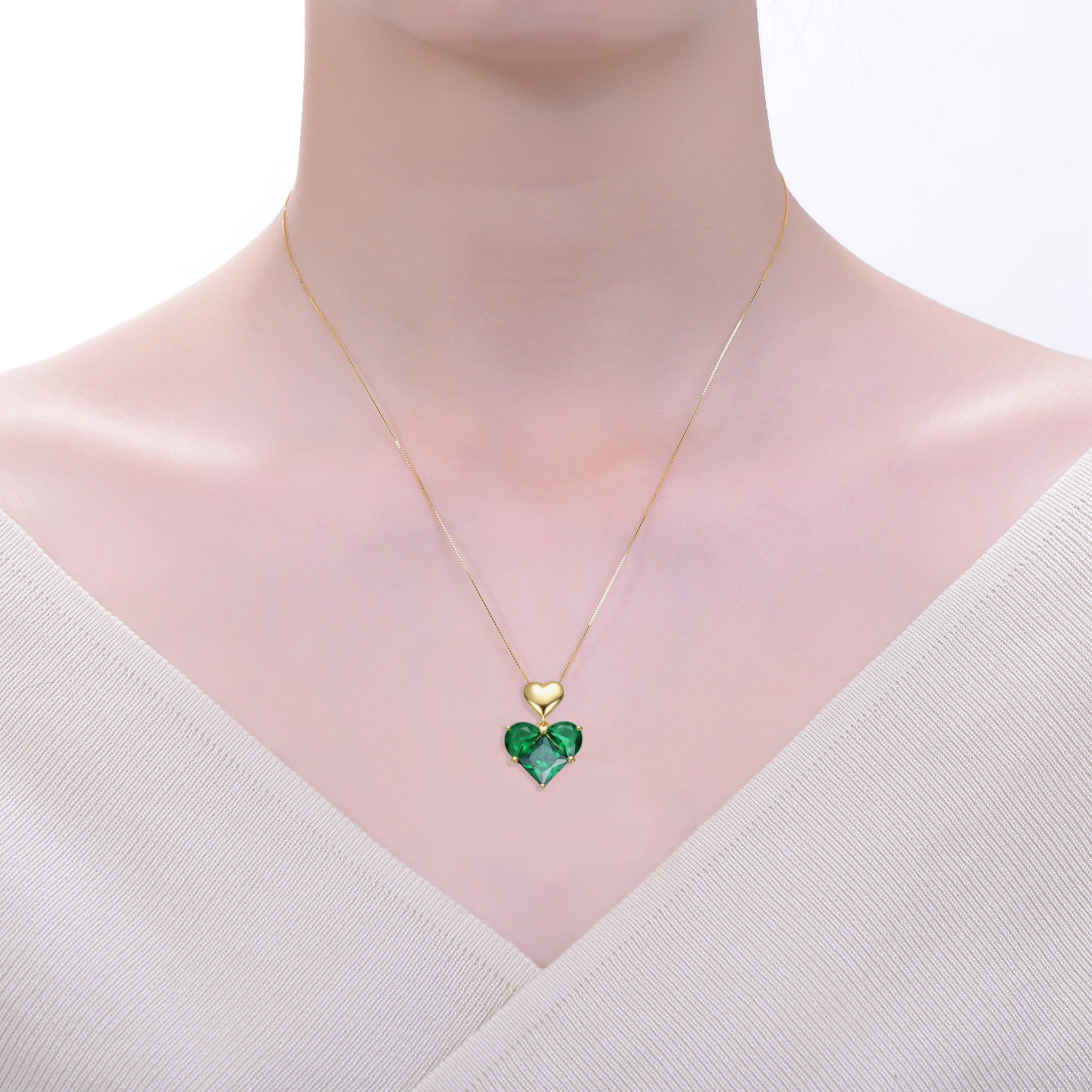 This romantic double heart pendant necklace features a vibrant green cubic zirconia heart paired with a polished gold heart accent above. The layered design creates dimension and visual interest while maintaining a refined, elegant silhouette. Perfect for everyday wear or meaningful gifting, it adds a pop of color with timeless sophistication.