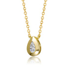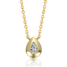Sterling Silver 14k Gold Plated Raindrop Pear-Shaped Cubic Zirconia Bezel Solitaire Necklace. A shimmering pear-shaped cubic zirconia bezel set in a tranquil raindrop pendant gives this necklace a contemporary style. A shiny cable chain connected on each side of the pendant allows it to sit centered on the durable yet graceful chain; all elegantly crafted in a durable 14k gold plated sterling silver finish. A secure lobster clasp keeps this timeless pendant necklace in place, making it easy to place on and remove. Chain measures 16+2"