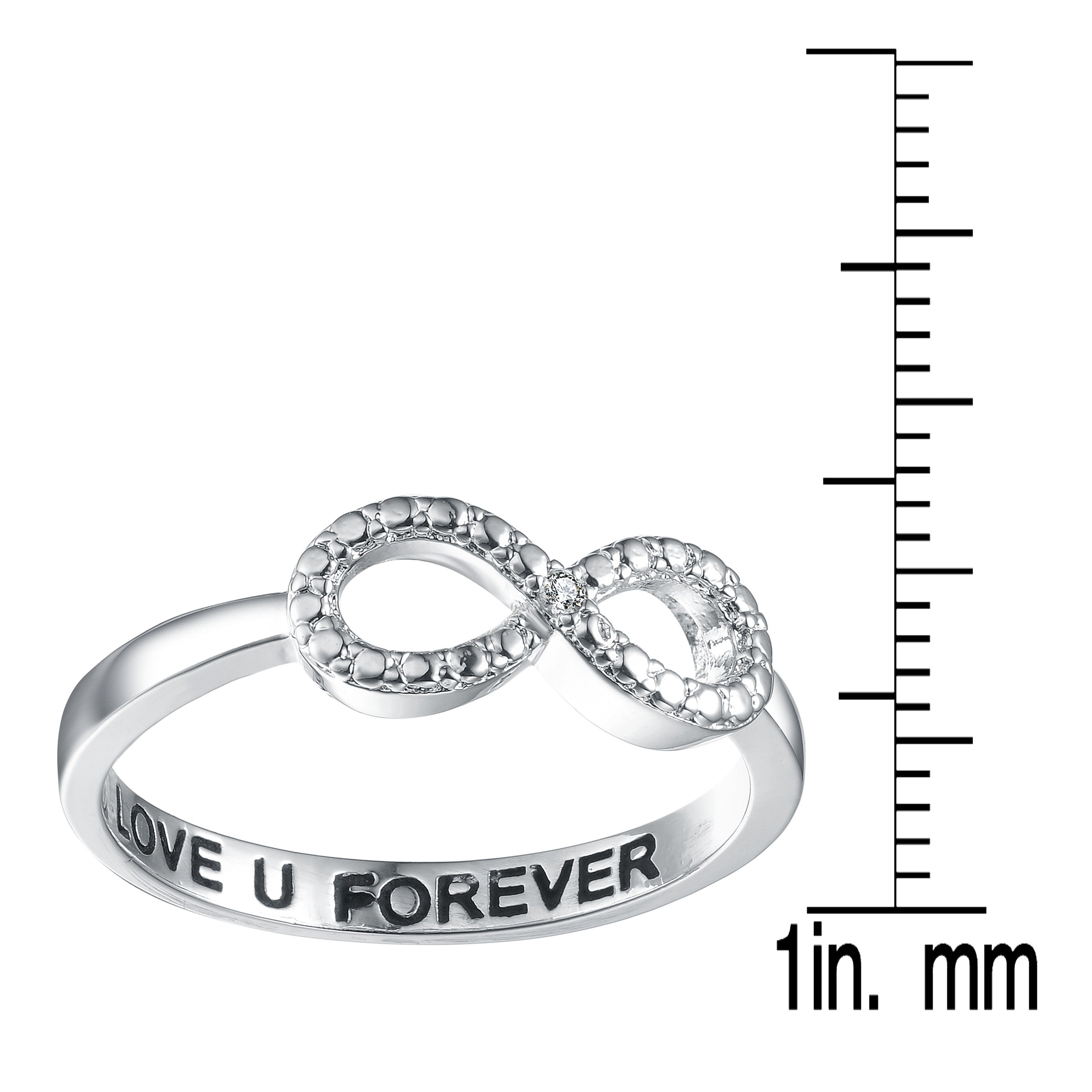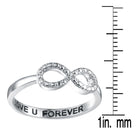 This lovely infinity ring feaures dazzling white round-cut cubic zirconia stones. The ring is crafted of .925 sterling silver, and is engraved "I Love You Forever"