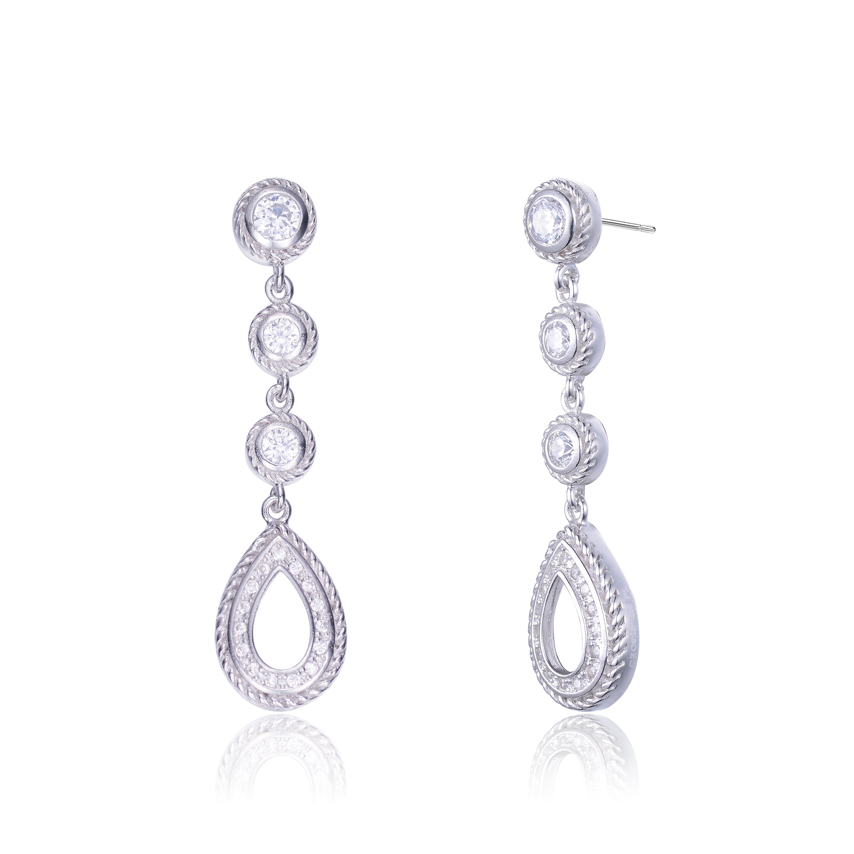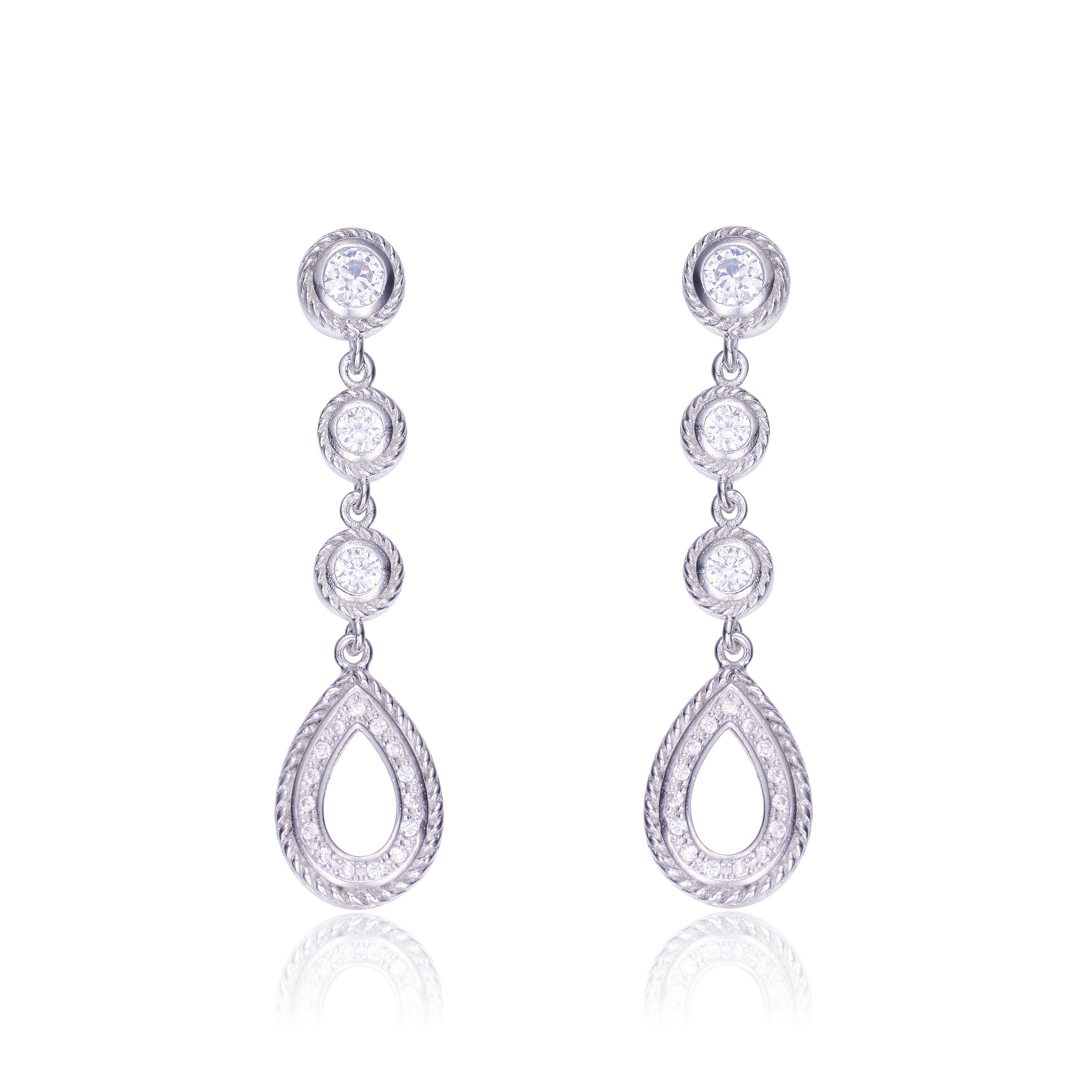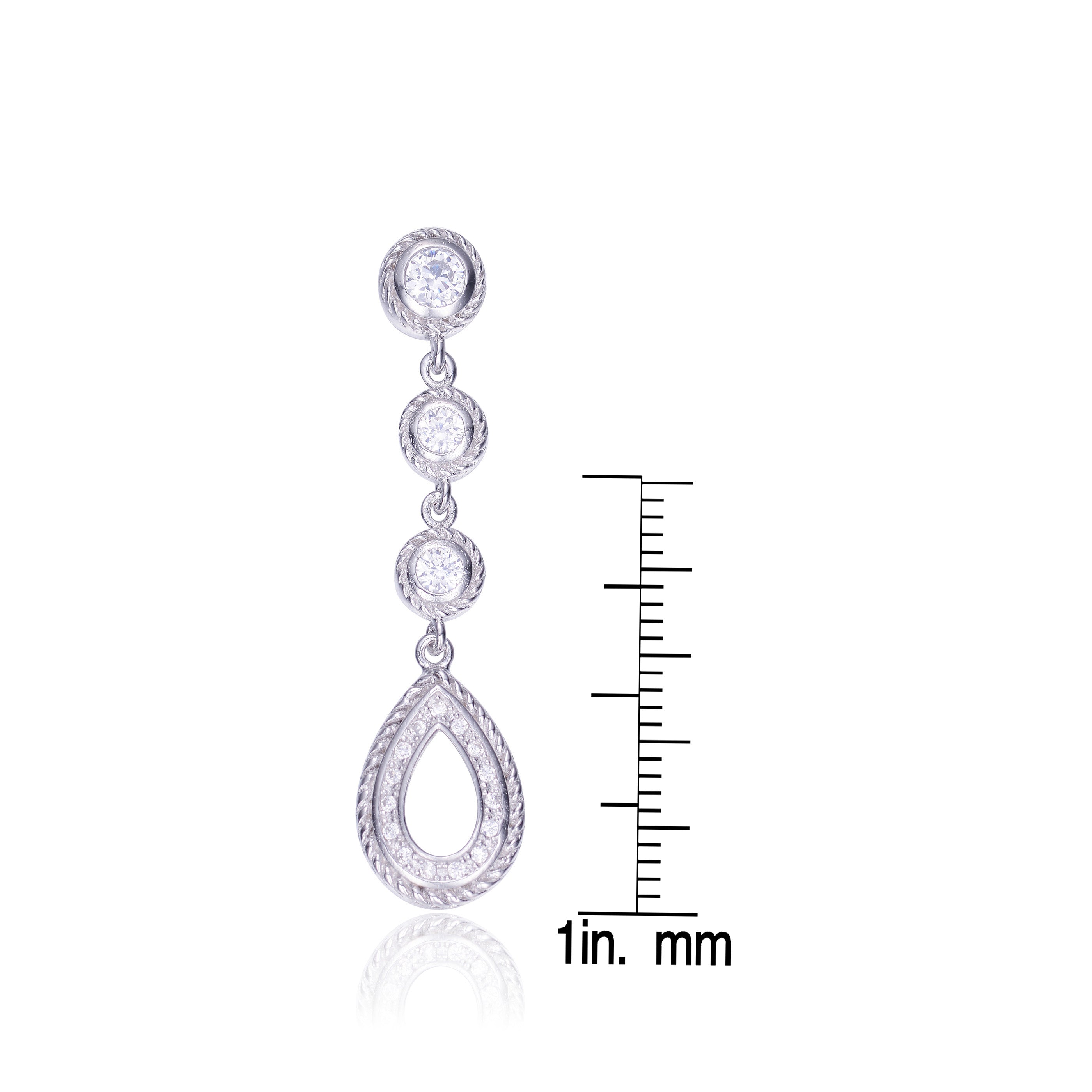 These gorgeous pear dangle earrings are decorated with white round-cut cubic zirconia stones. Crafted of .925 sterling silver, the earrings secure with butterfly clasps.