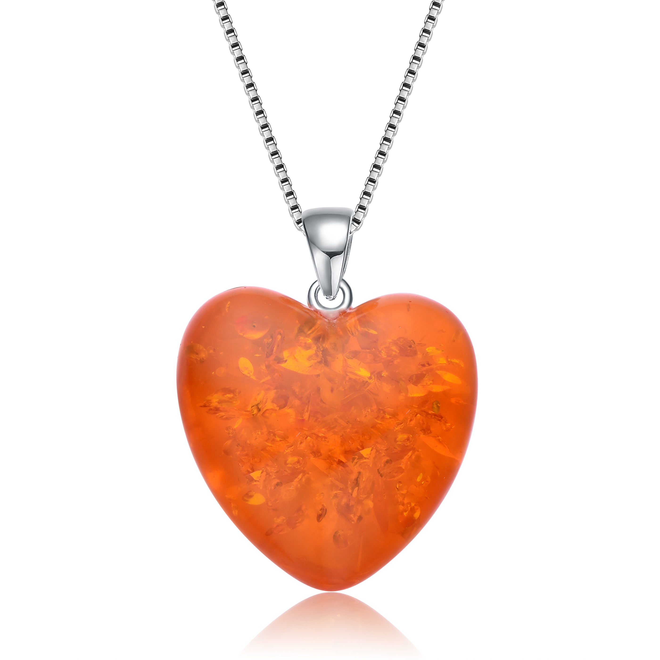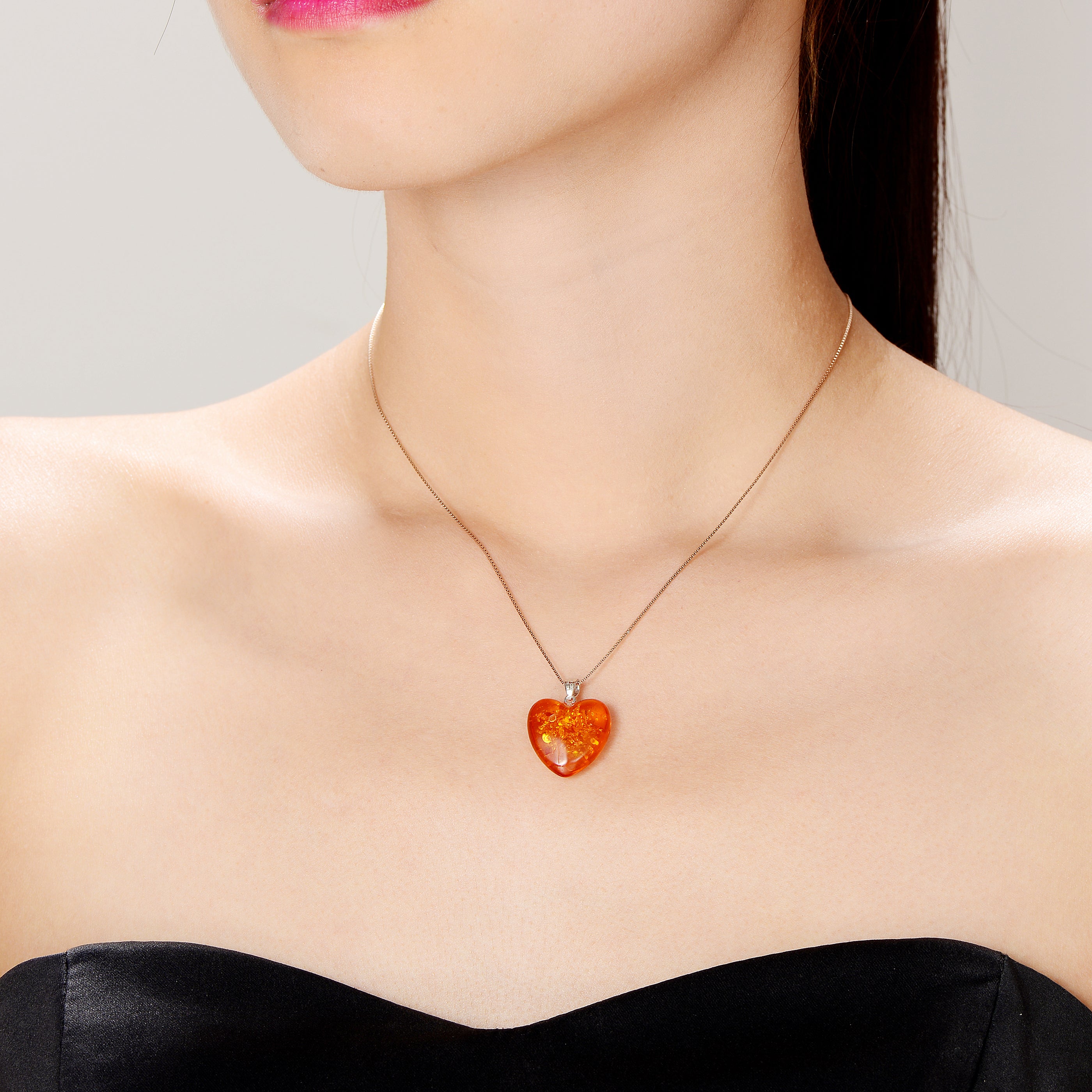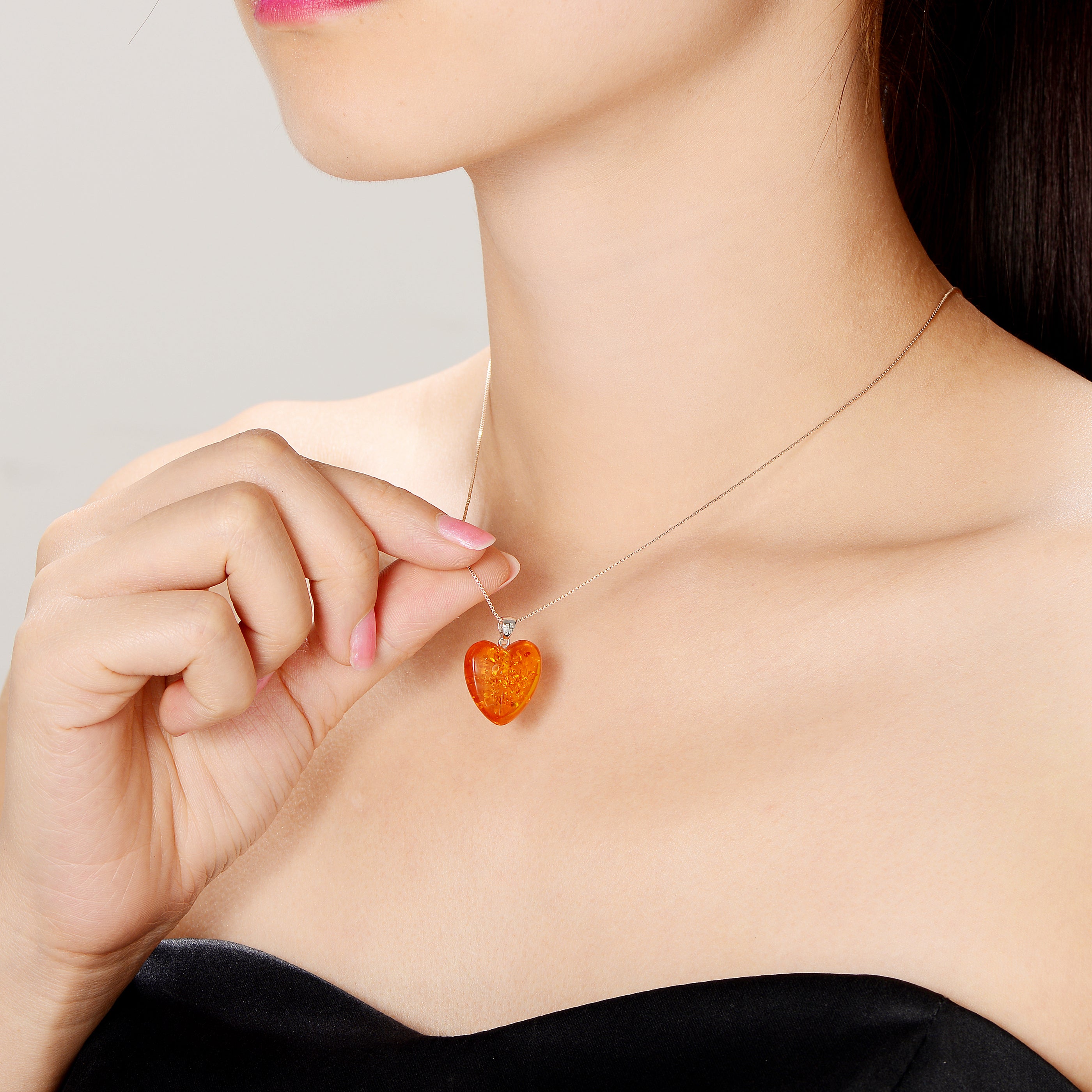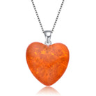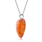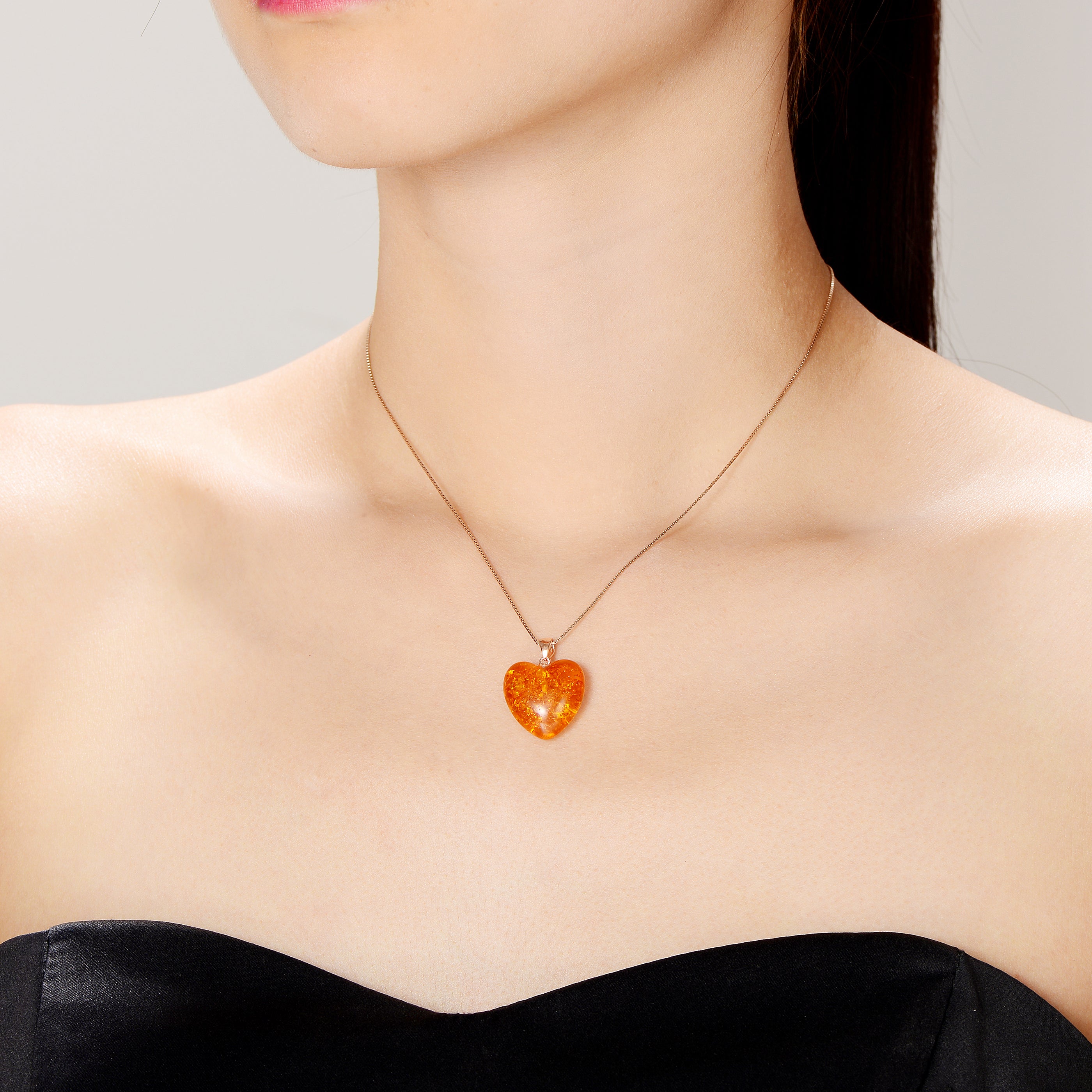 This is a glowing orange-colored heart pendant with a luscious orange cubic zirconia gemstone. This sterling silver pendant is simple yet very stylish as it looks like it is going to bleed juice; the huge heart is strung on a simple sterling silver clasp that is hung on a simple silver chain necklace.
