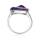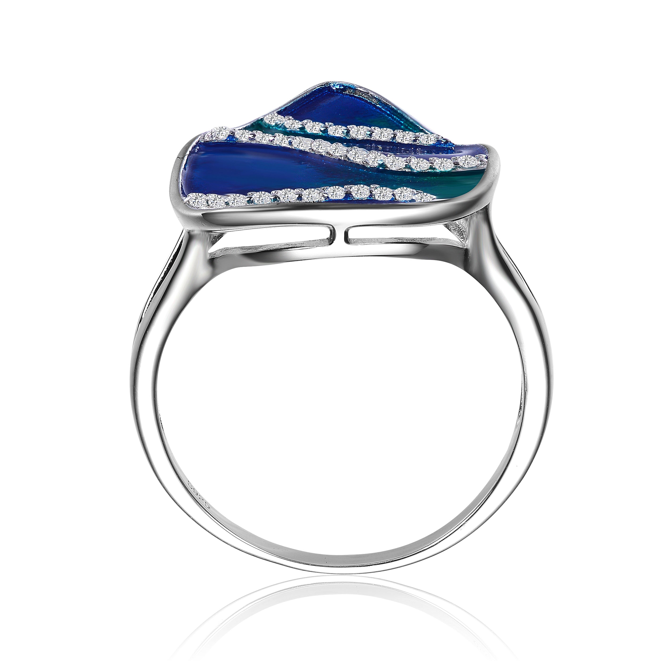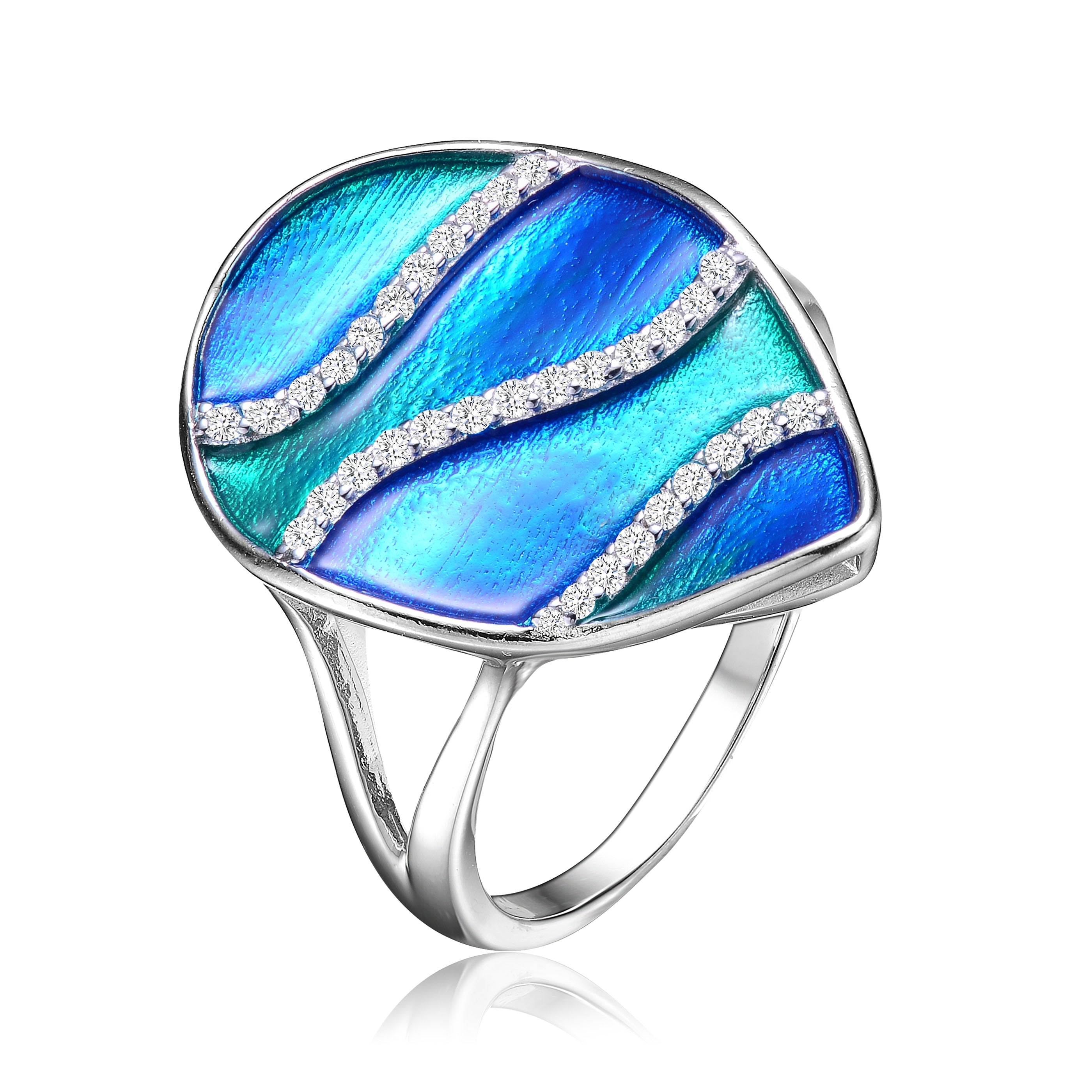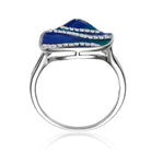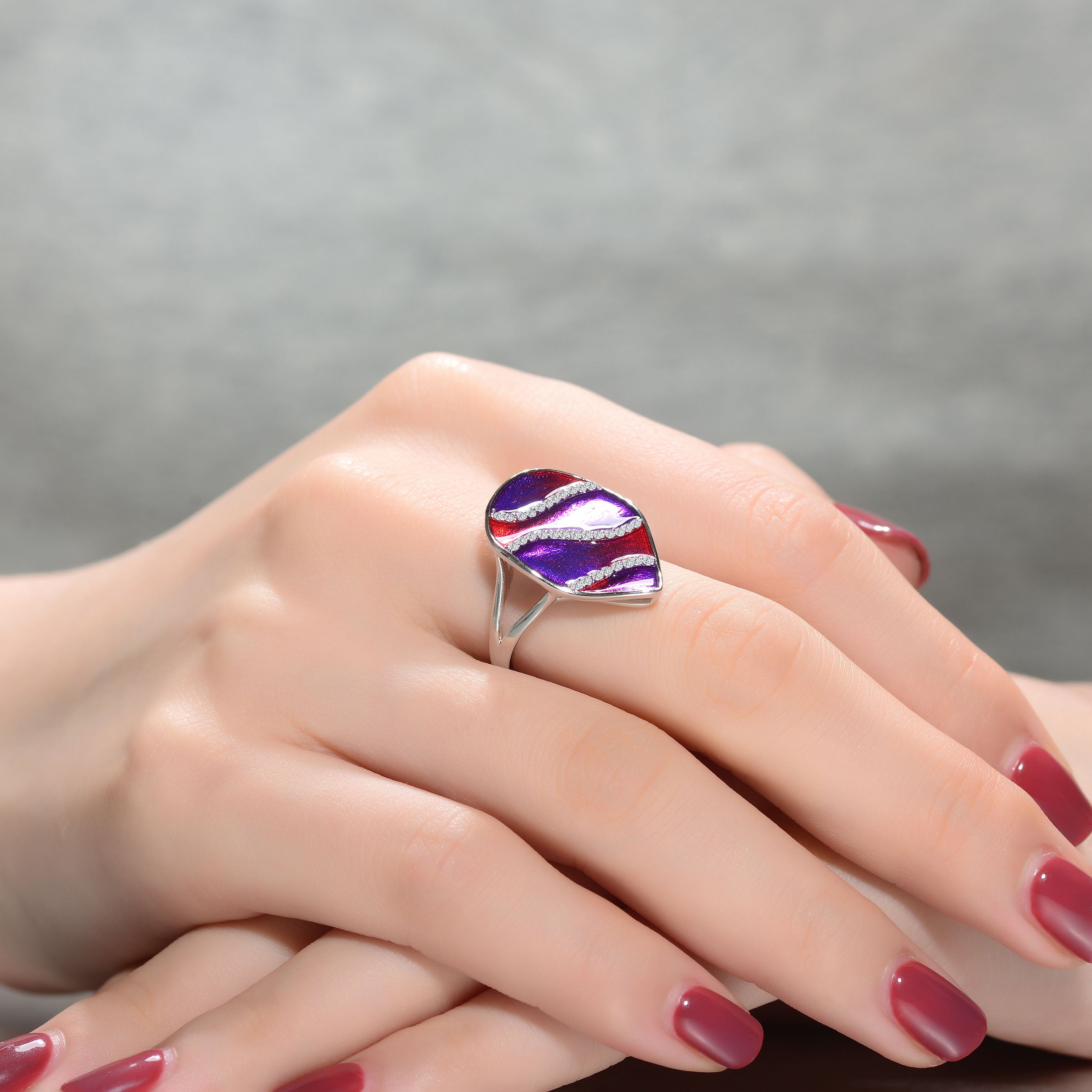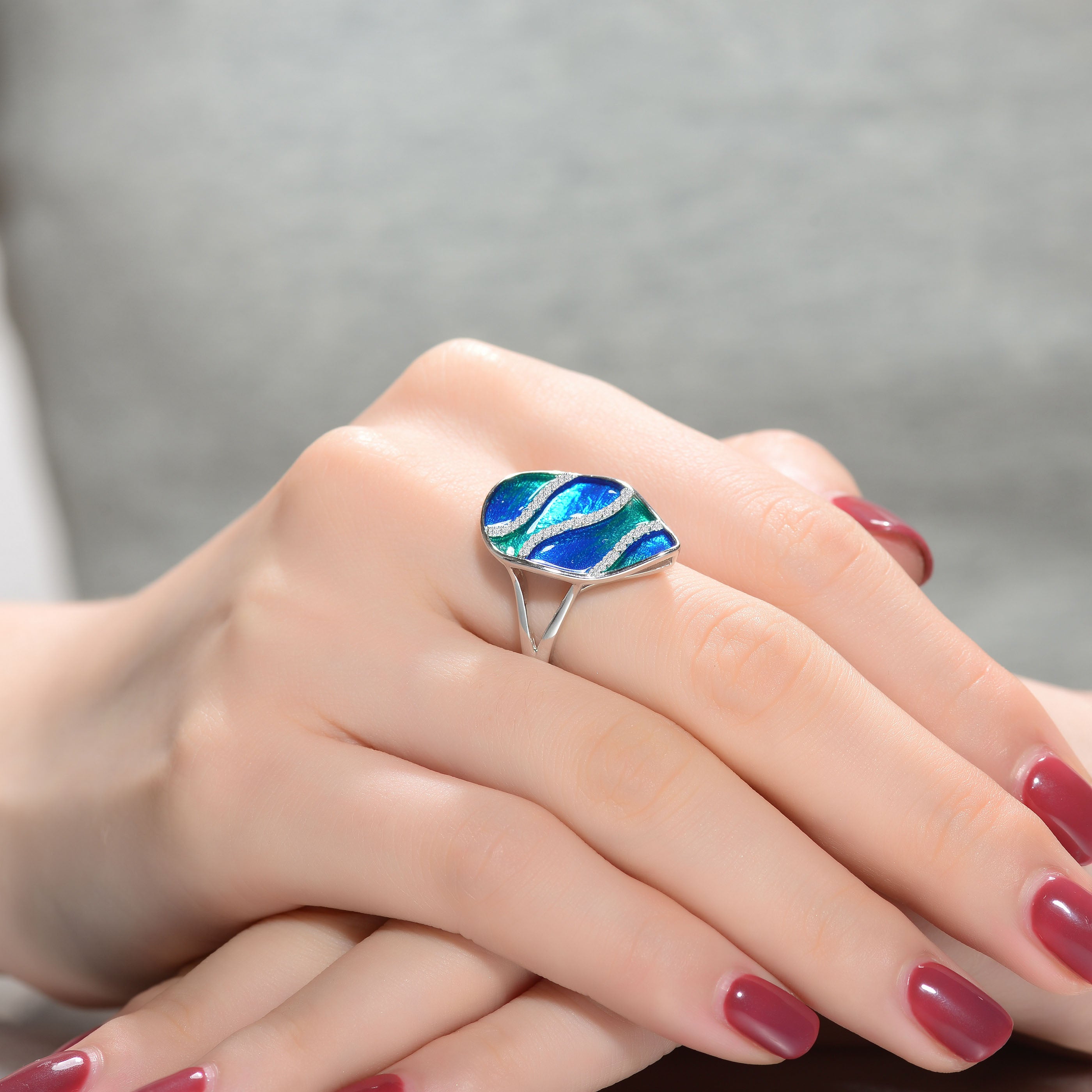 This exquisite pear shaped Sterling silver with Rhodium plated cocktail ring will surely complement your look. Vibrant olors of blue and green are mixed and used together to create a beautiful swirl in this ring's enamel glass. Several small clear round Cubic Zirconia are used to accentuate and add sparkle in this cocktail ring. This ring is a size 7.