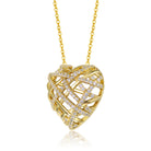 Sterling Silver 14k Yellow Gold Plated with Cubic Zirconia Knotted Ribbon 3D Puffed Heart Pendant Necklace. Sparkling round brilliant cut -like cubic zirconias prong set in ribbons give this 3D puffed heart an open criss-cross knotted design. A cable link chain connects to the top of the heart on both sides, allowing it to sit centered when worn. A secure lobster clasp keeps this modern heart necklace in place. Layer this pretty necklace or wear it solo with its stylistic versatility.