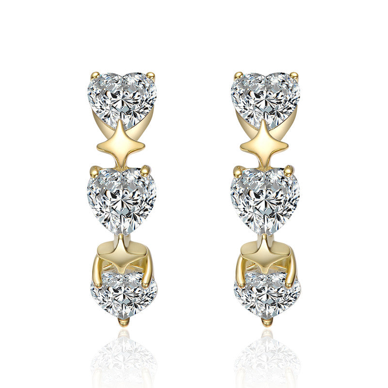 These hoop earrings combine playful charm with timeless elegance. Crafted in sterling silver and finished with radiant 14K gold plating, each hoop features three cascading heart-shaped clear cubic zirconia stones that catch the light beautifully. Lightweight and comfortable, they add sparkle to everyday outfits or special occasions, making them a radiant addition to any jewelry collection or a thoughtful gift for someone you love.