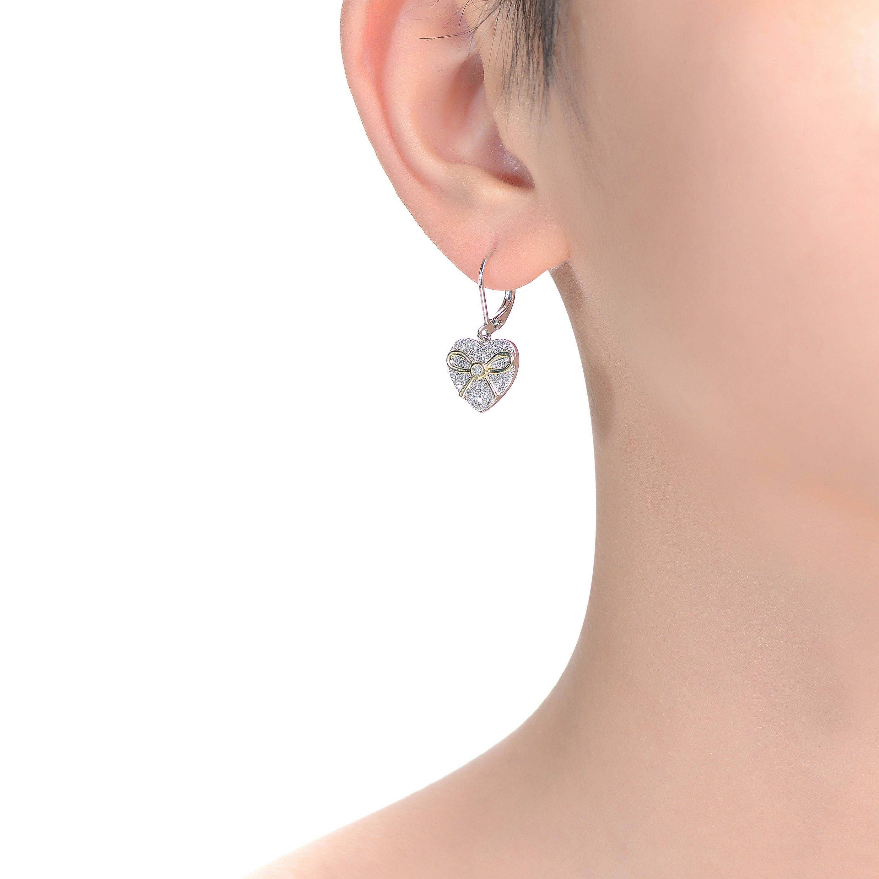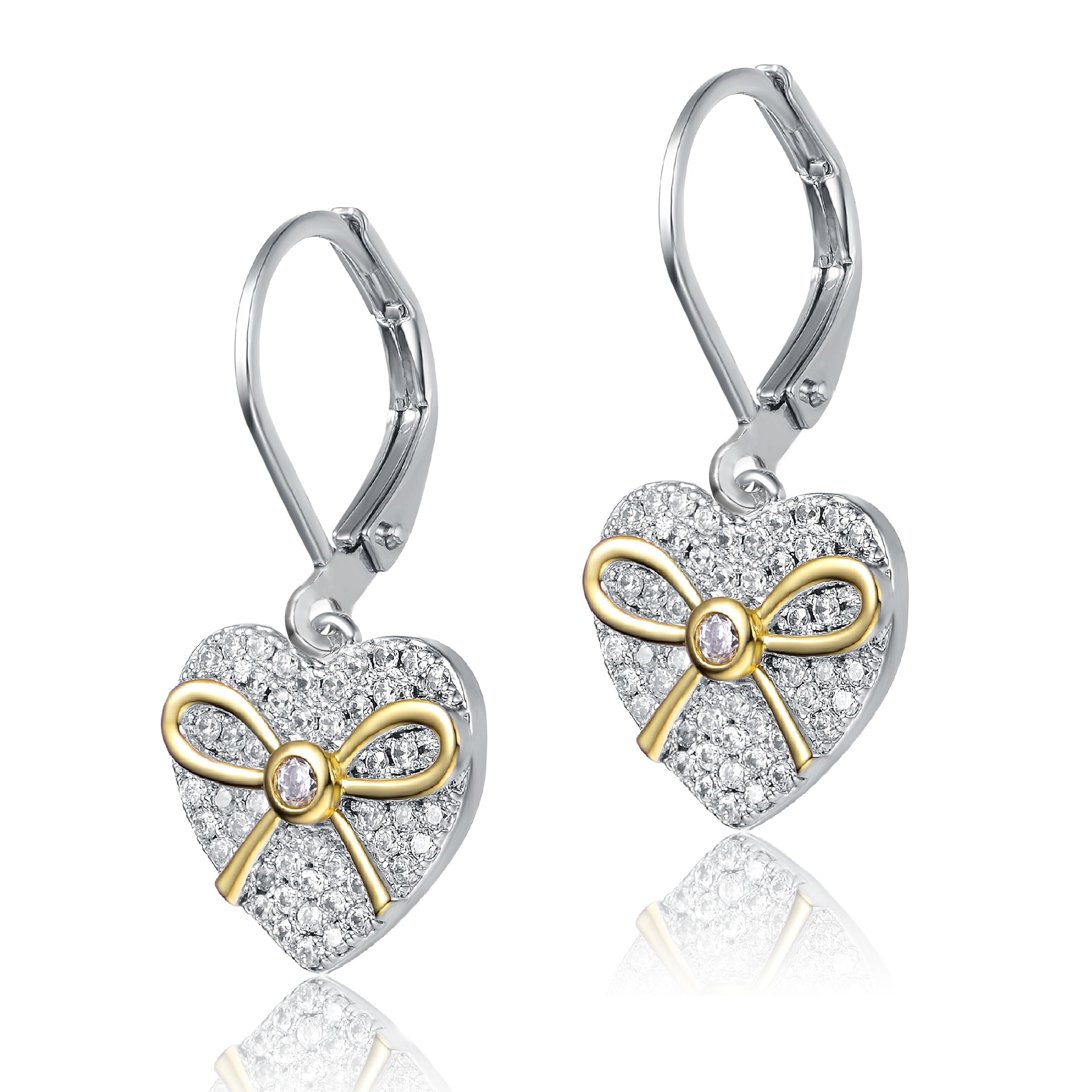 Stylish Sterling Silver Rhodium and Gold Plated with Clear Cubic Zirconia Heart Earrings. The design features center of gold plated bow-tie surrounded by clear round Cubic Zirconia stones paved on metal base, forming a heart shape. These earrings are Sterling Silver with Rhodium and Gold plating and it is secured with leverback. Makes a great gift as well.