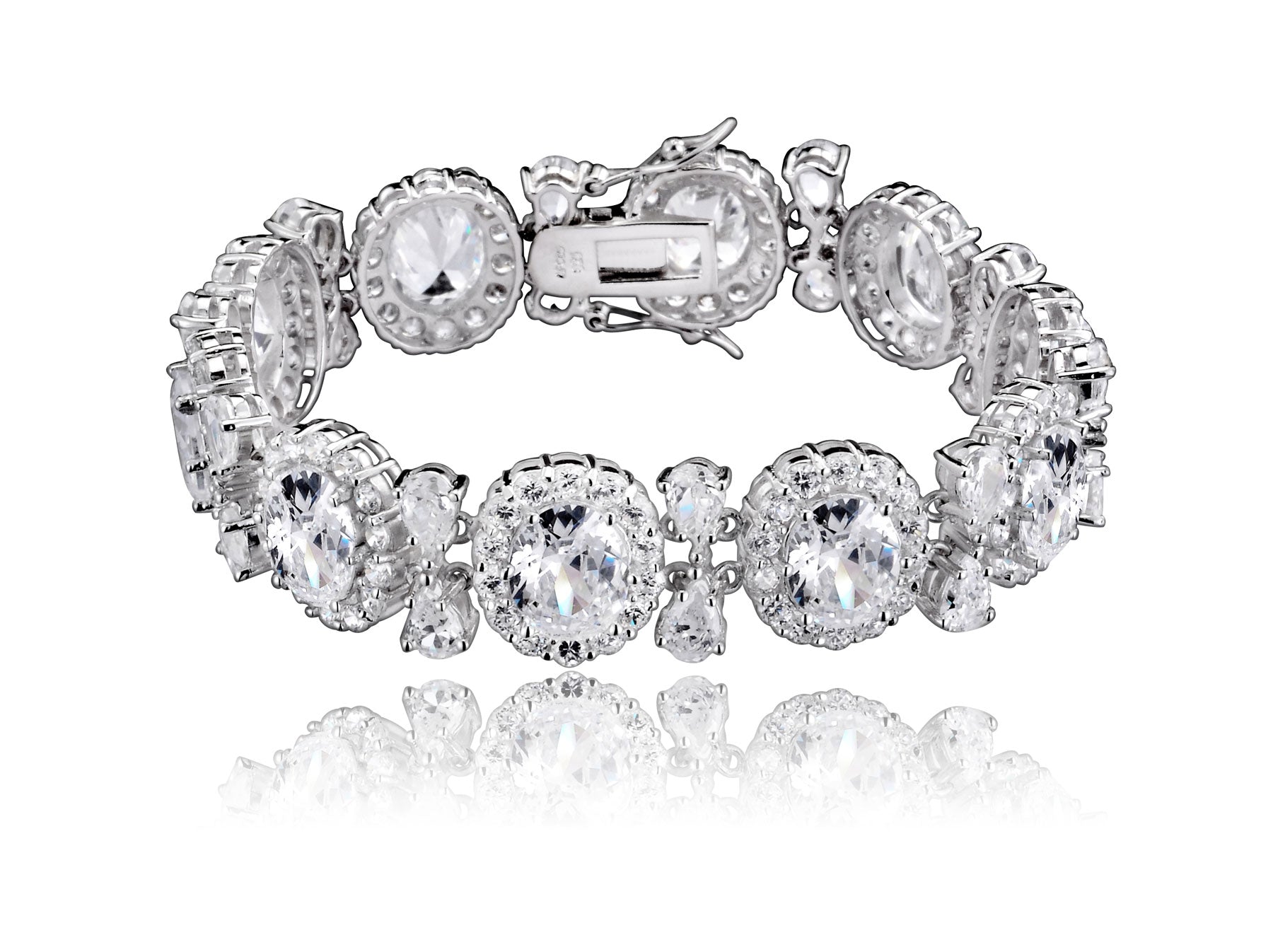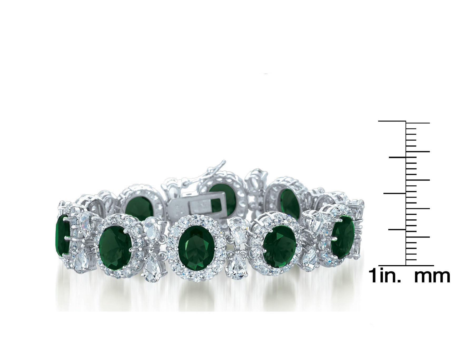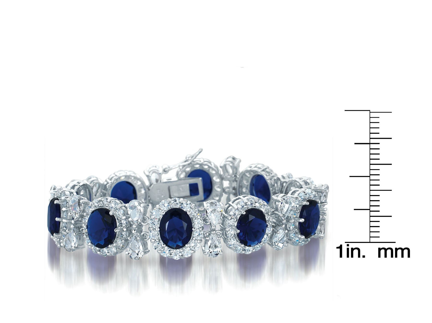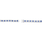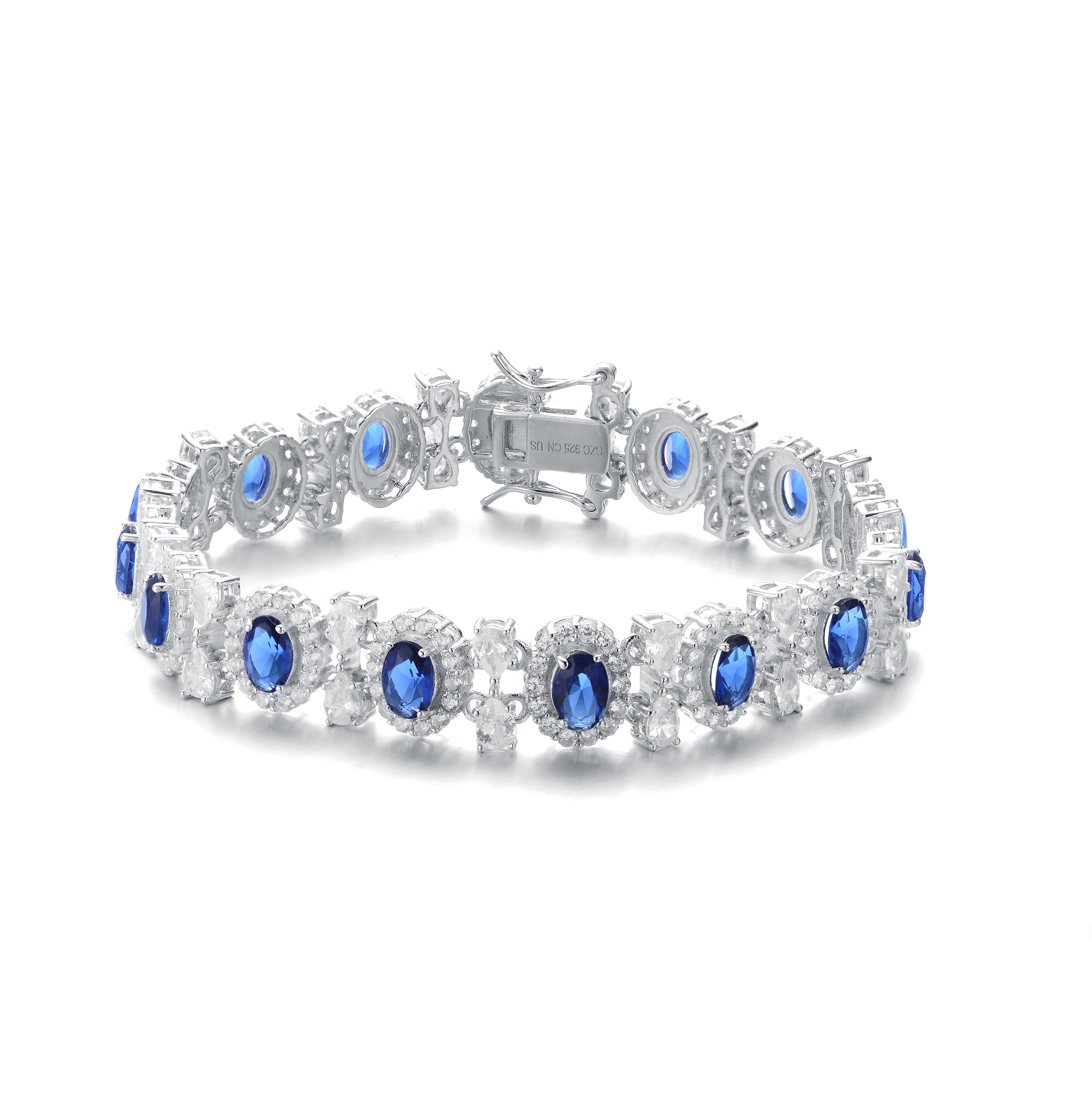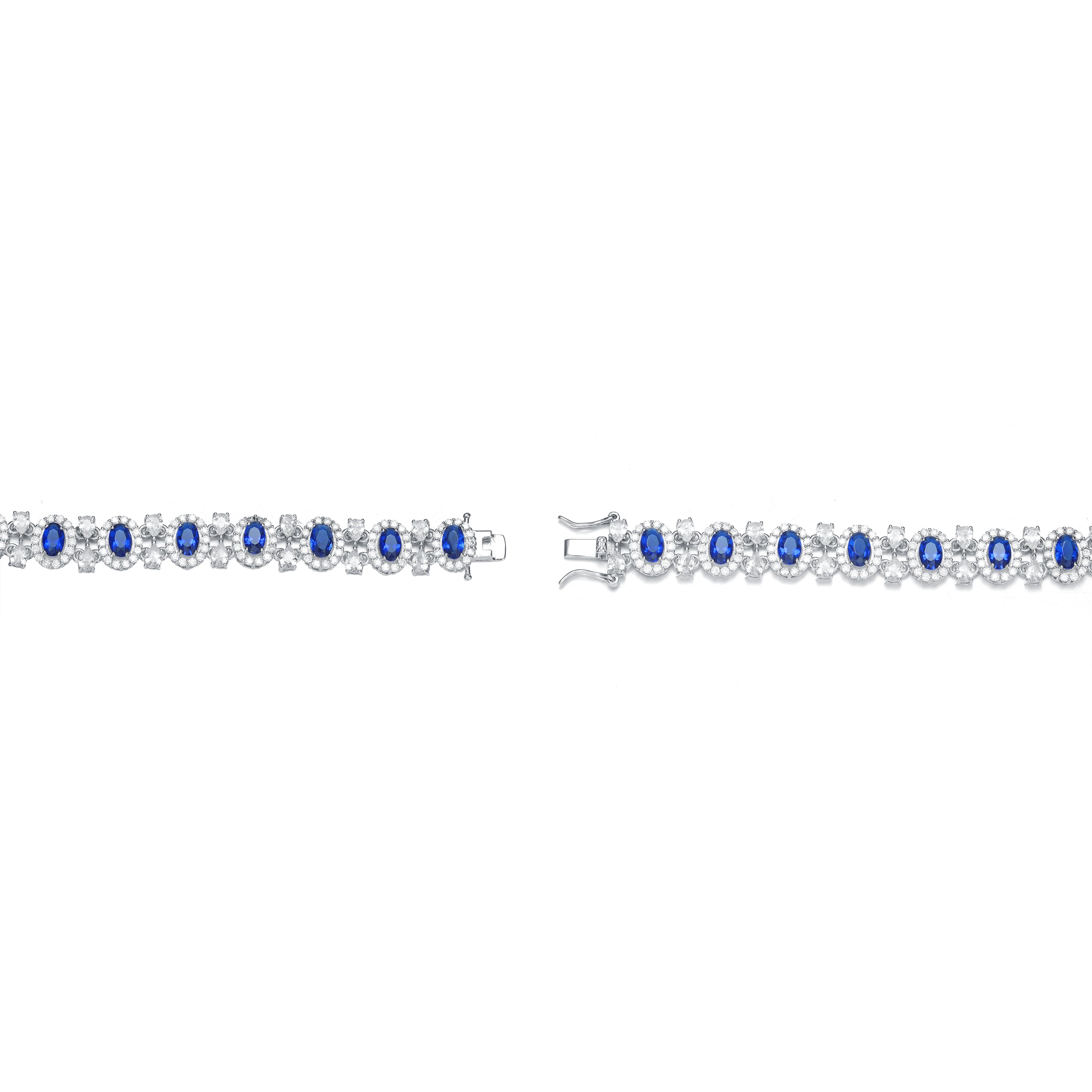 This striking bracelet features a bold contrast of brilliant clear cubic zirconia paired with rich sapphire-blue center stones on each link. Expertly crafted in sterling silver with a sleek rhodium-plated finish, it delivers a bright, icy shimmer in every variation. Available in White, Blue, and Green options.