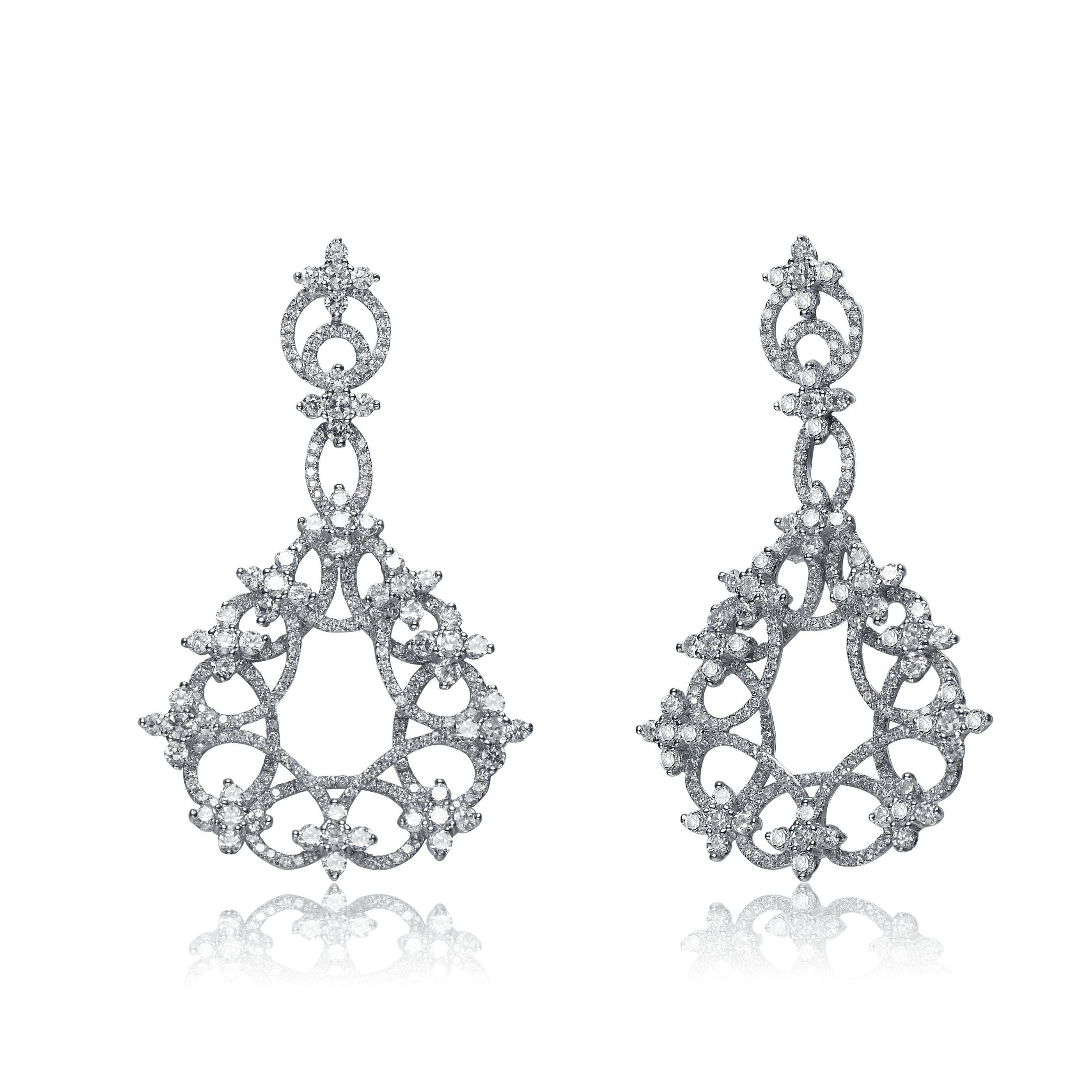 These fancy dangling earrings are decorated with white round-cut cubic zirconia stones creating flower designs. Crafted of .925 sterling silver, the earrings secure with butterfly clasps.