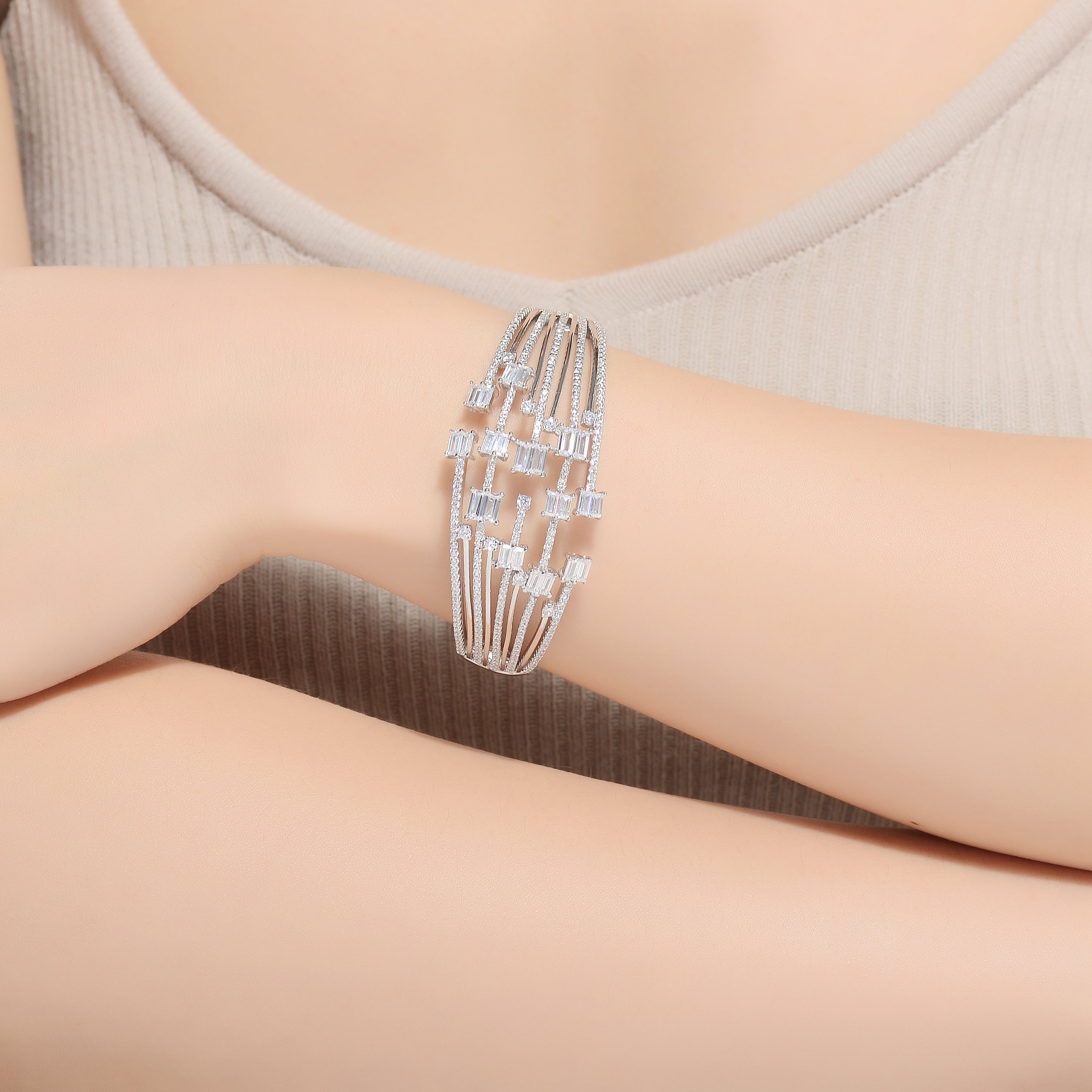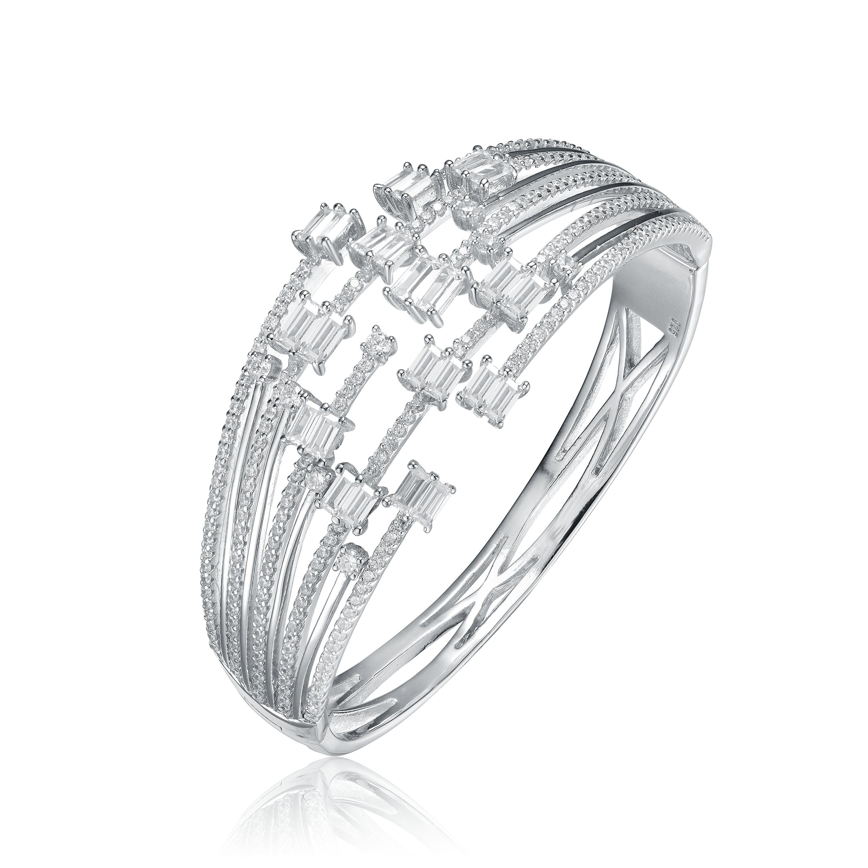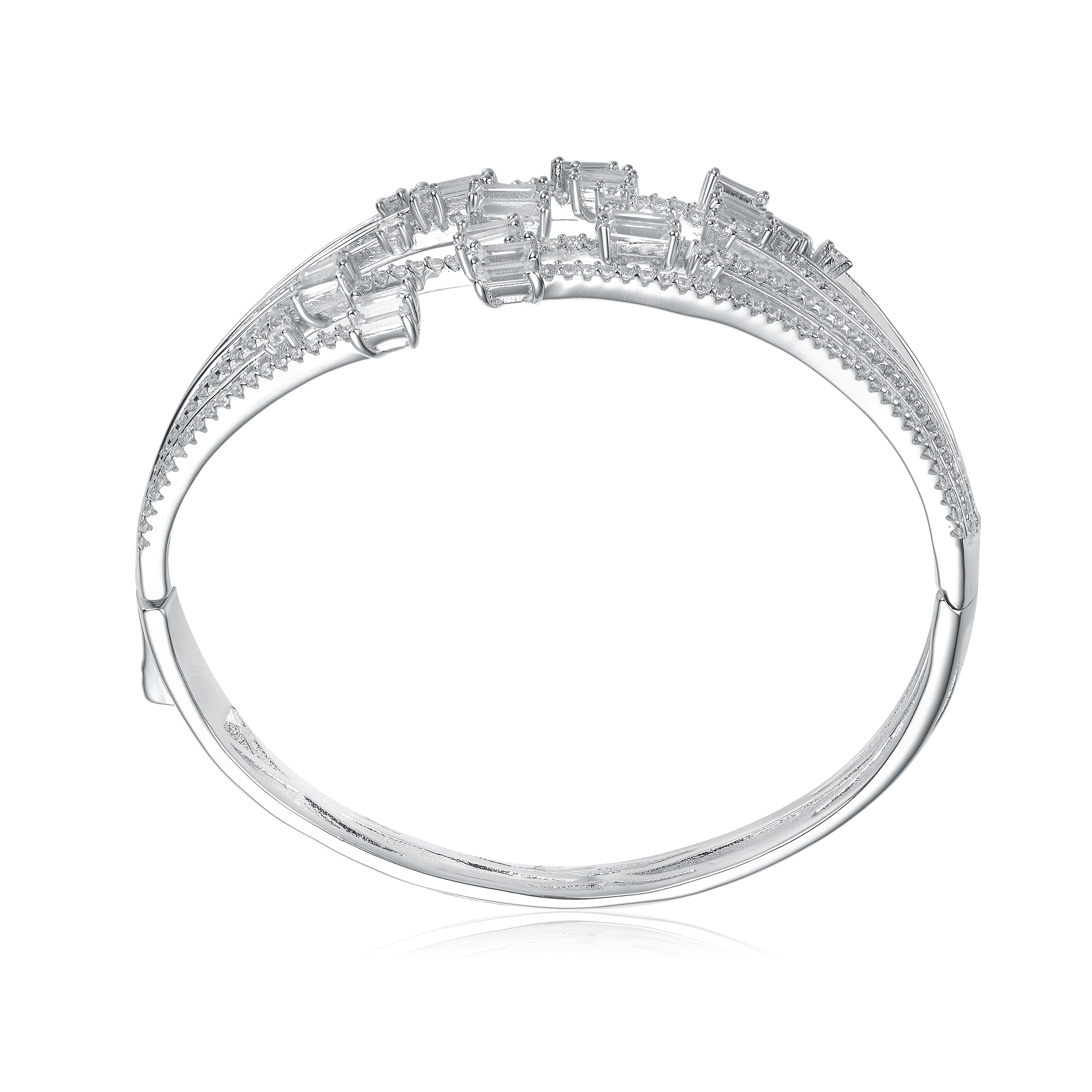 This wide sterling silver bangle features multiple rows of white cubic zirconia with a square accent stone, creating a bold and sophisticated look.